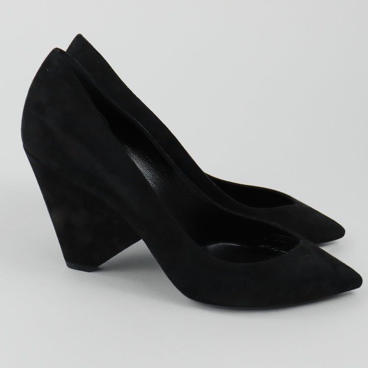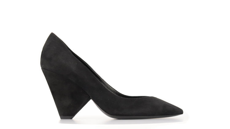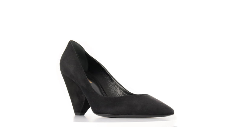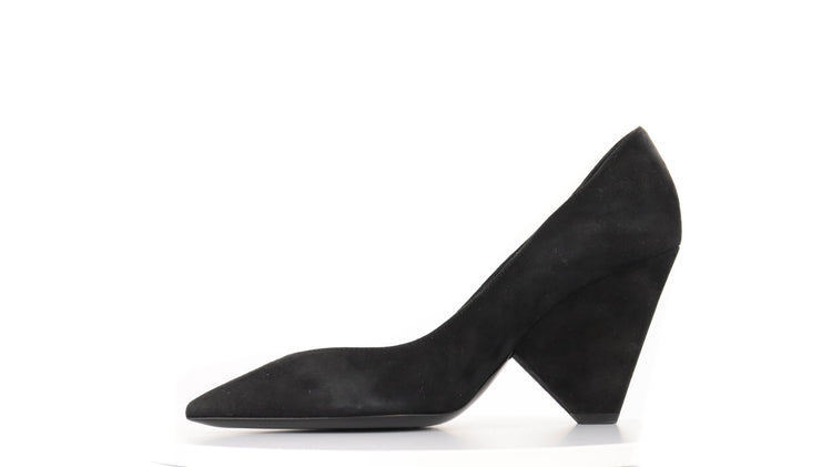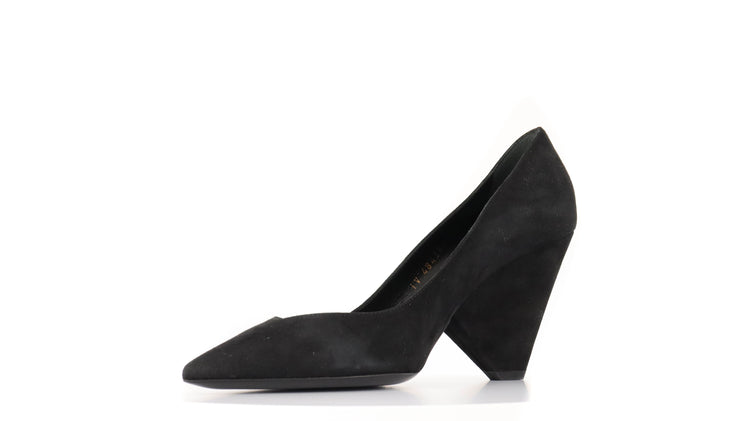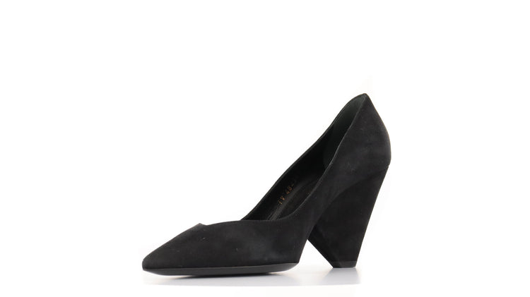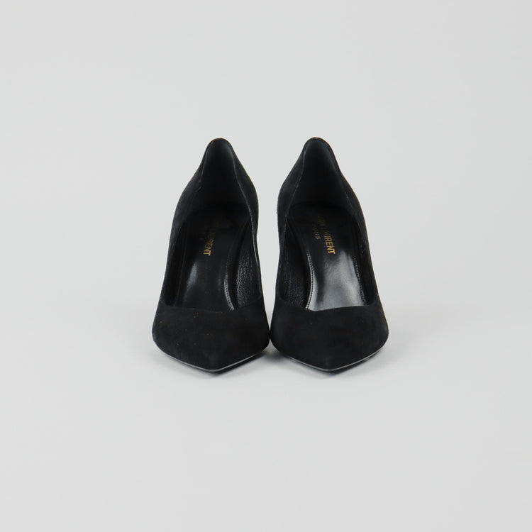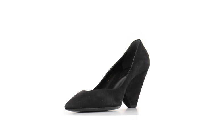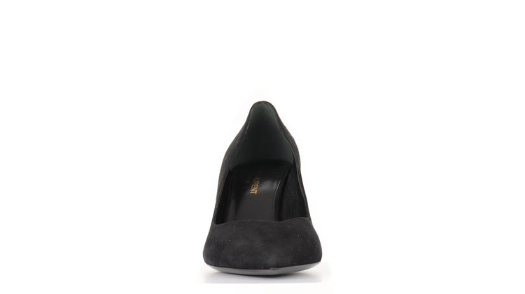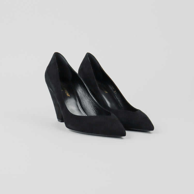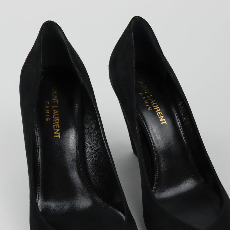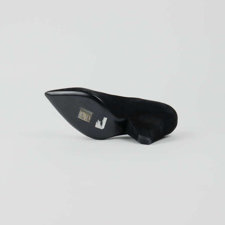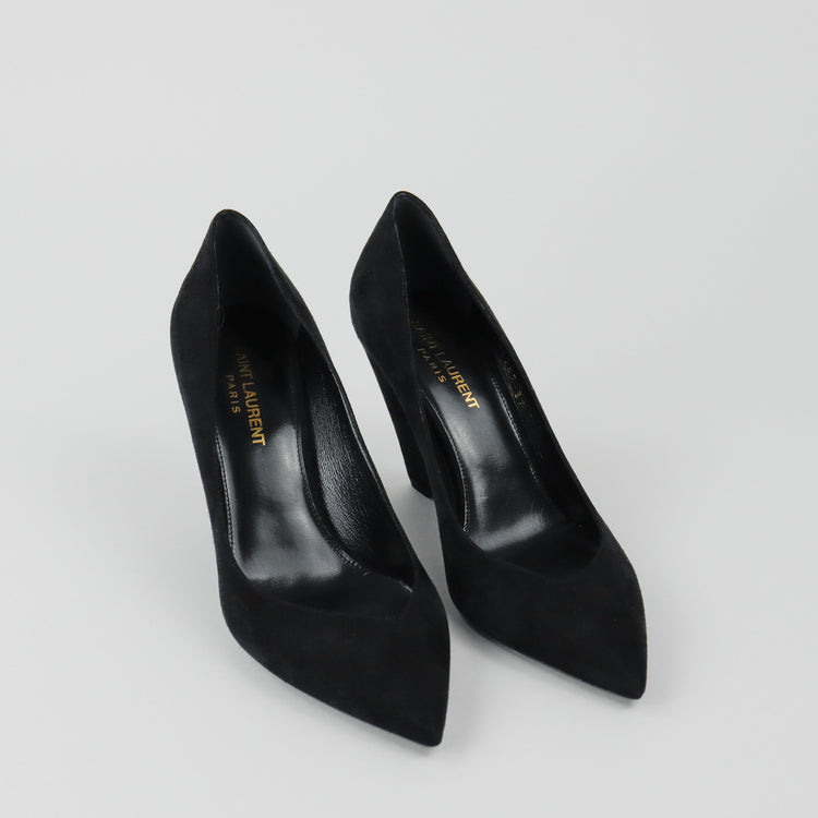 Zapatos de tacón Yves Saint Laurent elaborados en gamuza negra, puntera en V cerrada, el tacón es en forma de trapecio.