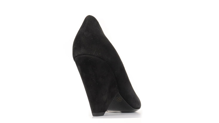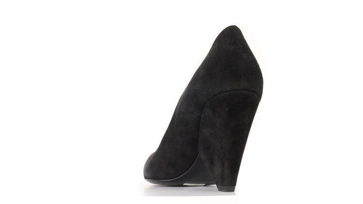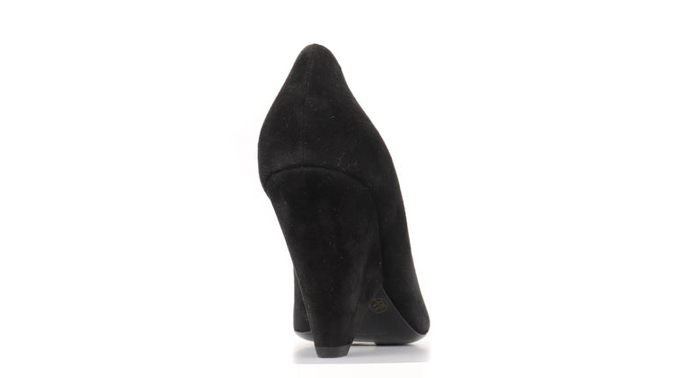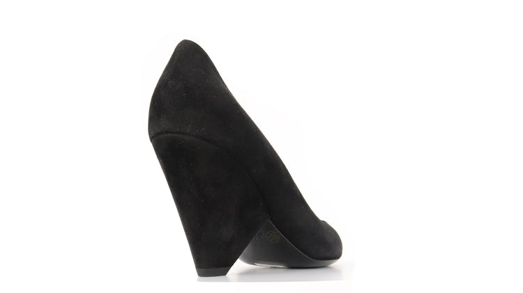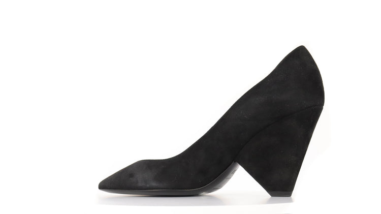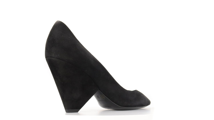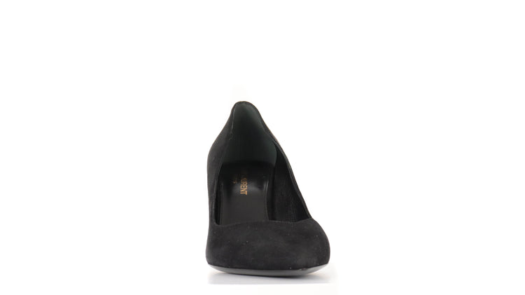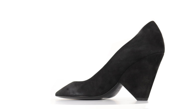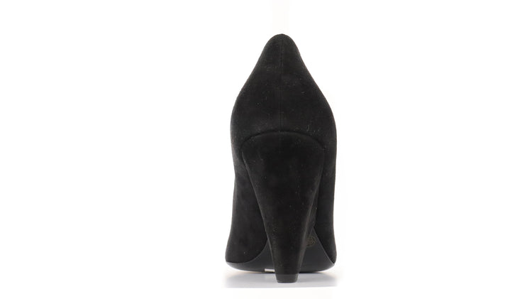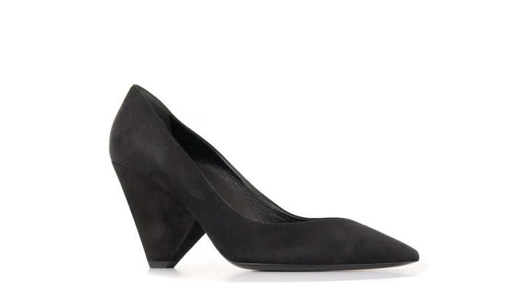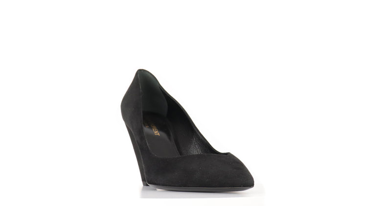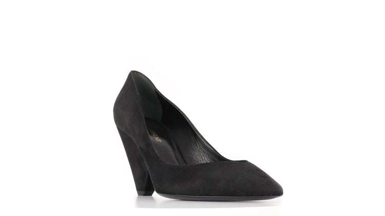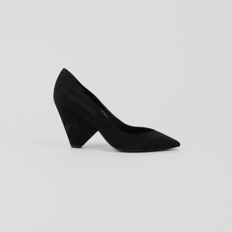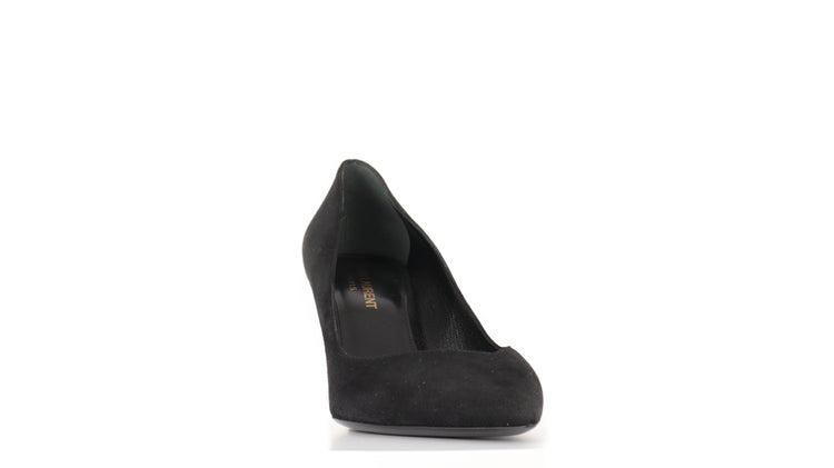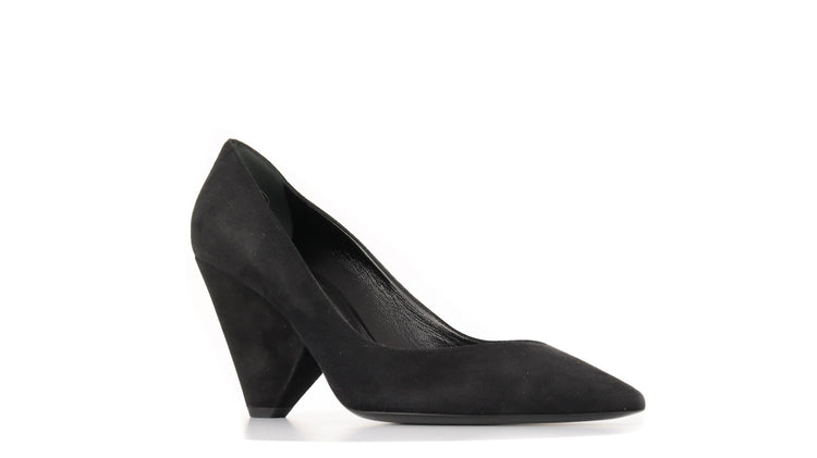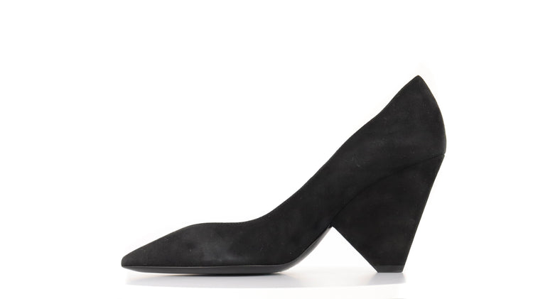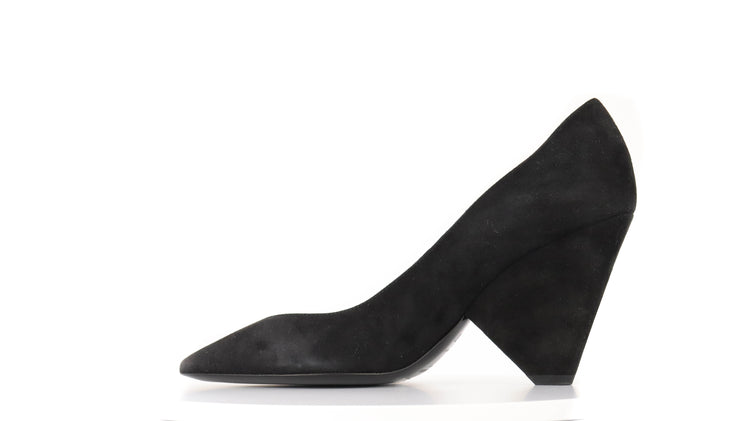 Zapatos de tacón Yves Saint Laurent elaborados en gamuza negra, puntera en V cerrada, el tacón es en forma de trapecio.