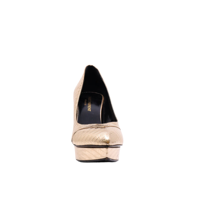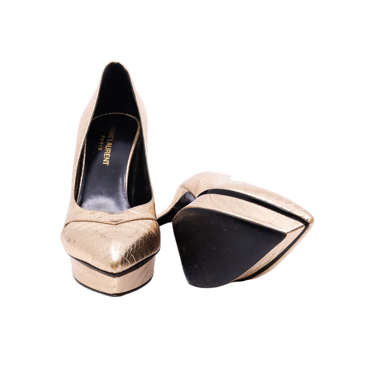 Tacones con plataforma de la marca Yves Saint Laurent de la línea Janis, en piel metalizada tipo lagarto en color dorado, tacón stiletto, con puntera en V, detalles por uso regular.