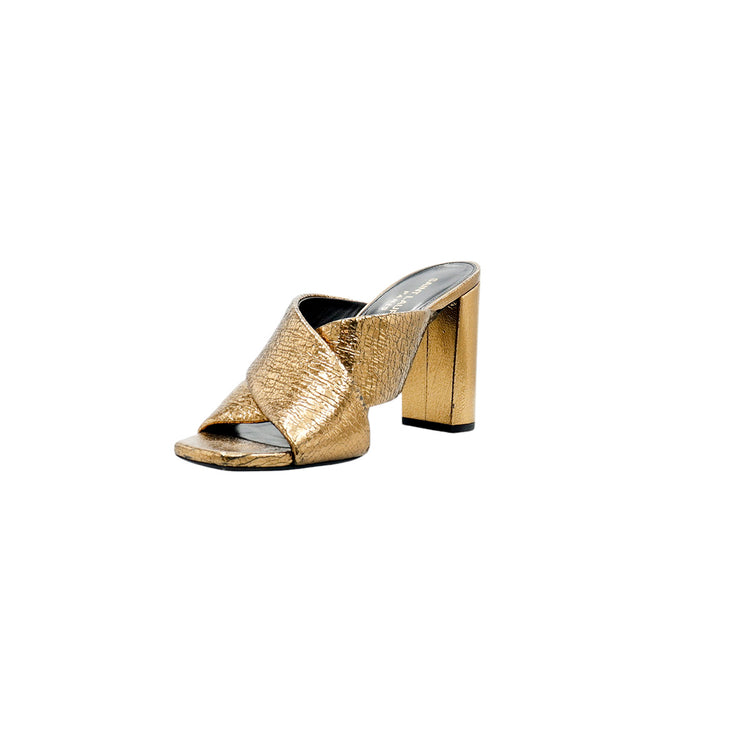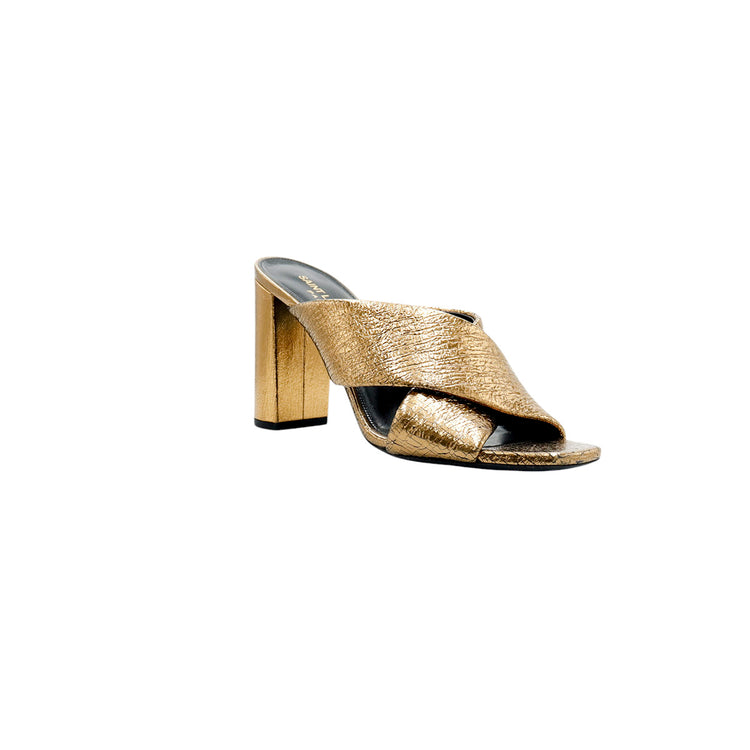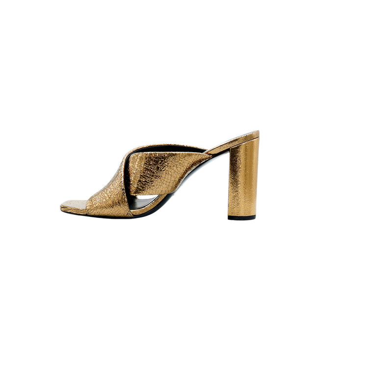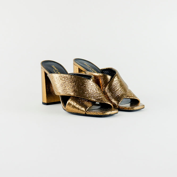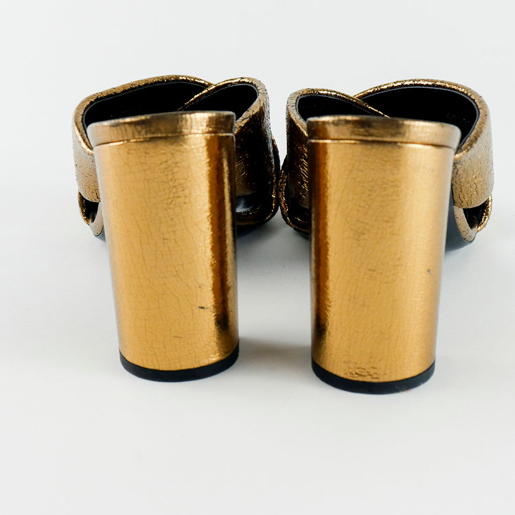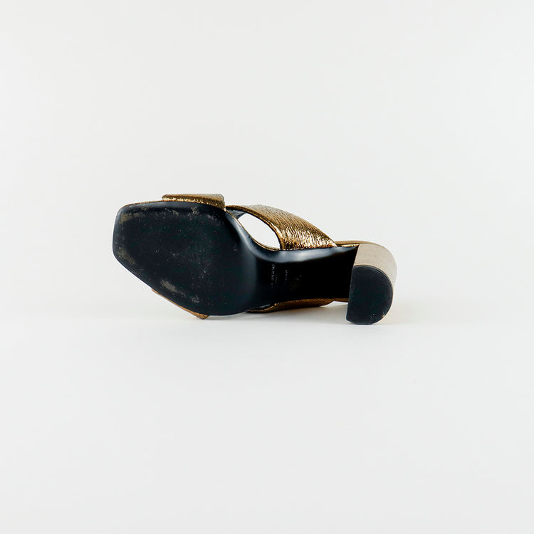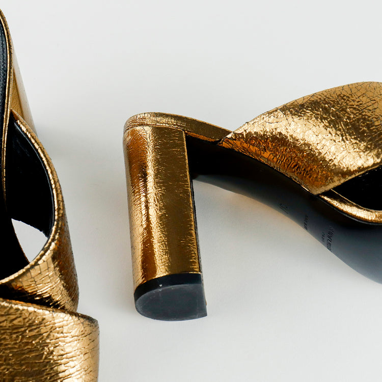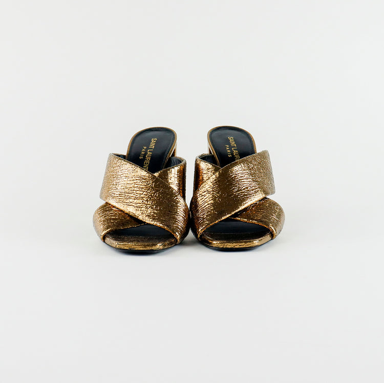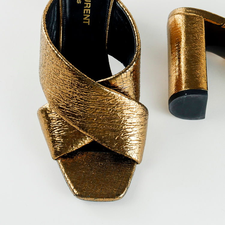 Sandalias destalonadas Yves Saint Laurent, confeccionadas en piel metalizada tipo craquelada color bronce con líneas cruzadas al empeine, desgaste por uso regular.