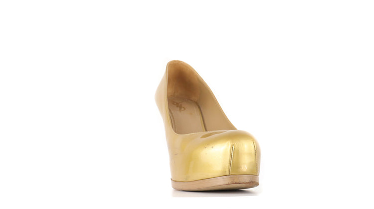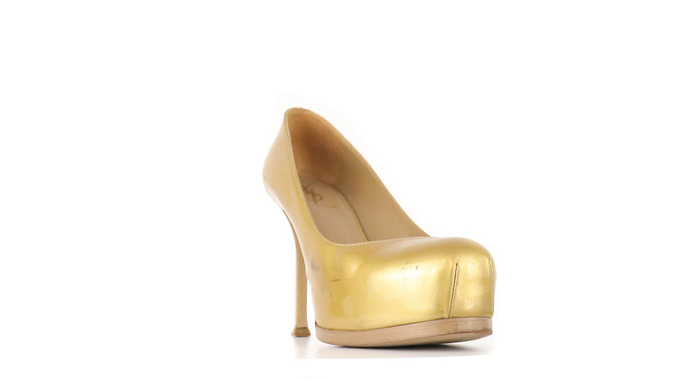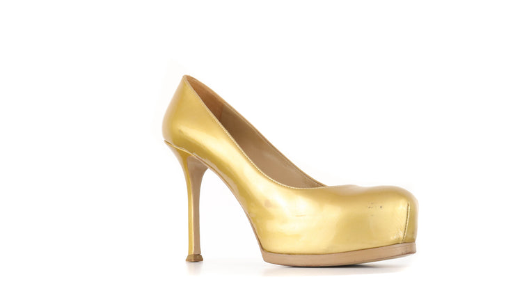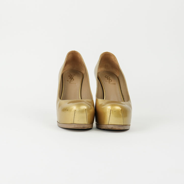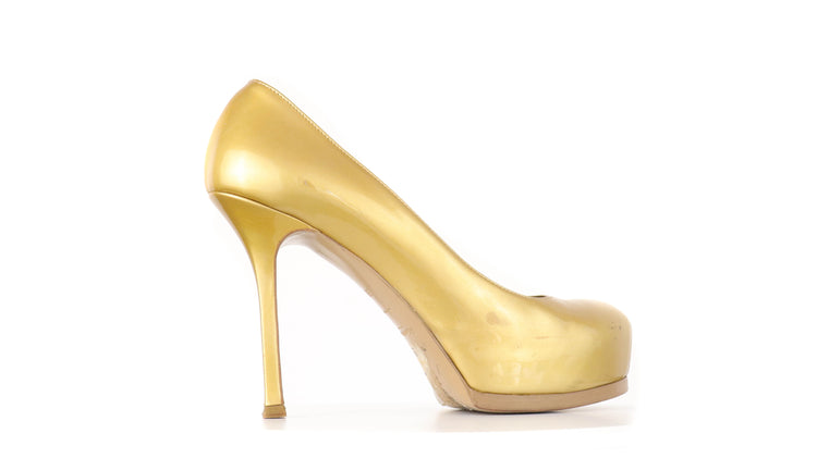 Zapatillas de tacón marca Yves Saint Laurent, confeccionados en piel color dorado, puntera redonda cerrada en el estilo característico de la marca, tacón stiletto y estilo slip-on.