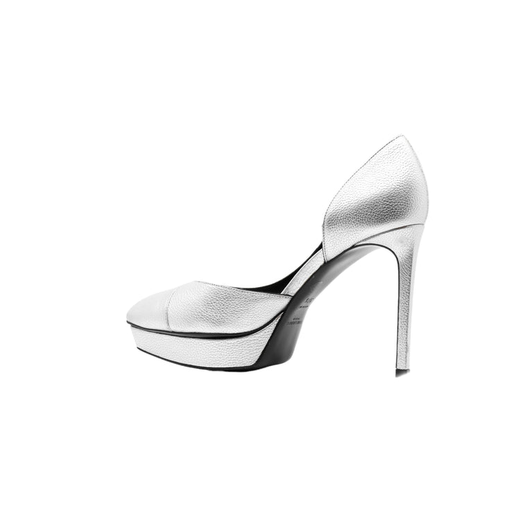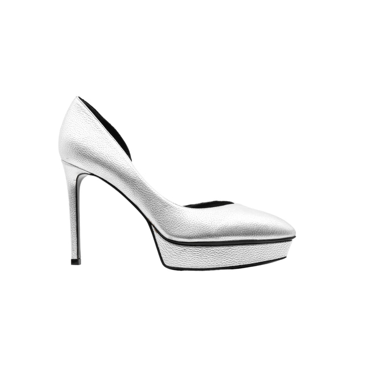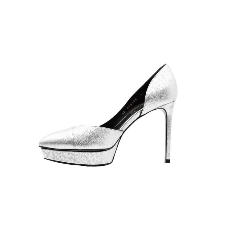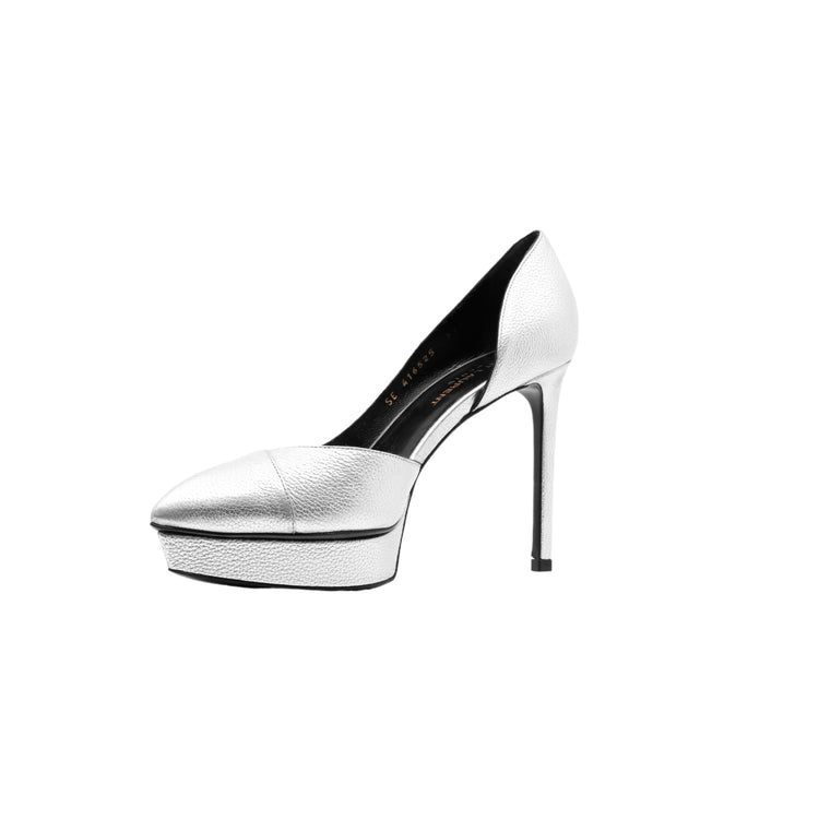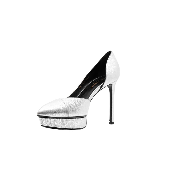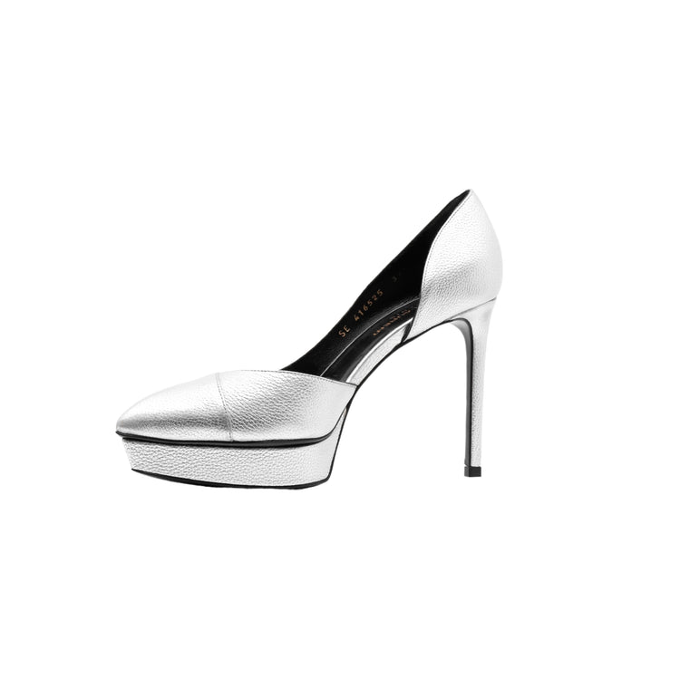 Tacones con plataforma de la marca Yves Saint Laurent de la línea D'Orsay Half, en piel metalizada color plata, tacón stiletto, con puntera en V, detalles por uso regular.