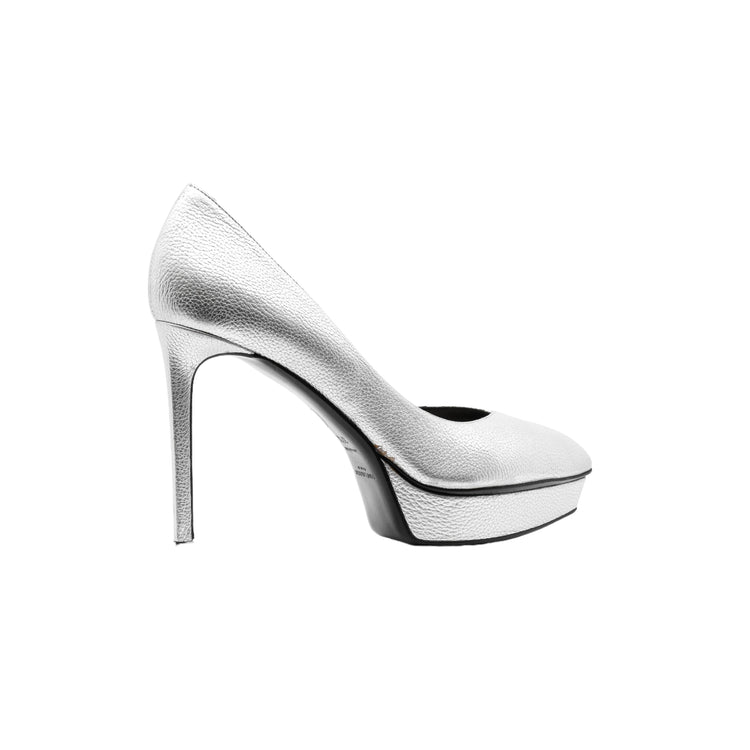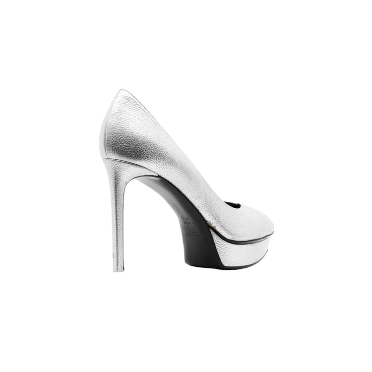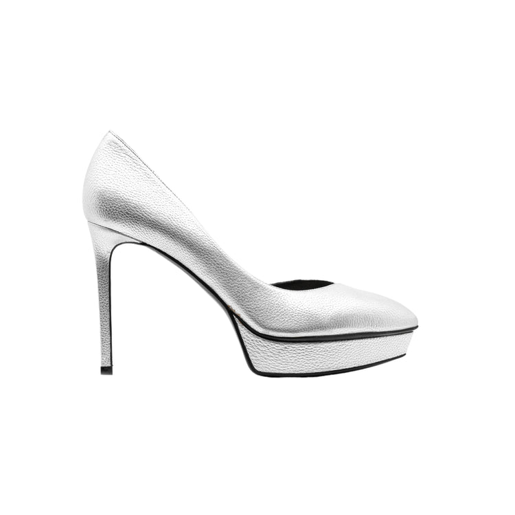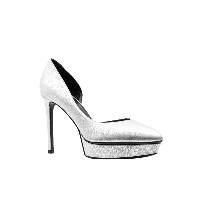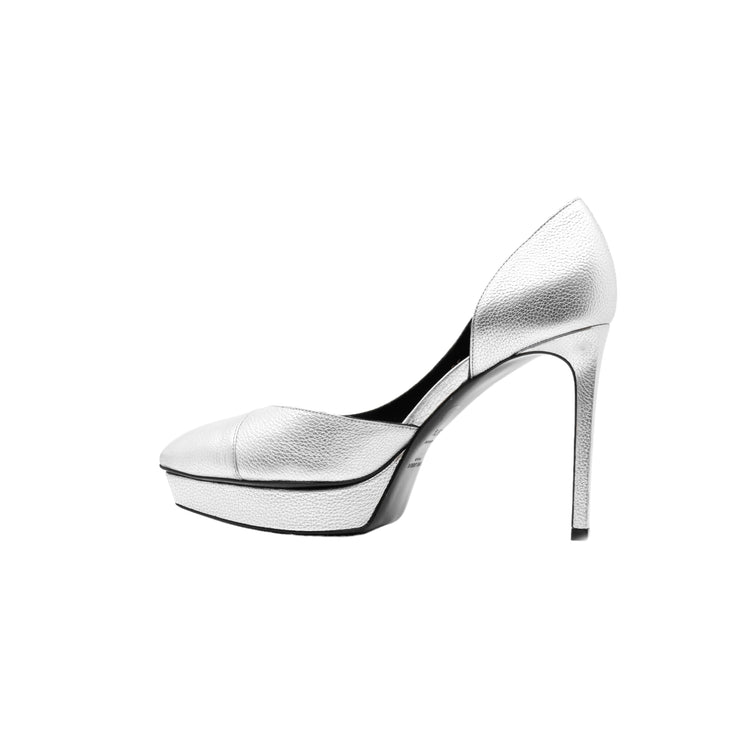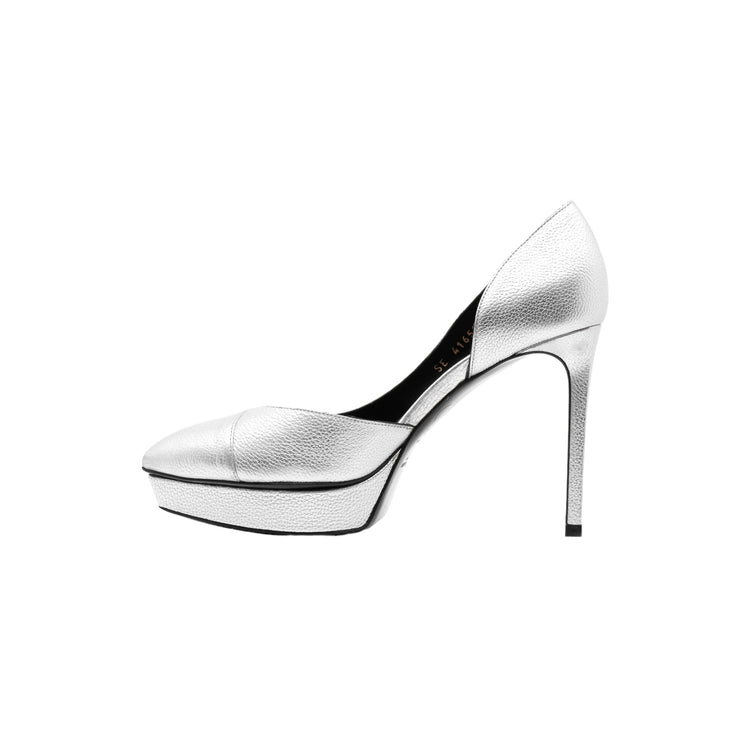 Tacones con plataforma de la marca Yves Saint Laurent de la línea D'Orsay Half, en piel metalizada color plata, tacón stiletto, con puntera en V, detalles por uso regular.