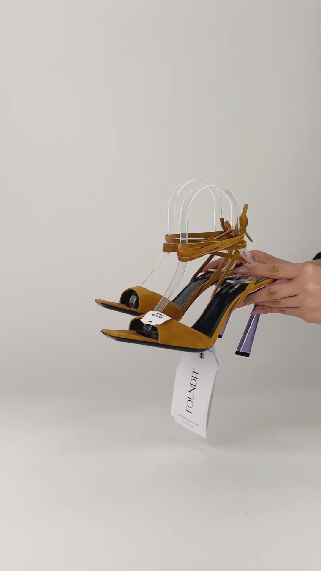 Tacones Yves Saint Laurent Paz 105 en gamuza color café, con cintas entrelazadas al tobillo y tacón metálico. Un diseño elegante y femenino.
