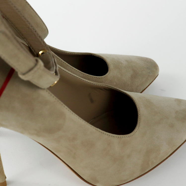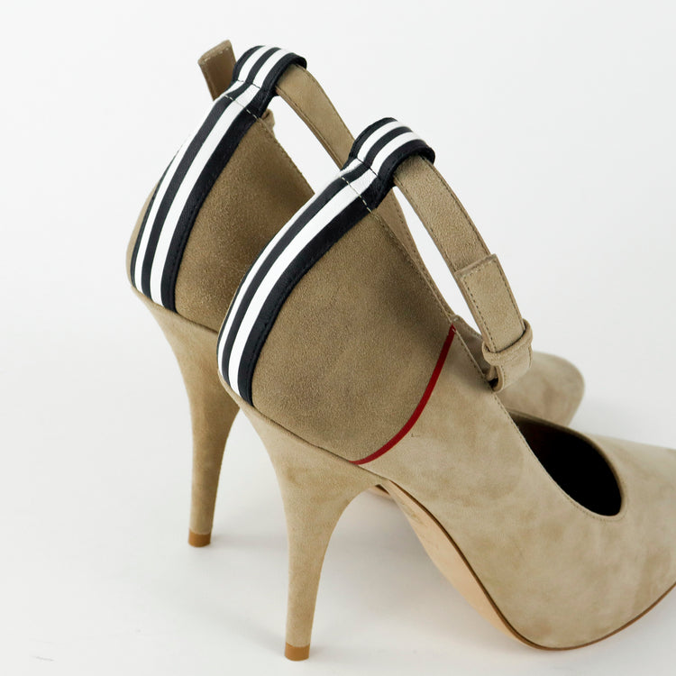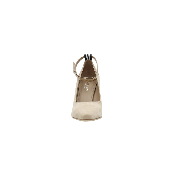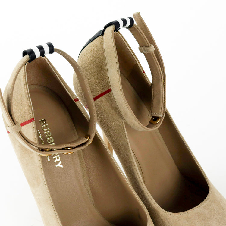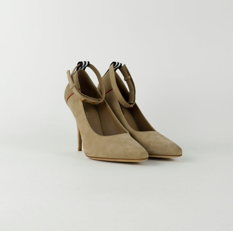 Zapatos de tacón marca Burberry, confeccionados en ante color arena, con pulsera de ajuste al tobillo y punta semi redonda.