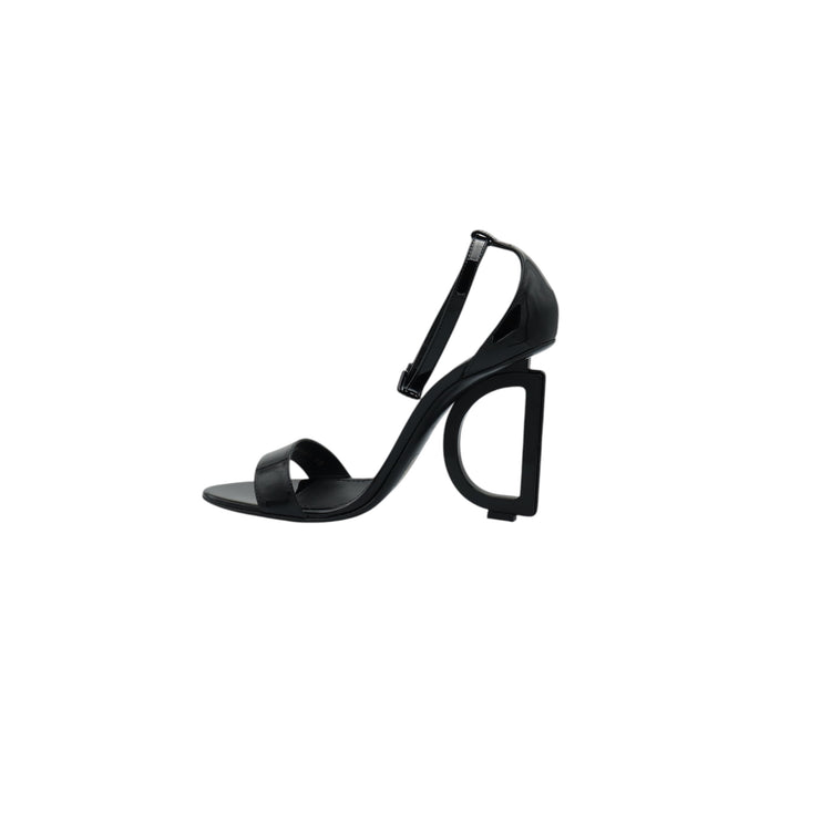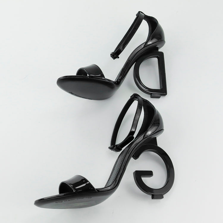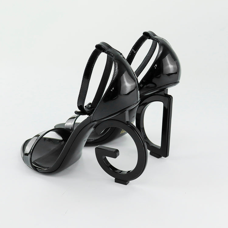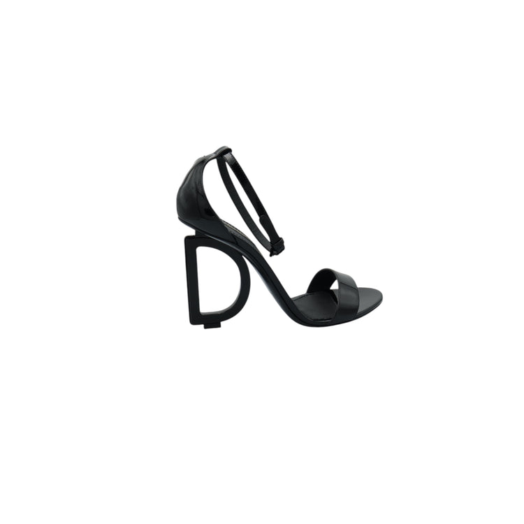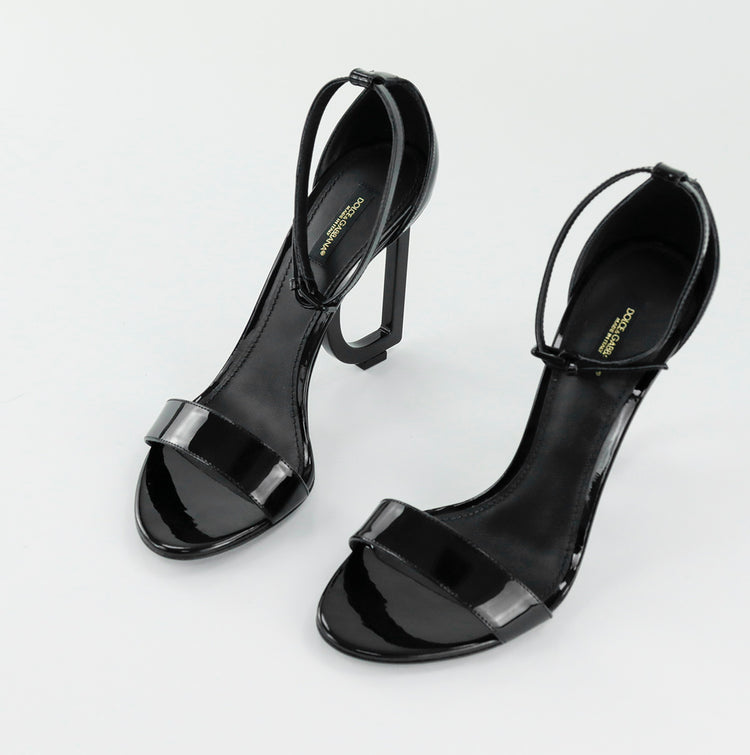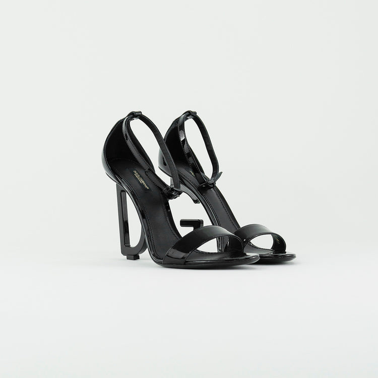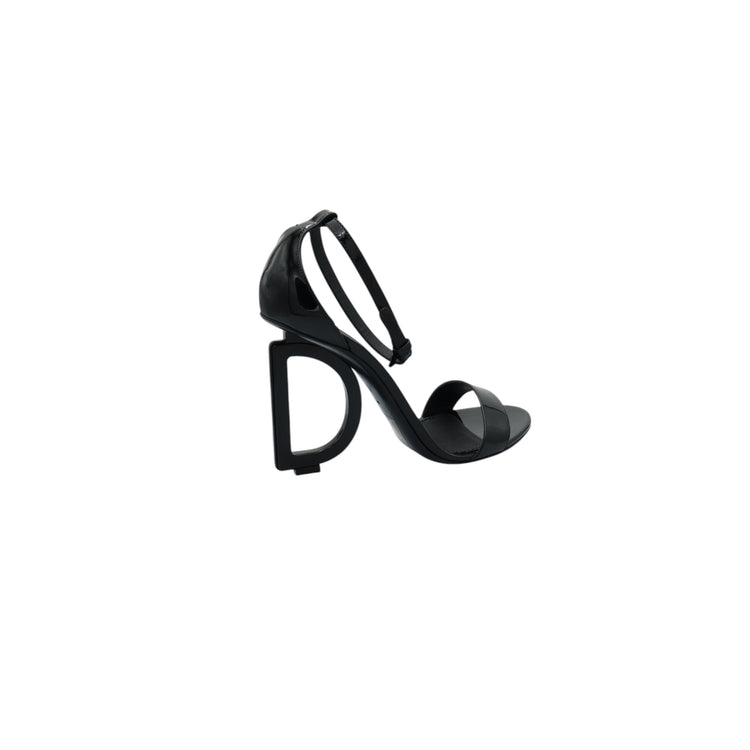 Sandalias de tacón Dolce & Gabbana, línea Keira, confeccionadas en piel con charol color negro, tacón estilizado con las iniciales de la marca DG, pulsera de ajuste al tobillo.