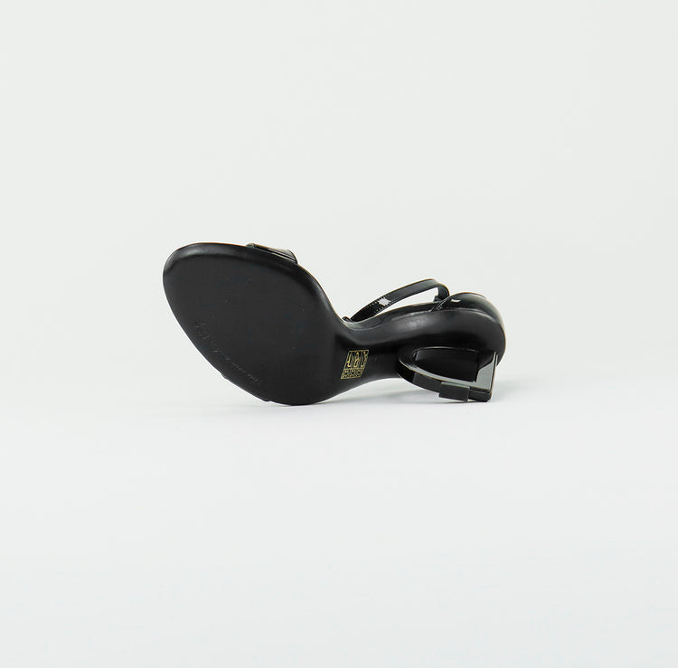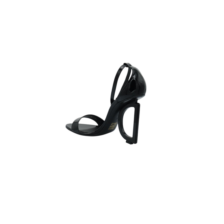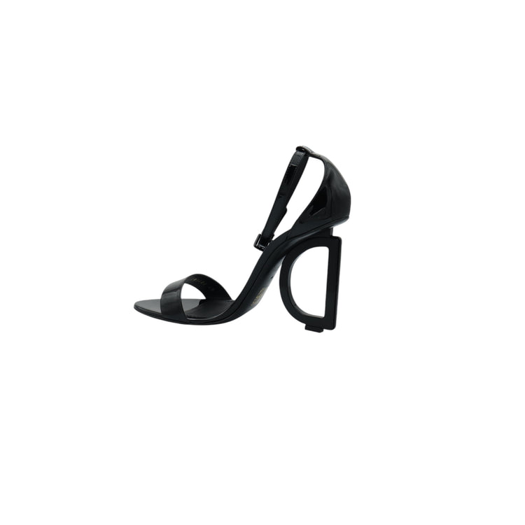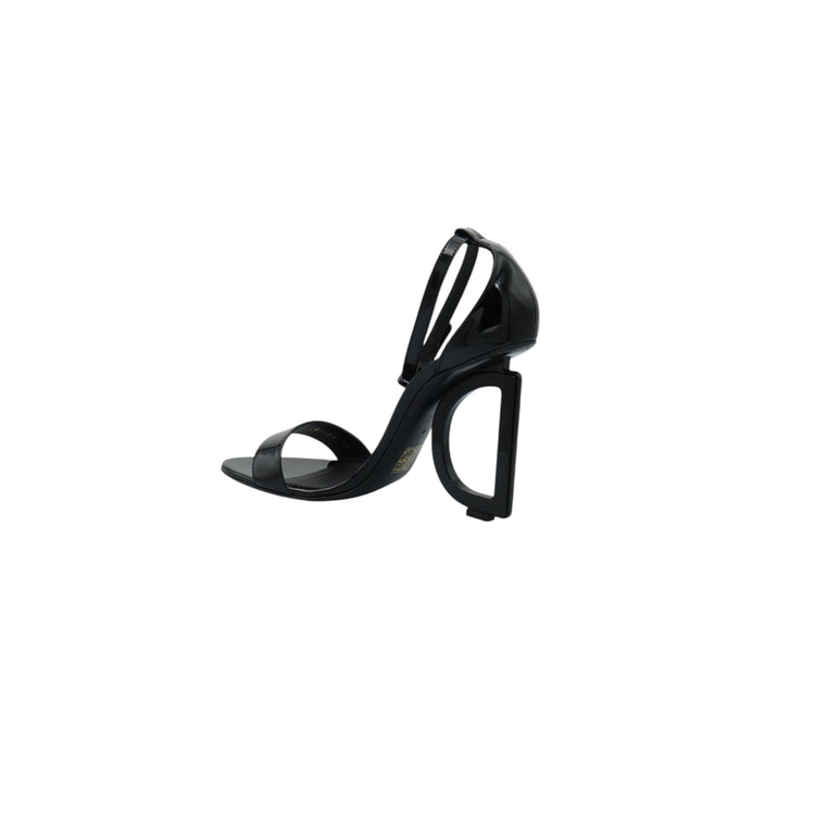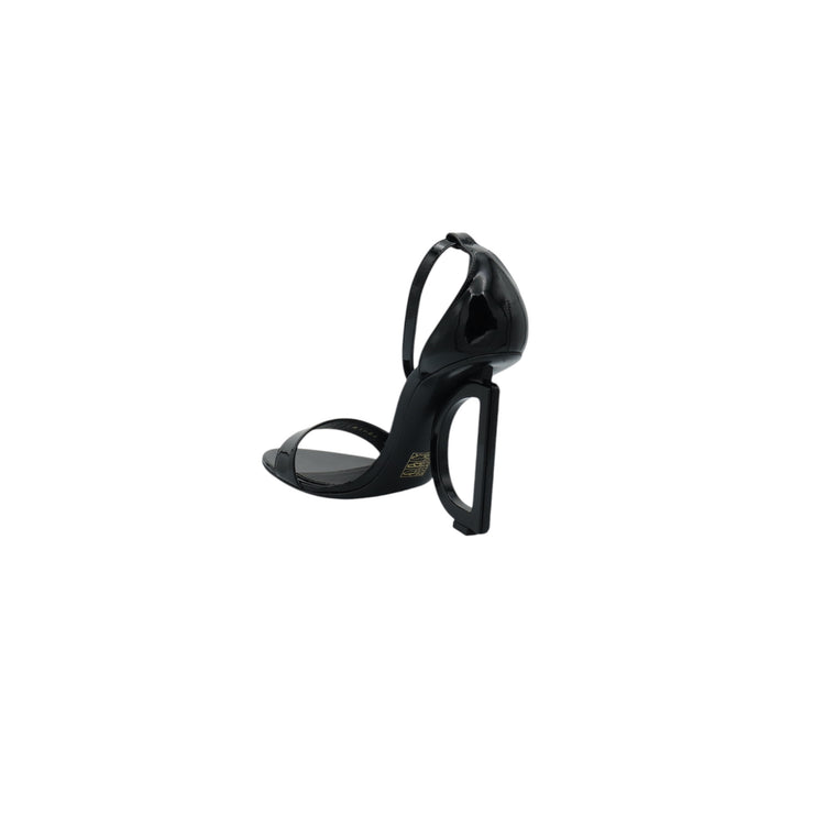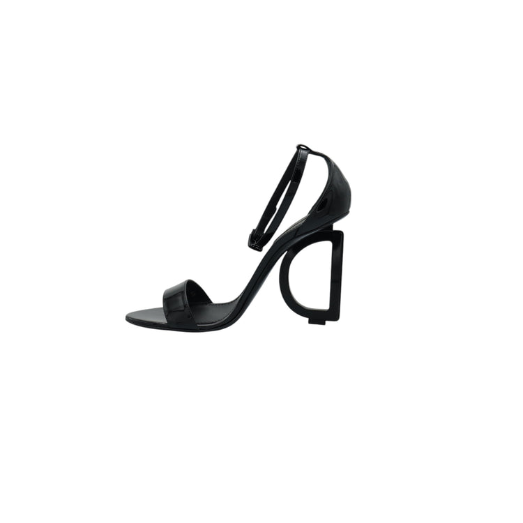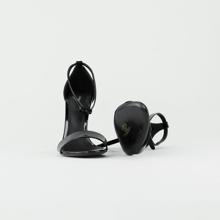 Sandalias de tacón Dolce & Gabbana, línea Keira, confeccionadas en piel con charol color negro, tacón estilizado con las iniciales de la marca DG, pulsera de ajuste al tobillo.
