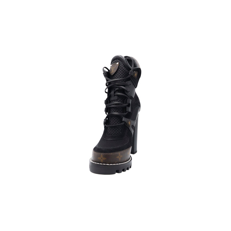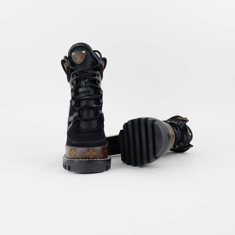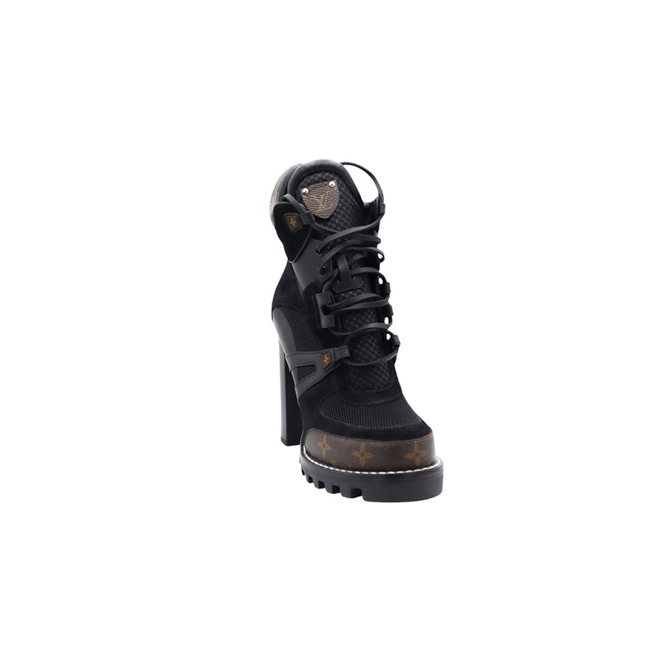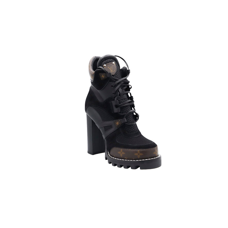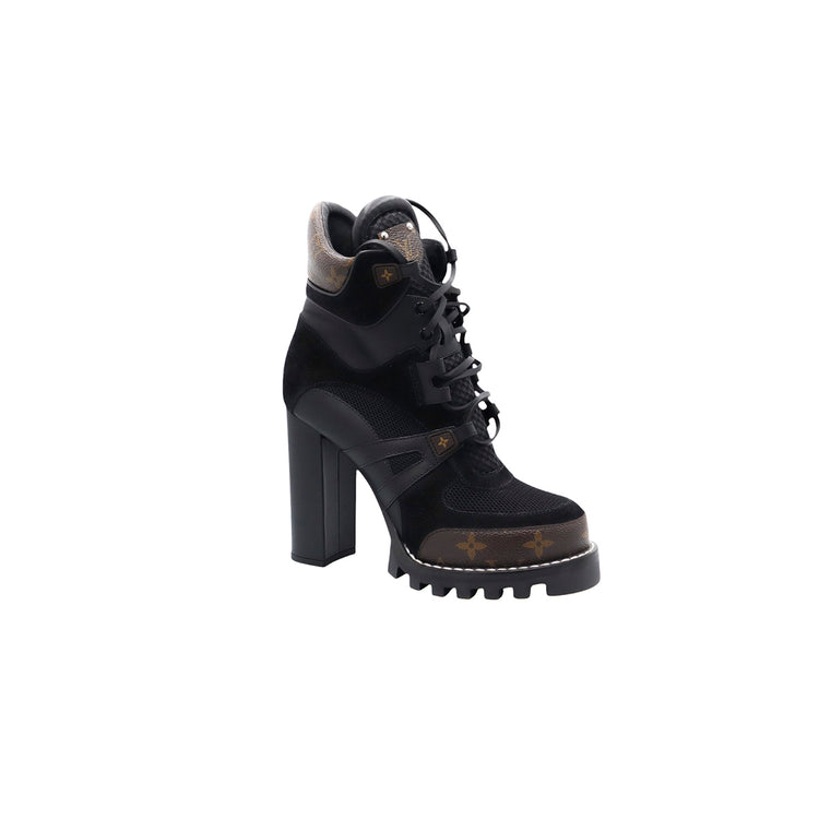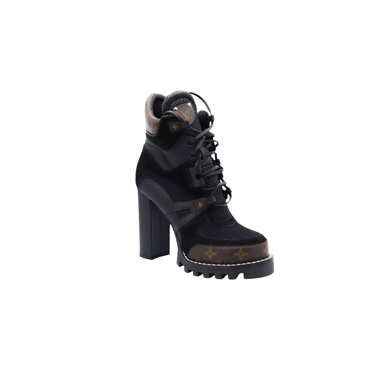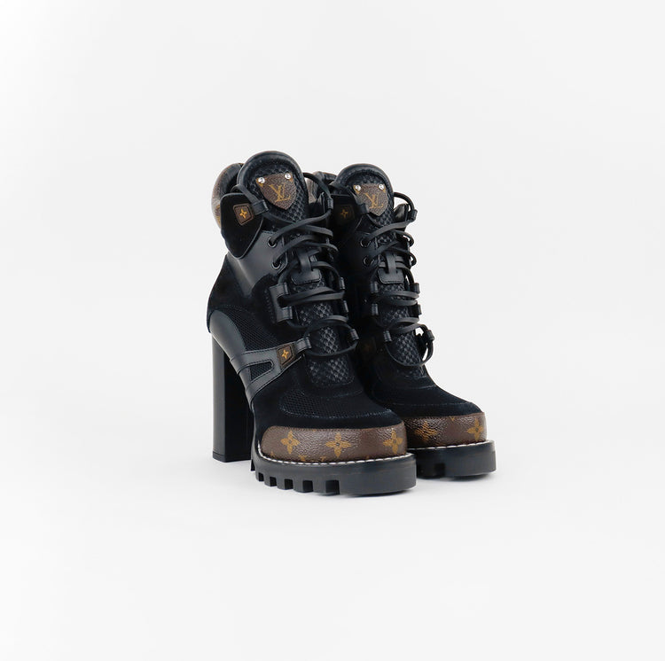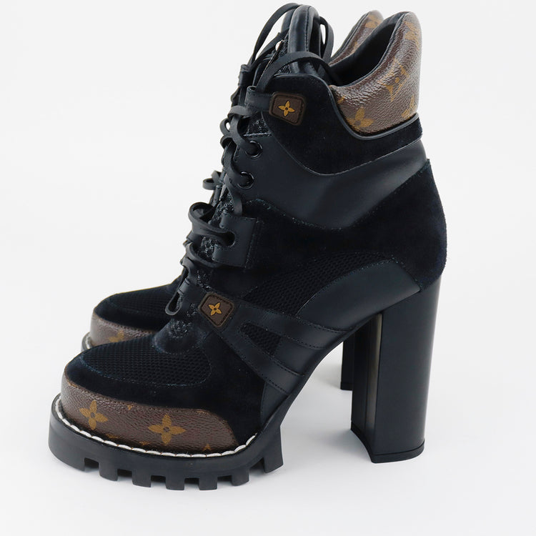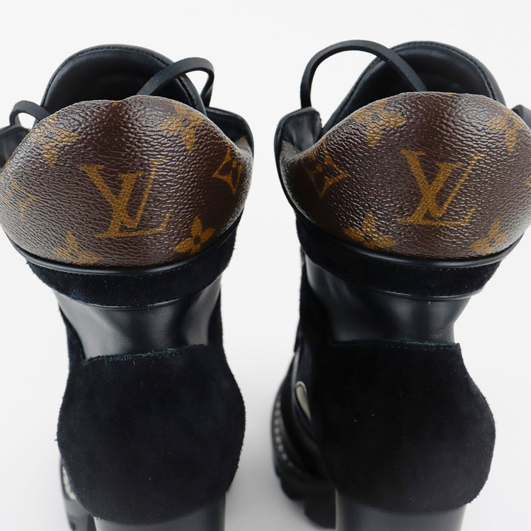 Botines Louis Vuitton de la línea Star Trail, confeccionados en lona monogram y ante con piel de becerro color negro con empeine en poliuretano, con cuello acolchado y cordones de ajuste en cuero, prácticamente nuevos.