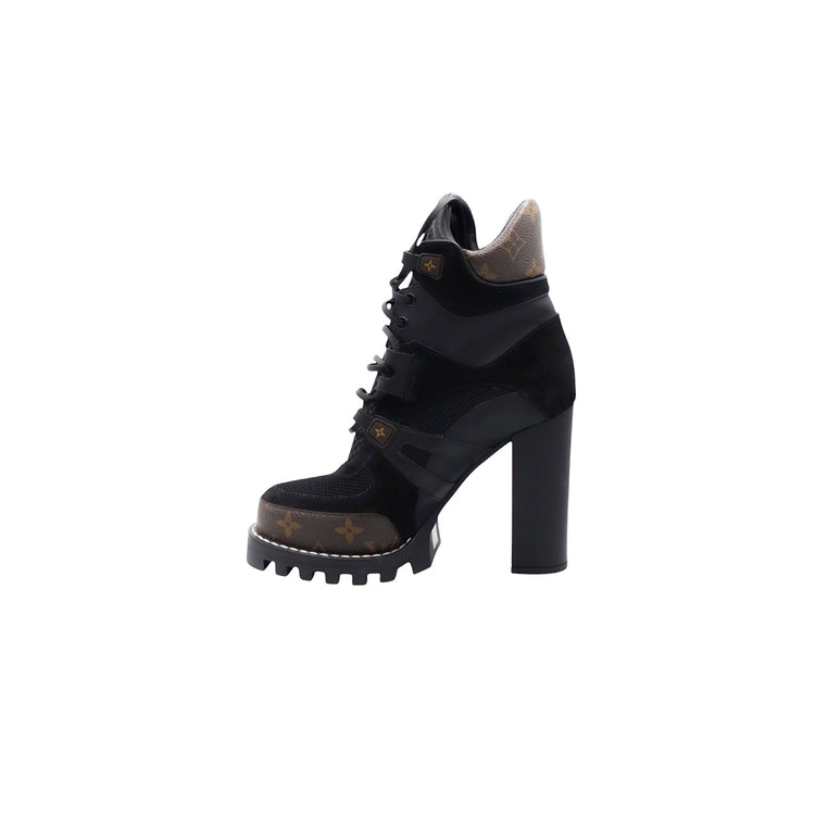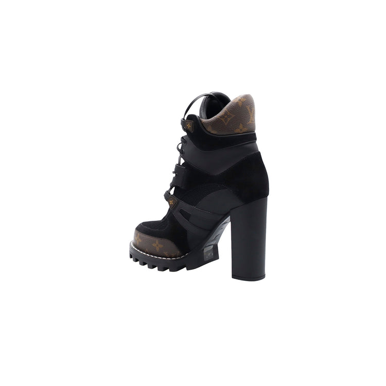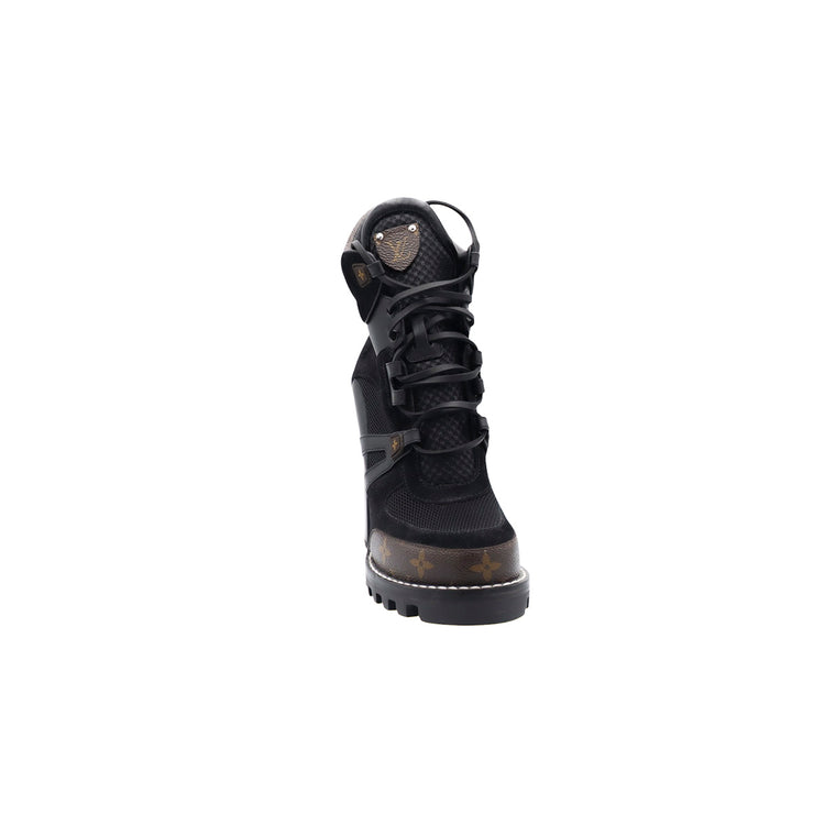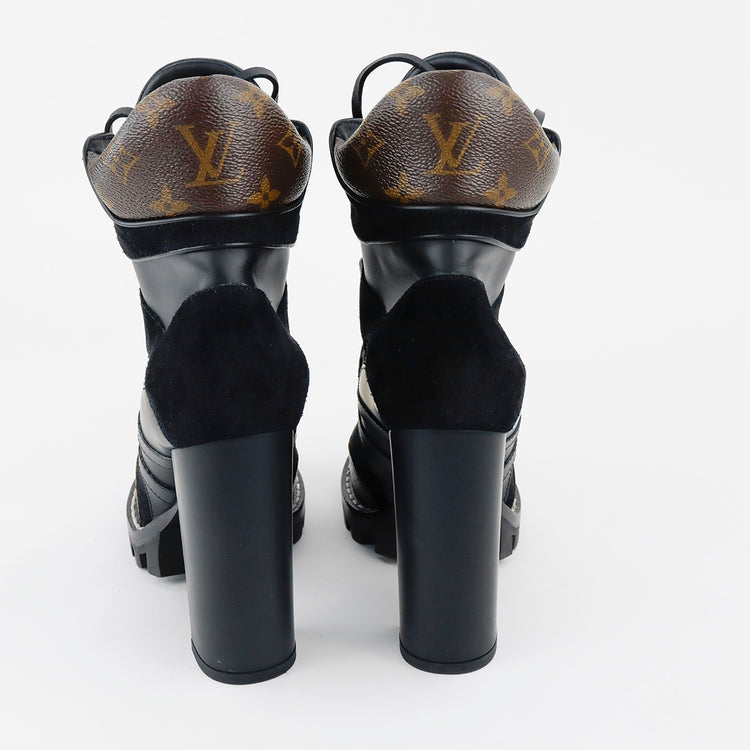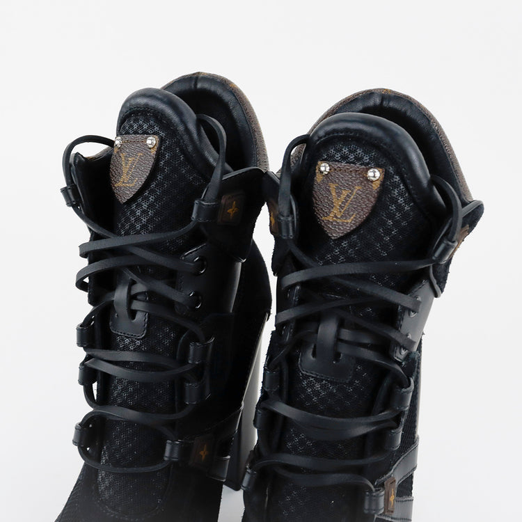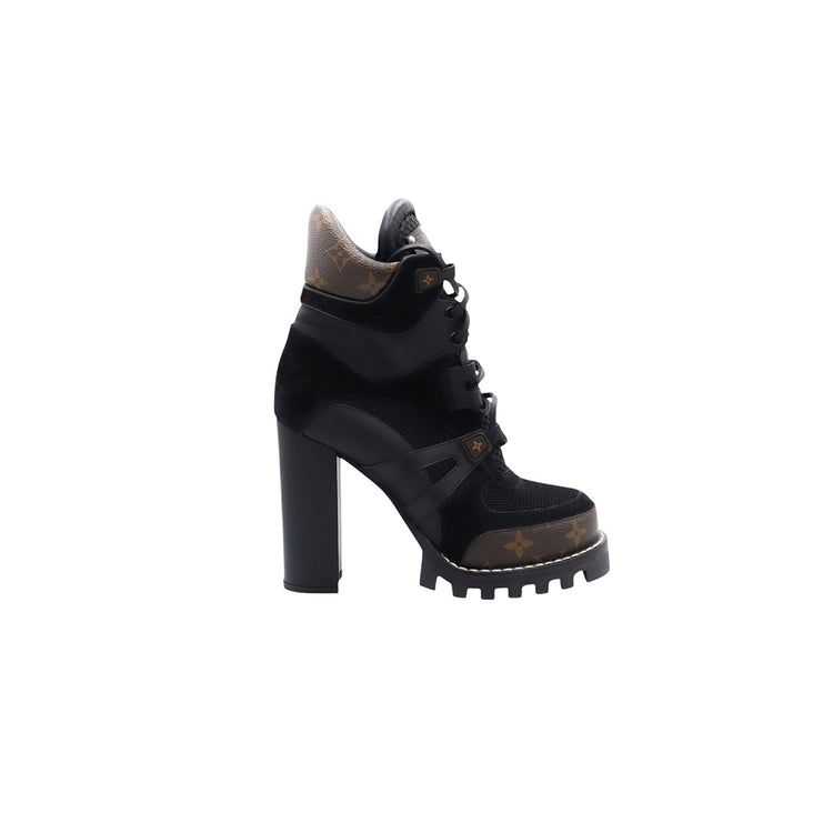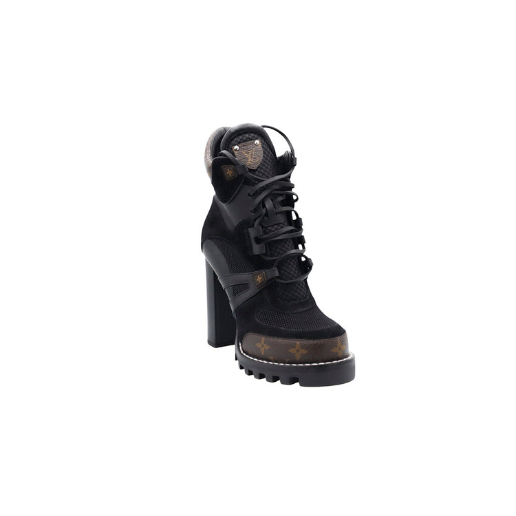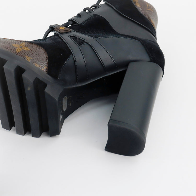 Botines Louis Vuitton de la línea Star Trail, confeccionados en lona monogram y ante con piel de becerro color negro con empeine en poliuretano, con cuello acolchado y cordones de ajuste en cuero, prácticamente nuevos.