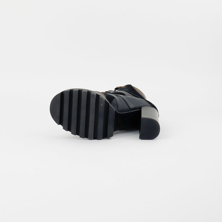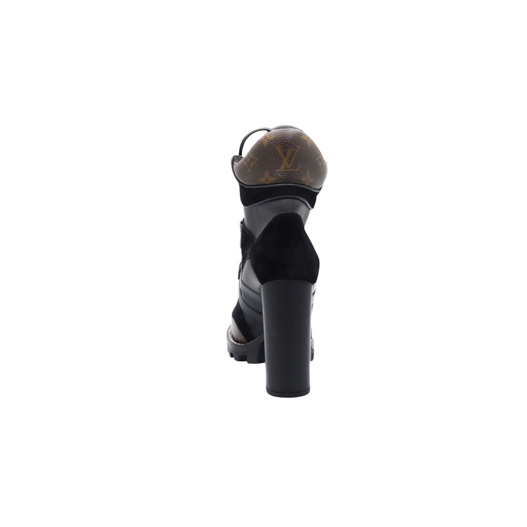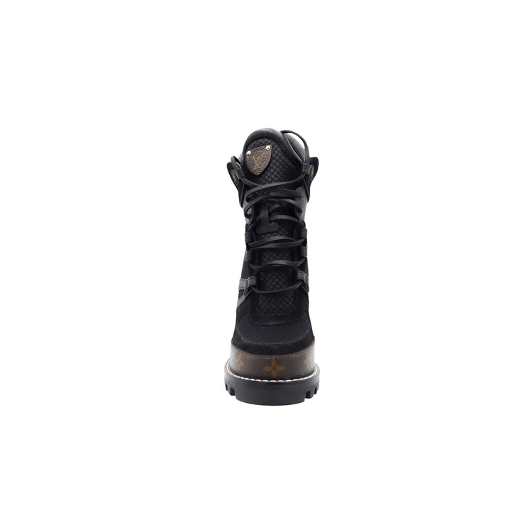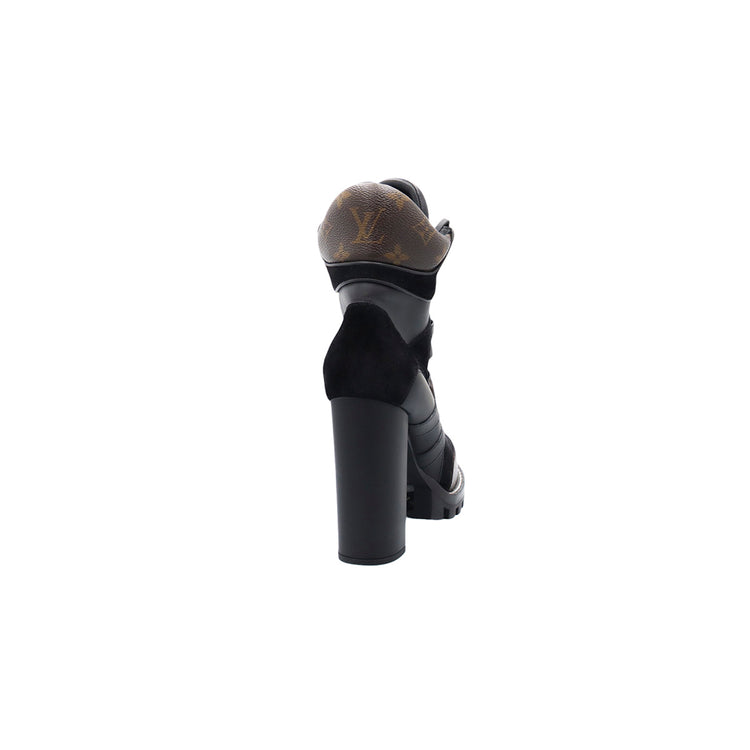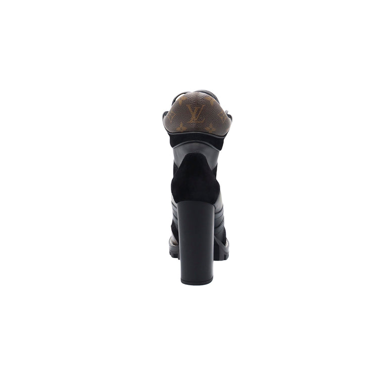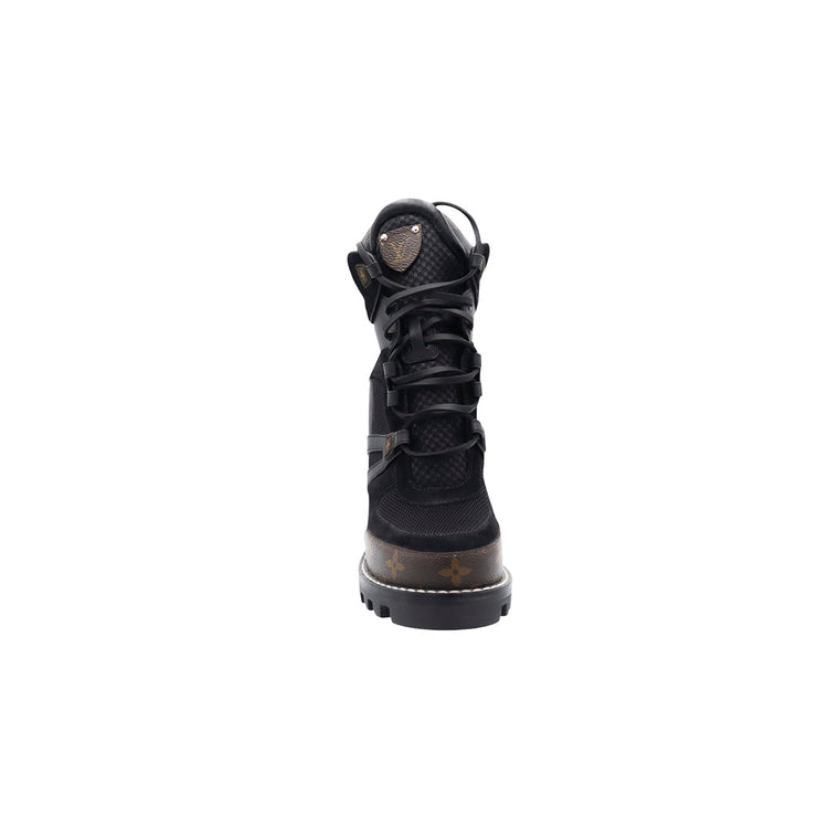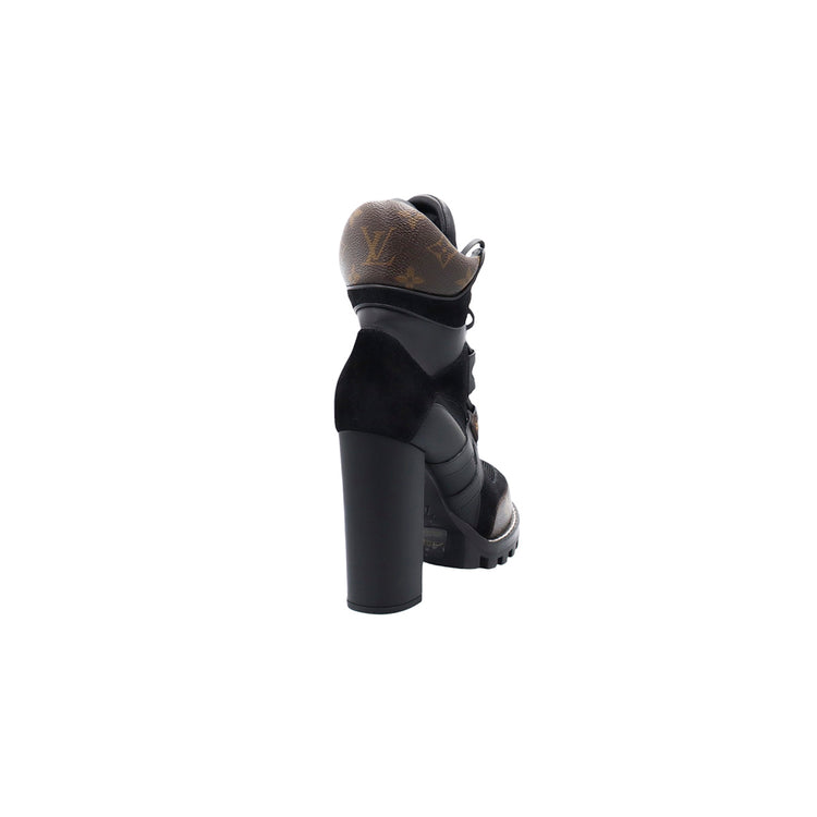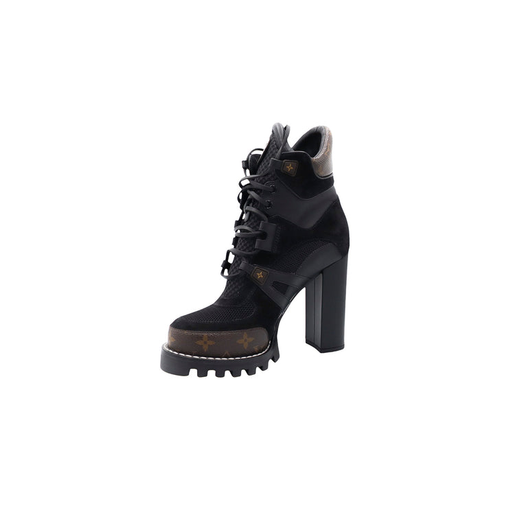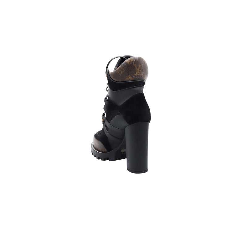 Botines Louis Vuitton de la línea Star Trail, confeccionados en lona monogram y ante con piel de becerro color negro con empeine en poliuretano, con cuello acolchado y cordones de ajuste en cuero, prácticamente nuevos.