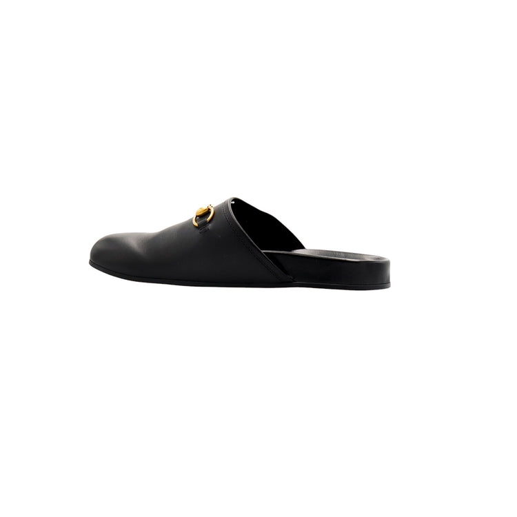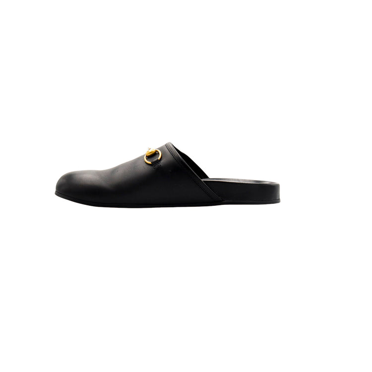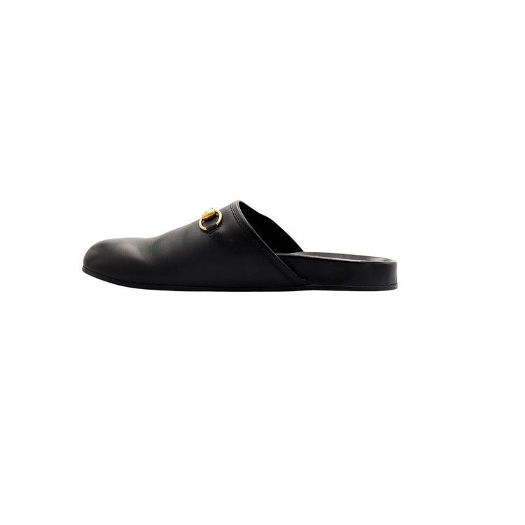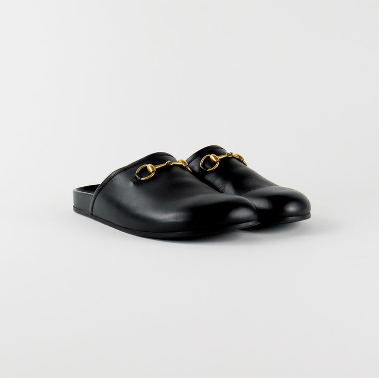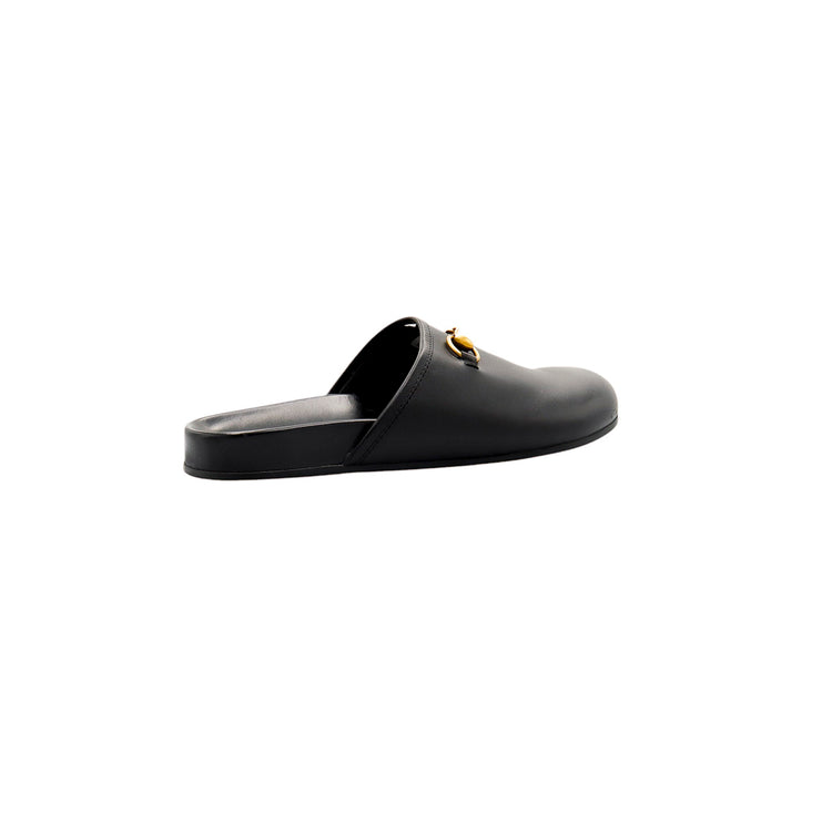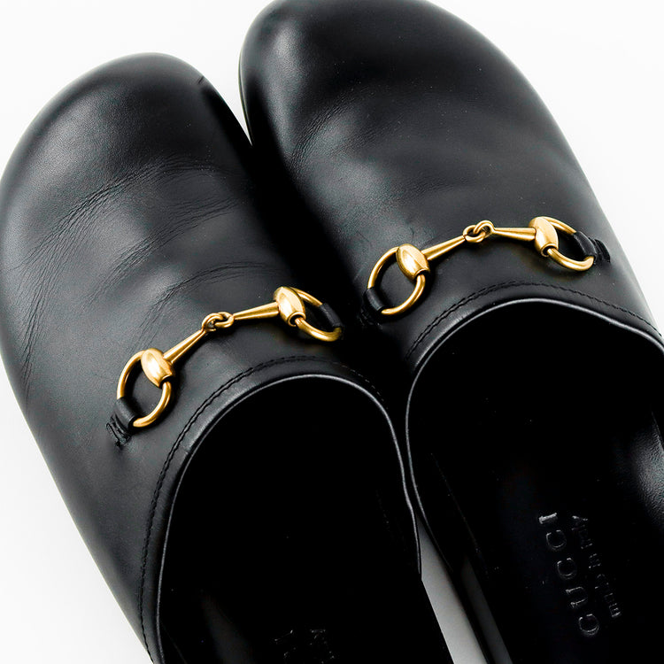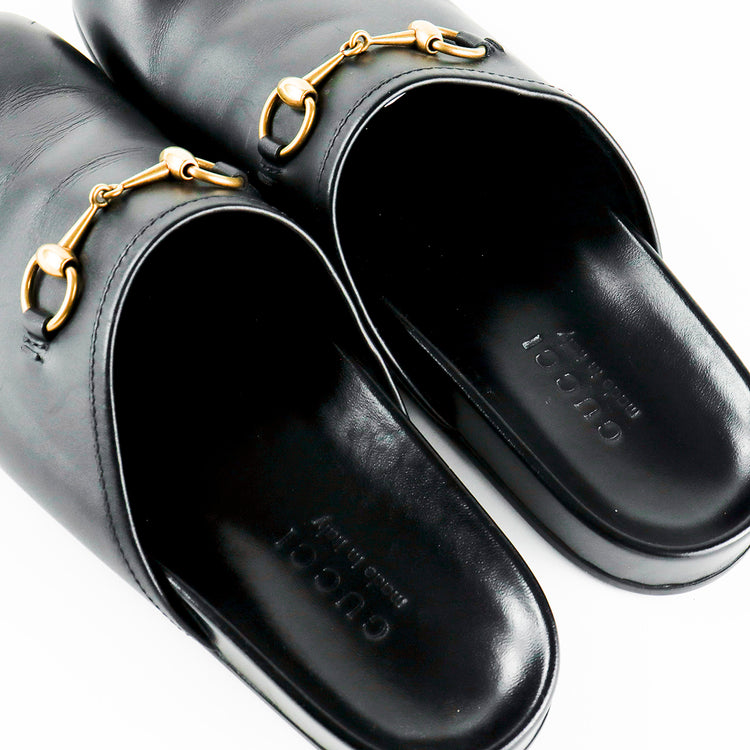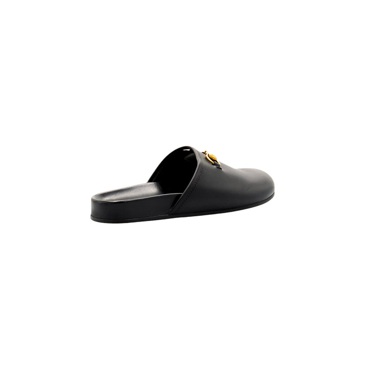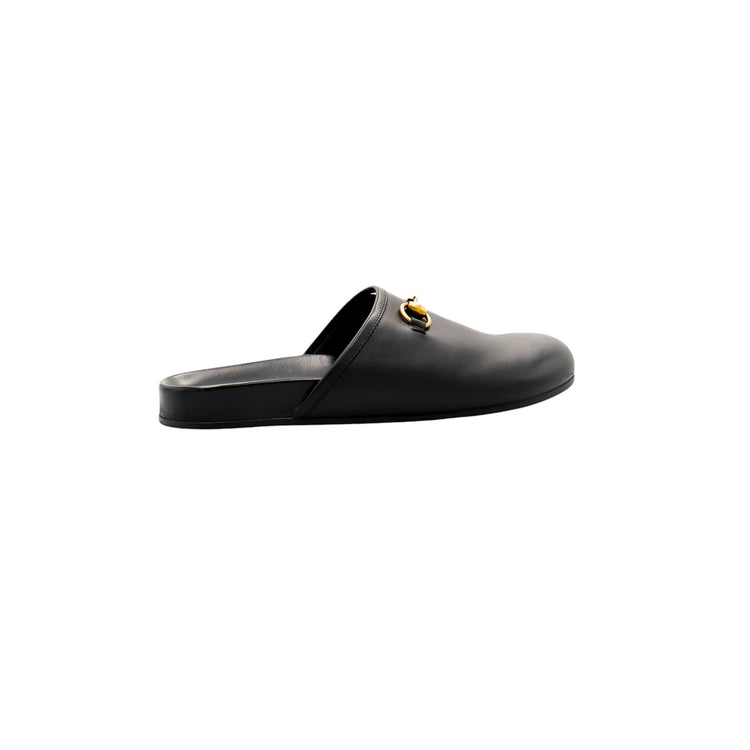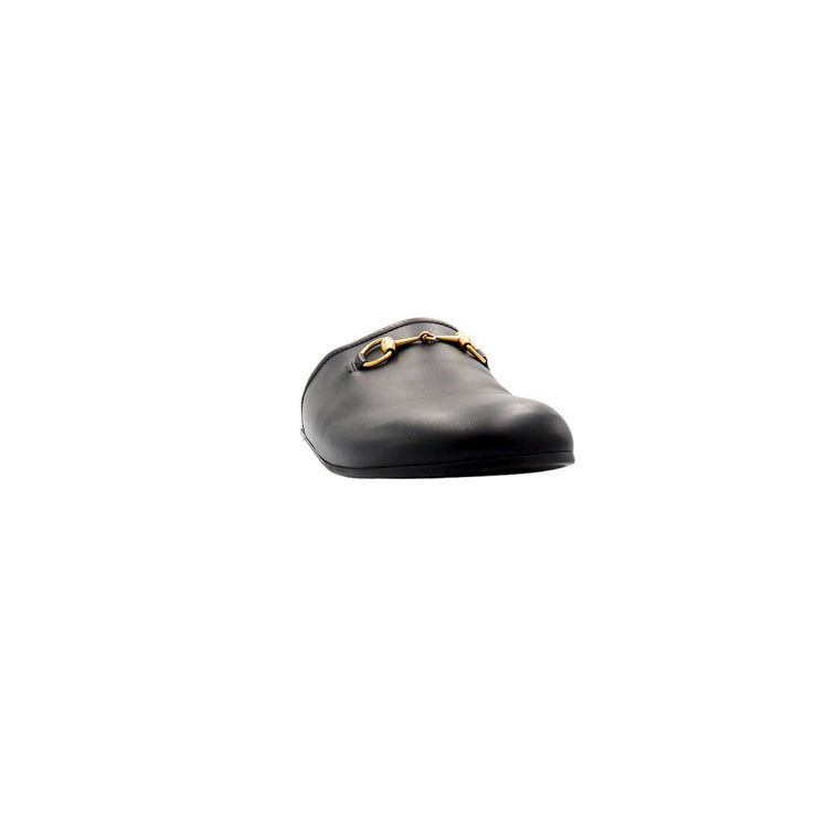 Zapato tipo mule Gucci de la línea Horsebit, confeccionados en piel color negro con suela antiderrapante de goma con adorno de herraje Horsebit en color dorado al empeine.