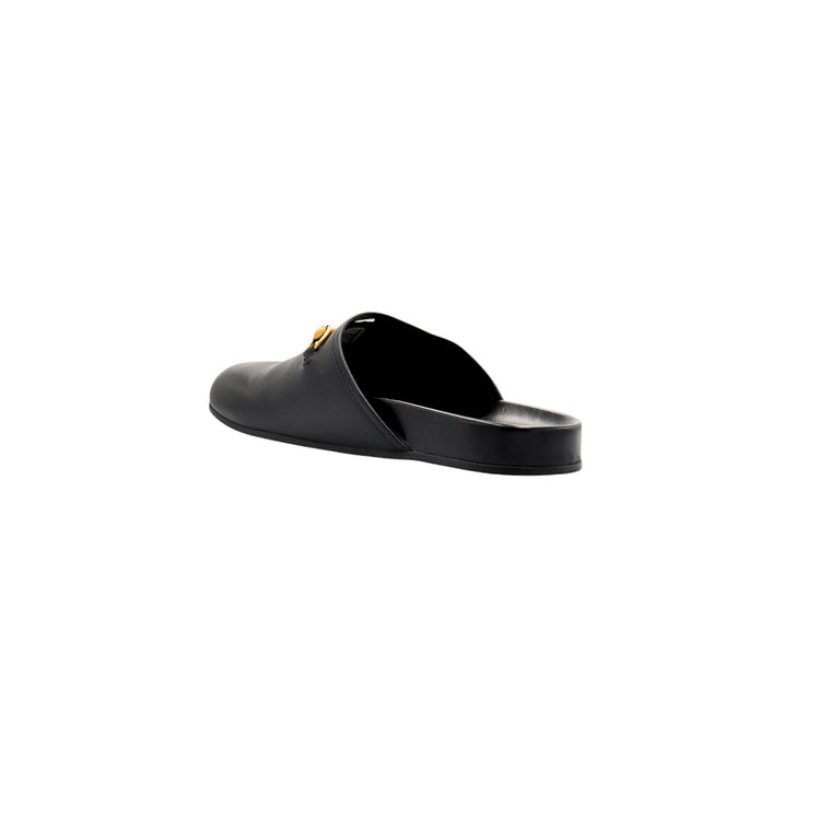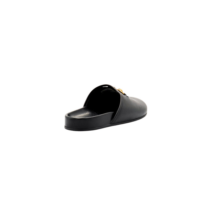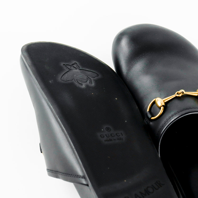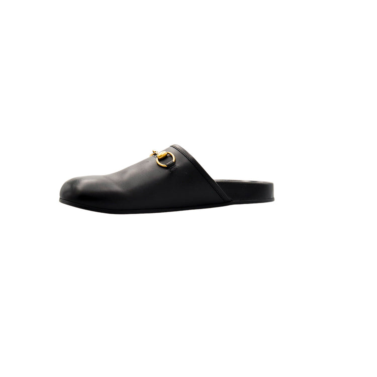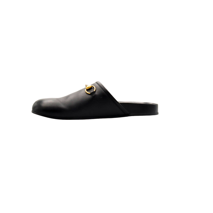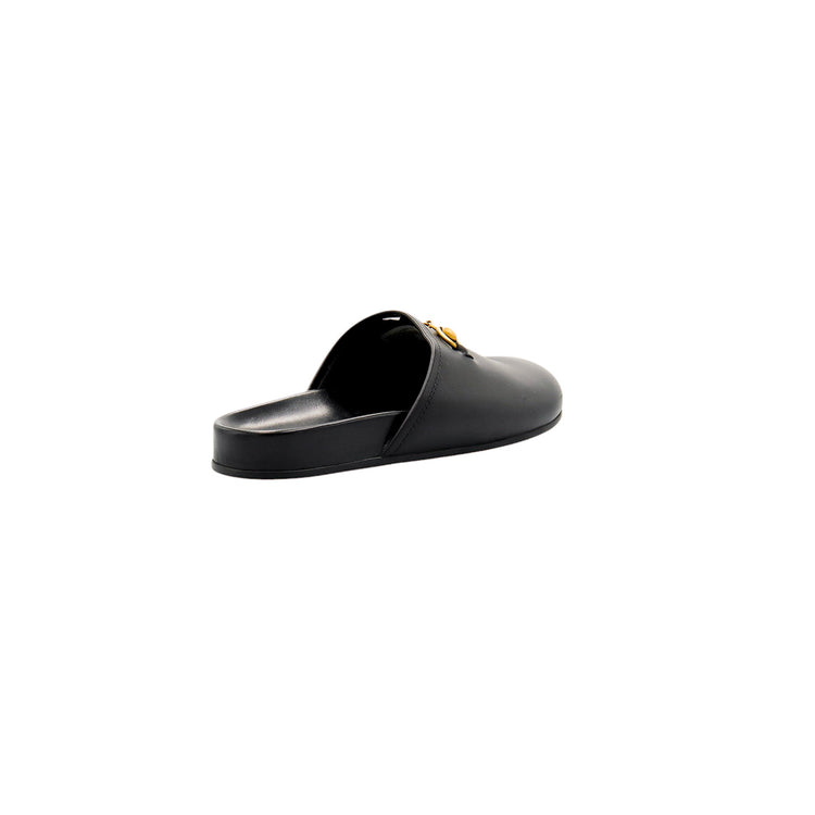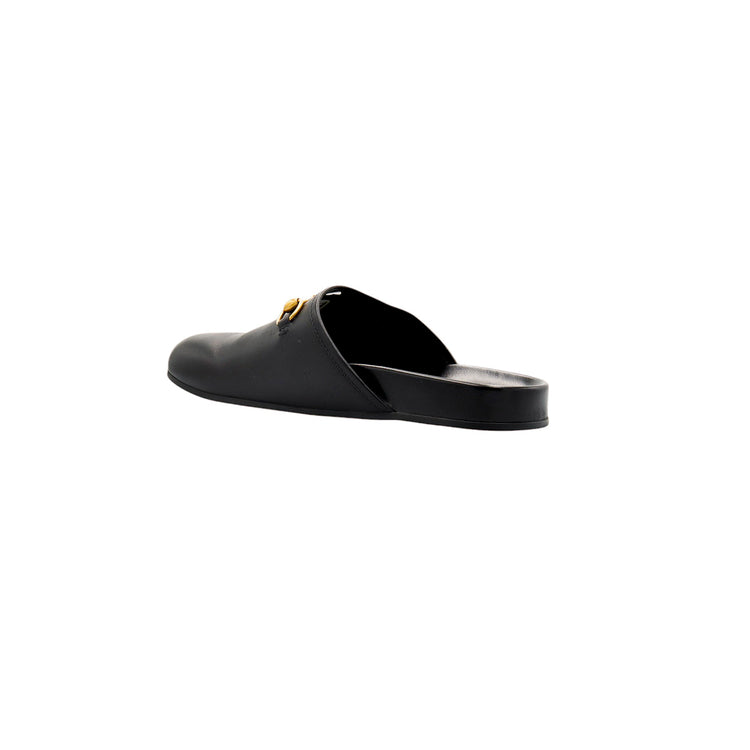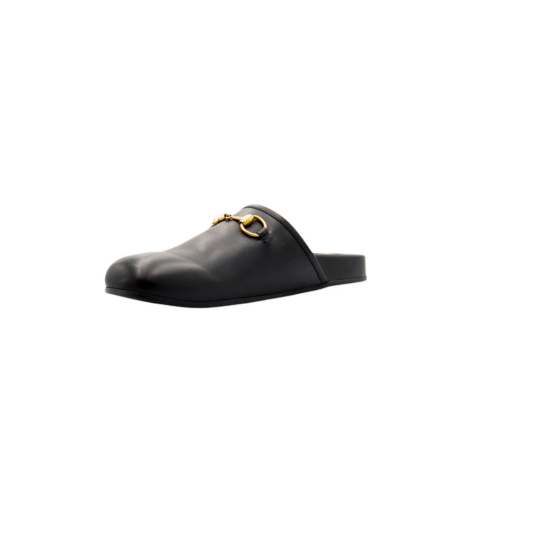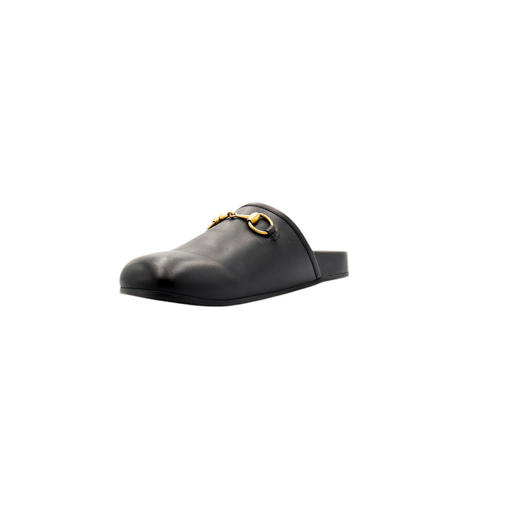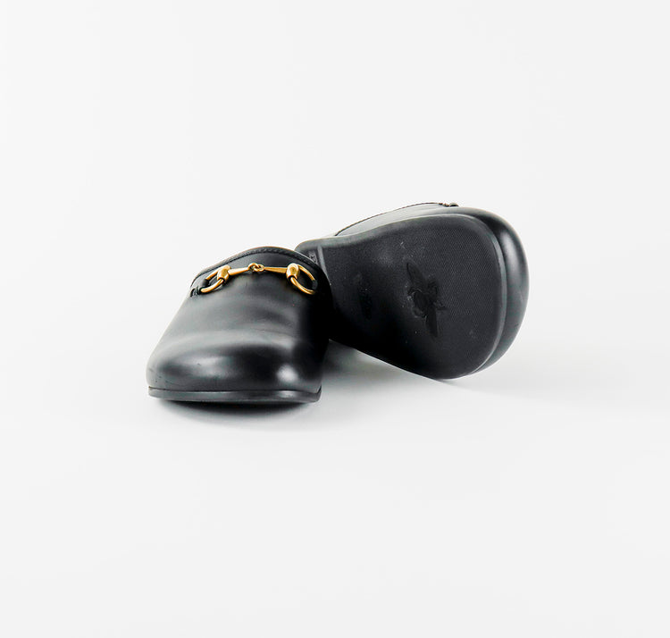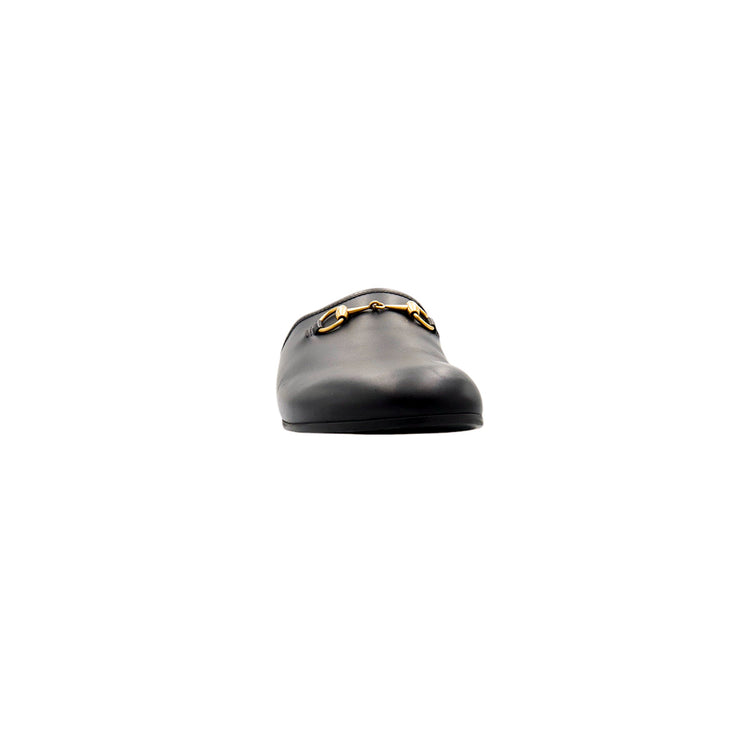 Zapato tipo mule Gucci de la línea Horsebit, confeccionados en piel color negro con suela antiderrapante de goma con adorno de herraje Horsebit en color dorado al empeine.