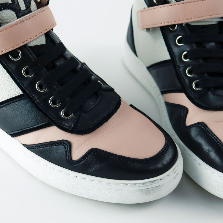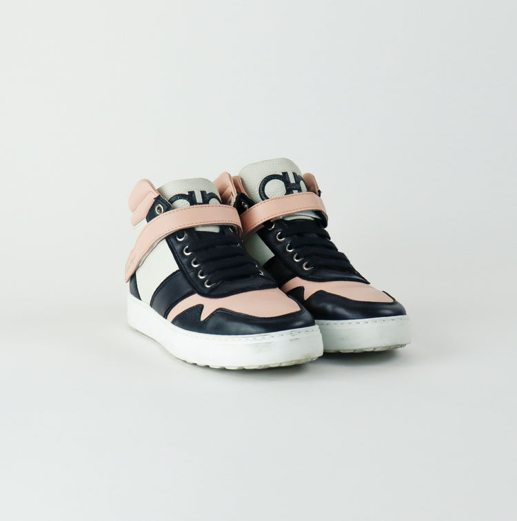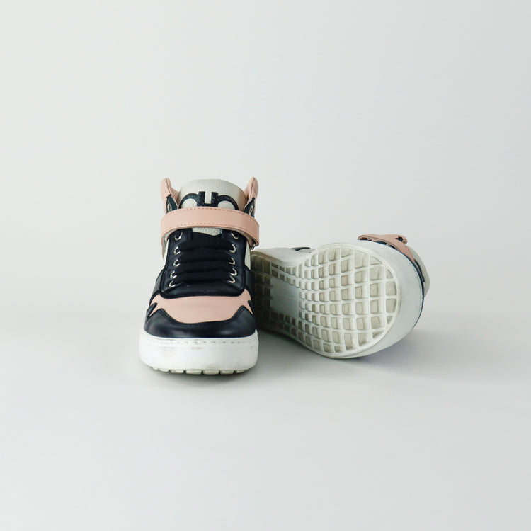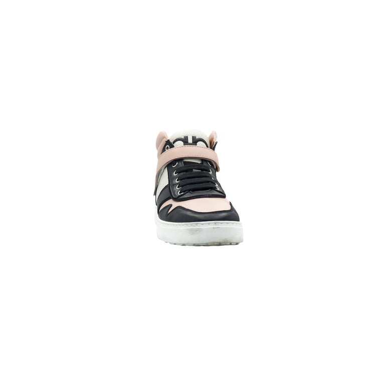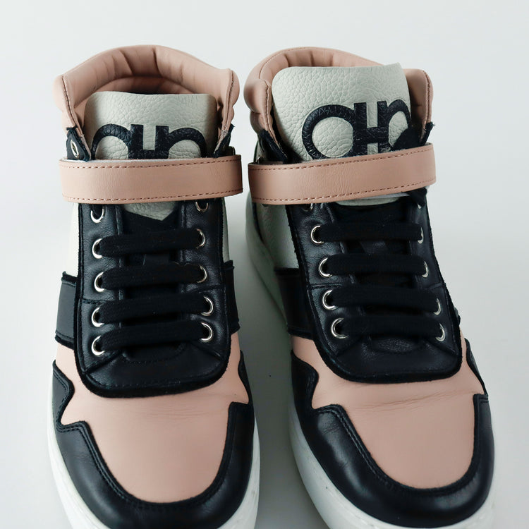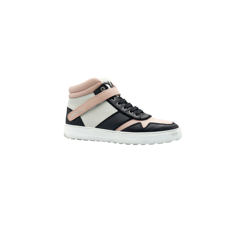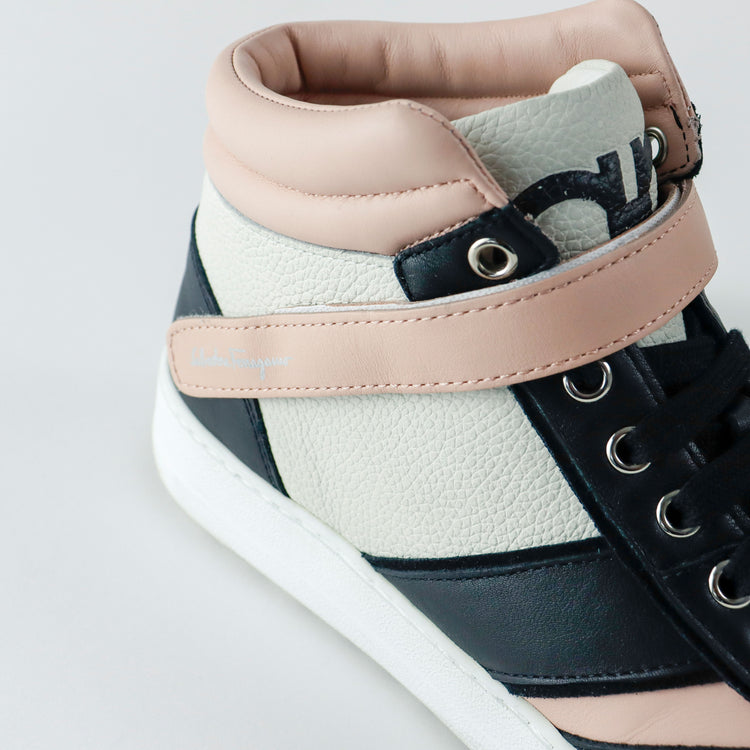 Sneakers de bota de la marca Salvatore Ferragamo línea Noe, confeccionados en piel colores rosa, blanco y negro, suela de hule.
