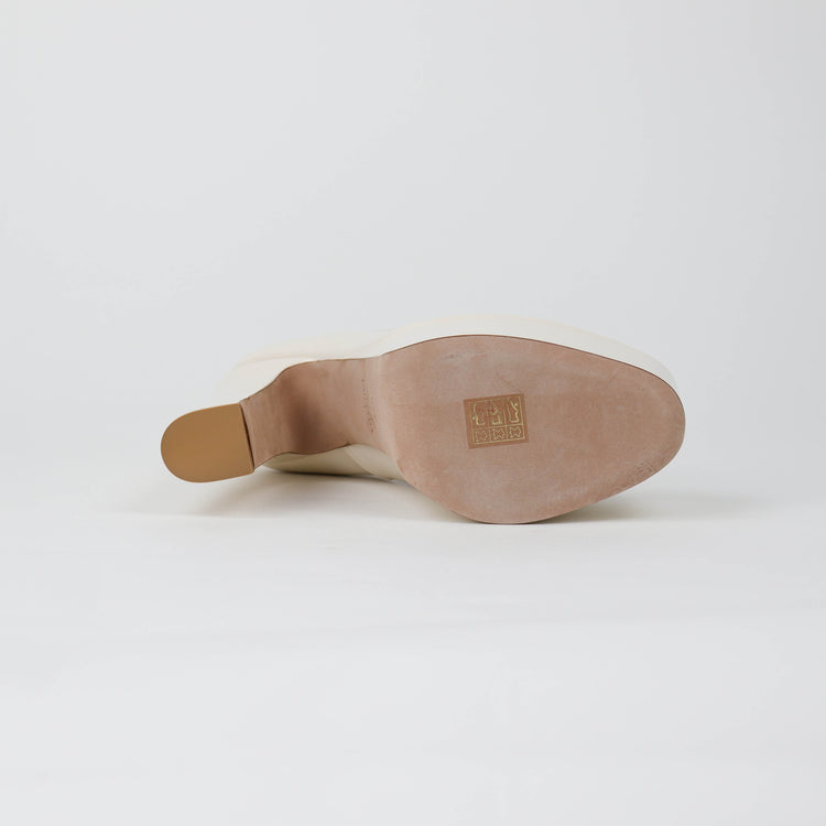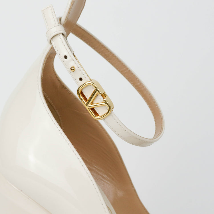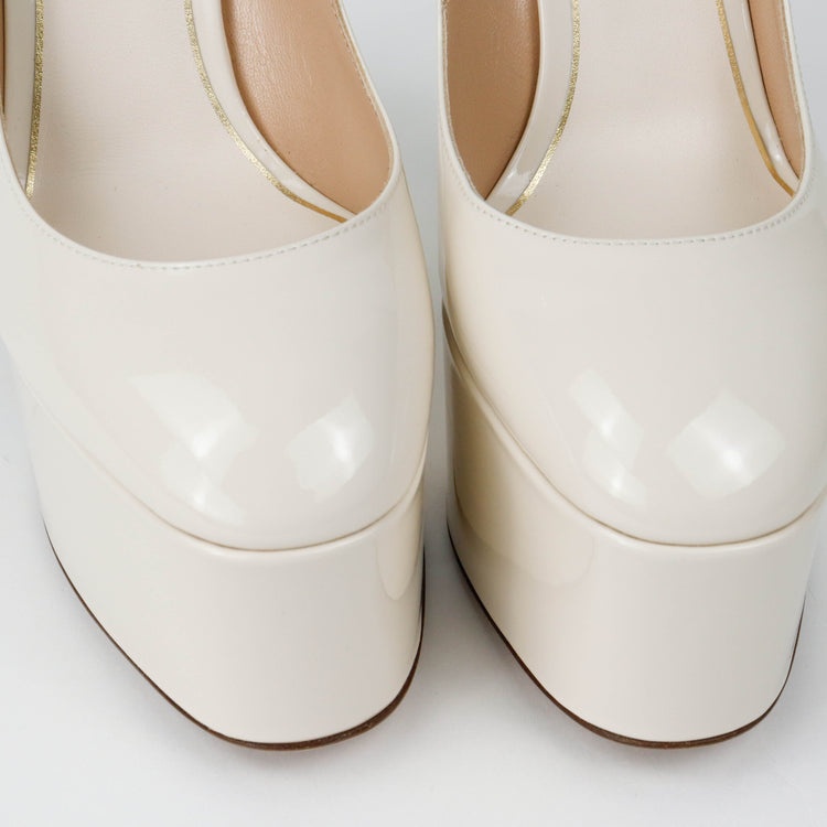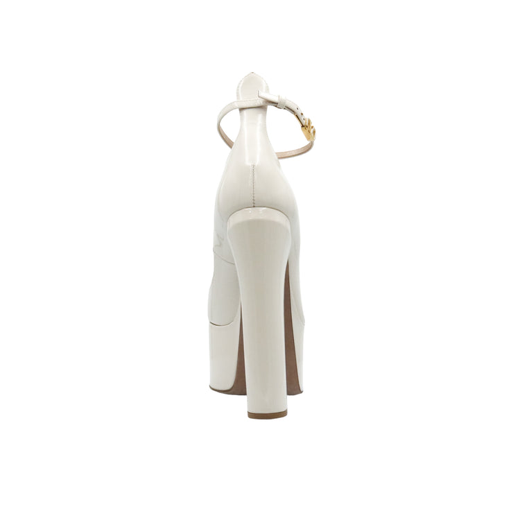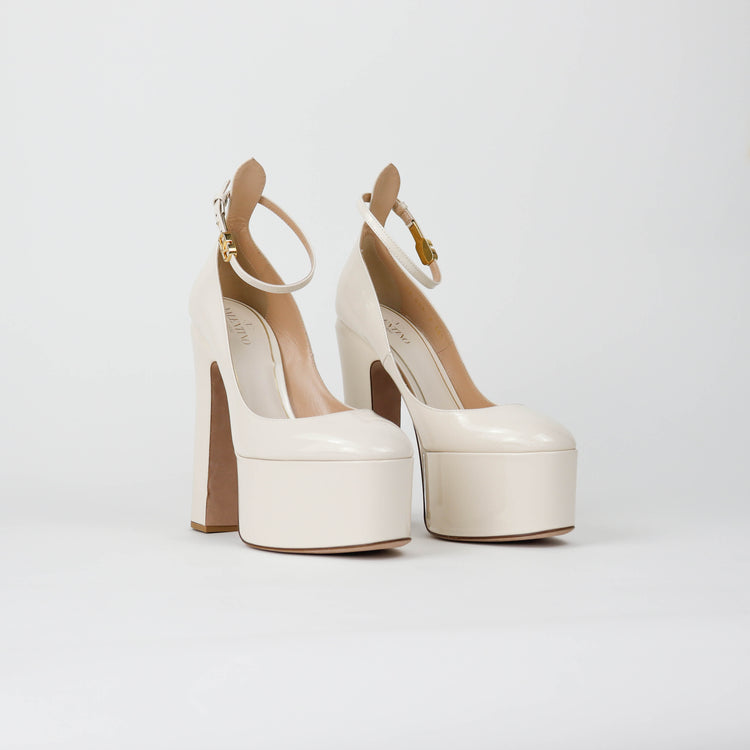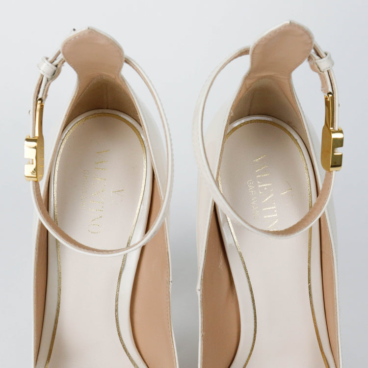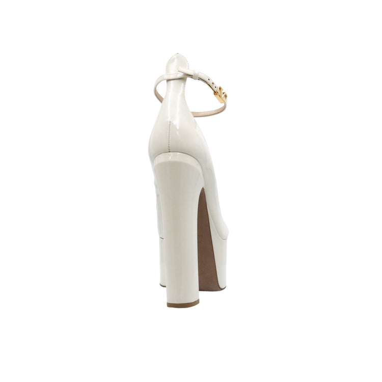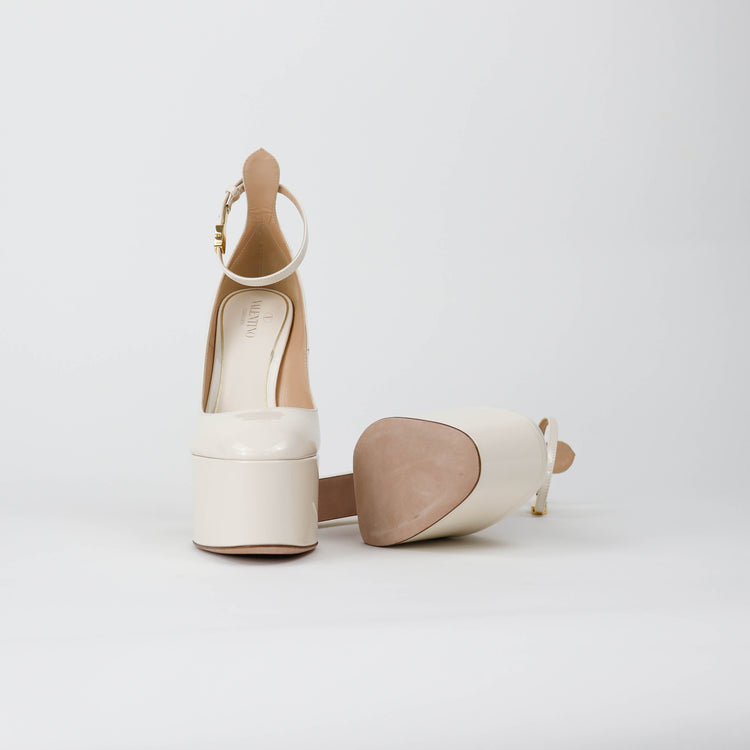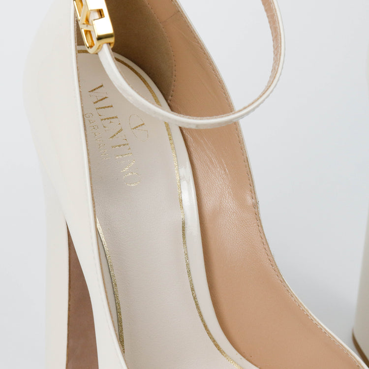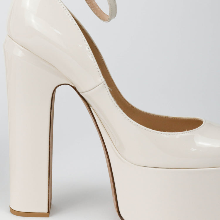 Zapatos de plataforma con tacón alto marca Valentino Garavani de la línea Tan-Go, confeccionados en charol color blanco, con pulsera de ajuste al tobillo, con herraje dorado.