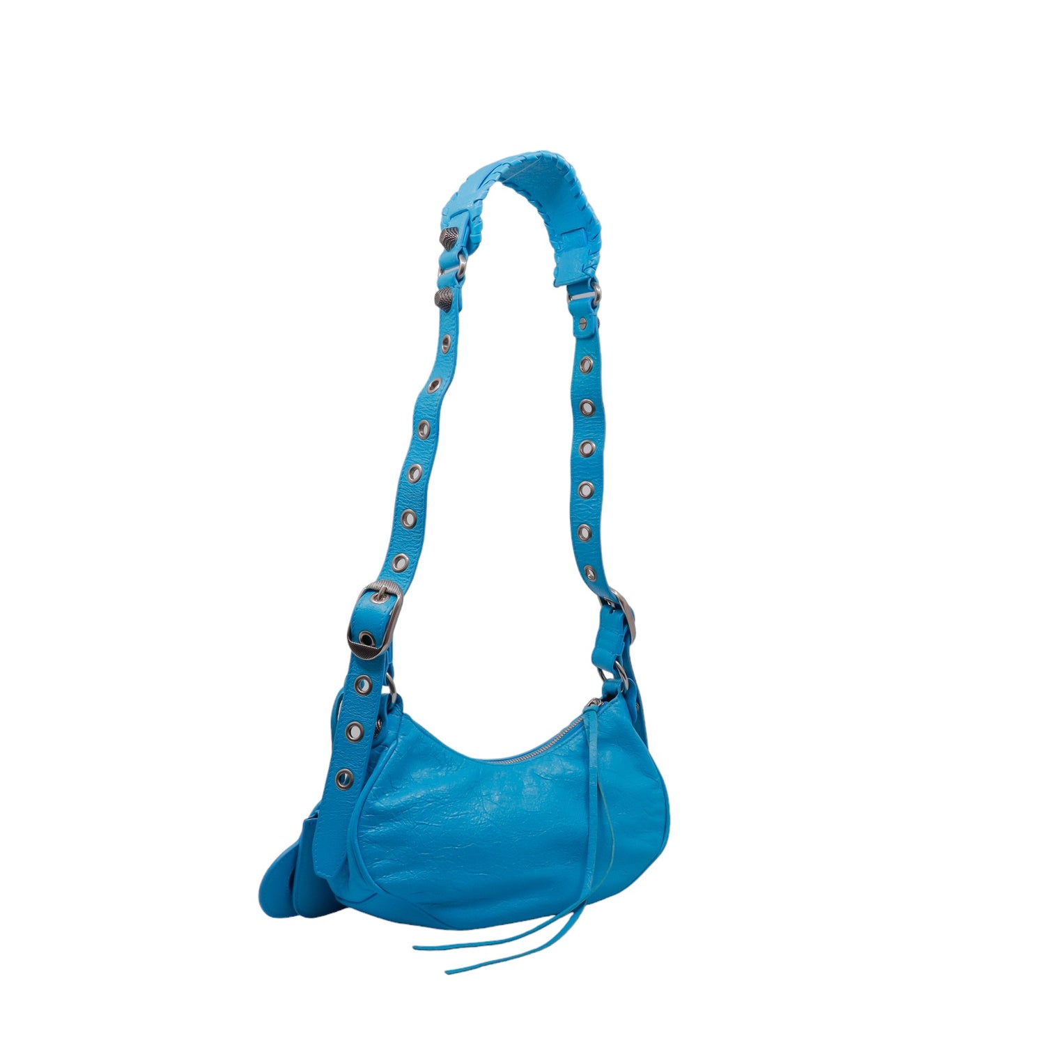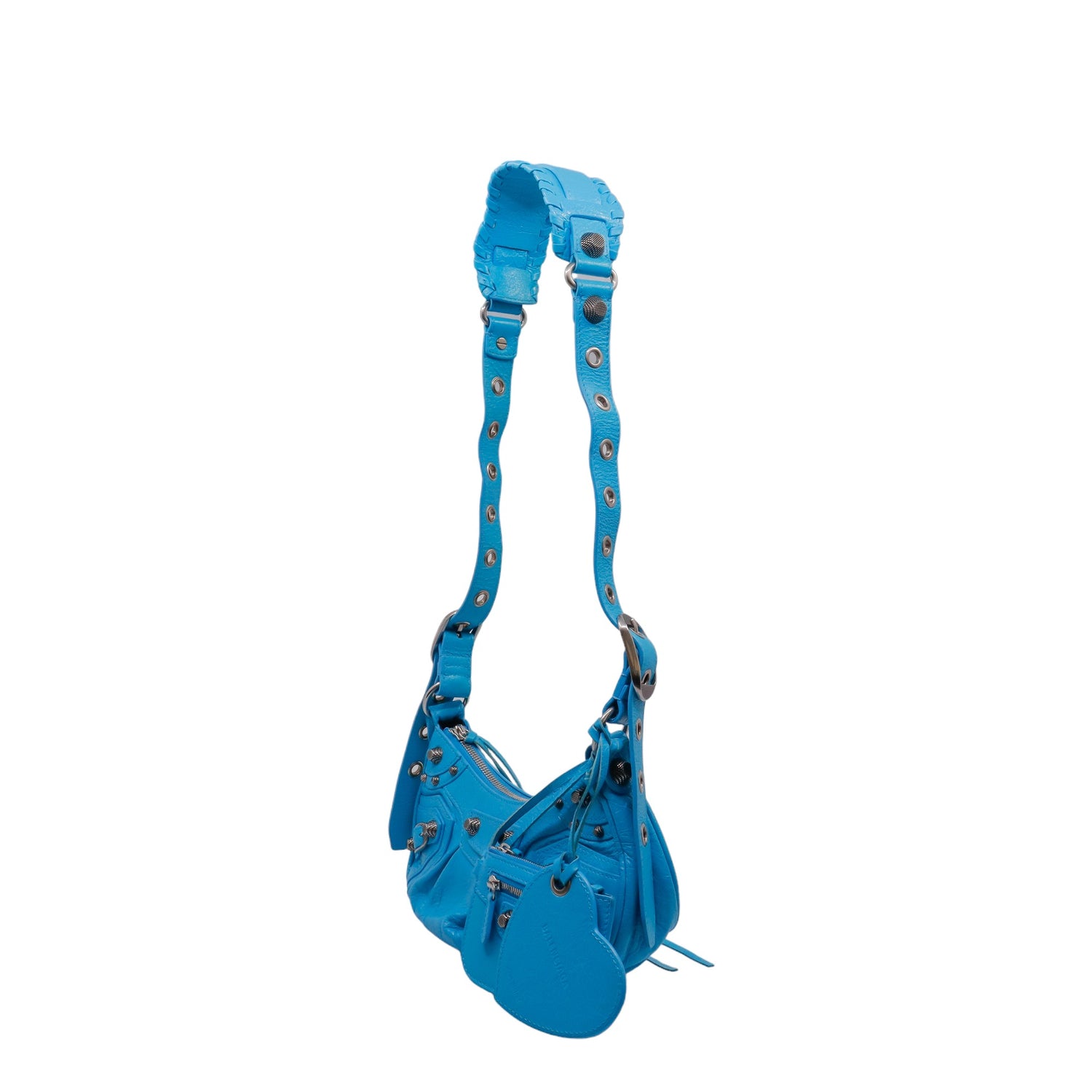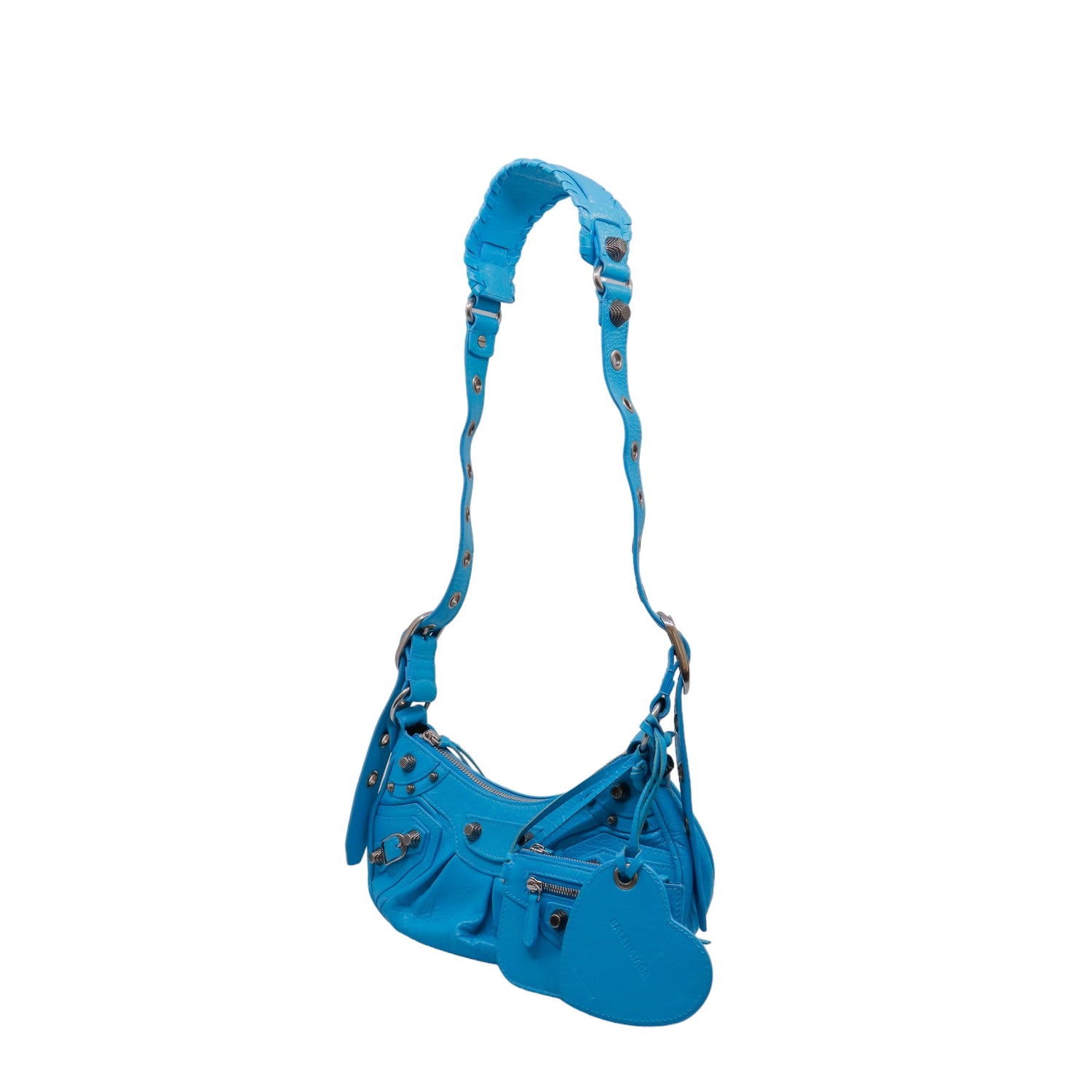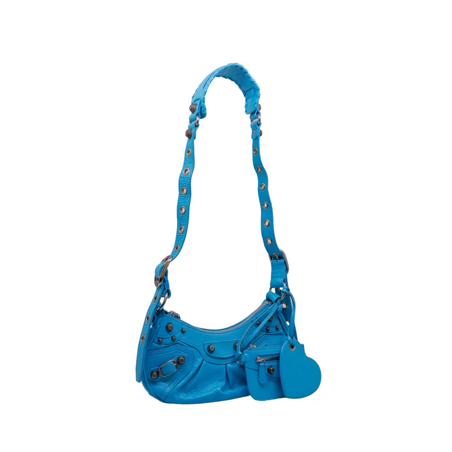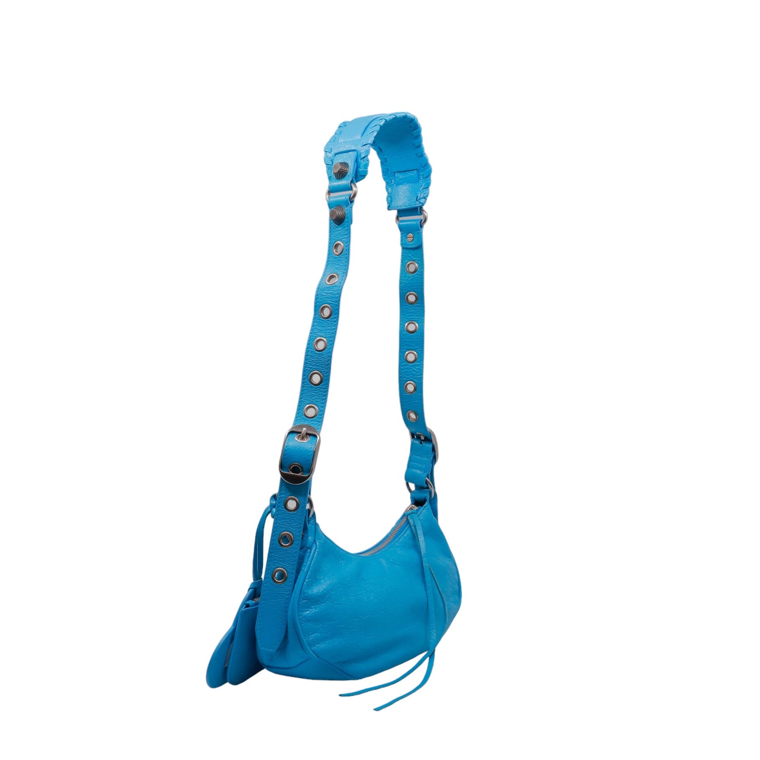 Bolso Balenciaga de la línea Le Cagole XS, confeccionado en piel rígida color azul, forro textil negro, con estoperoles y herrajes en color plata, asa ajustable y espejo.