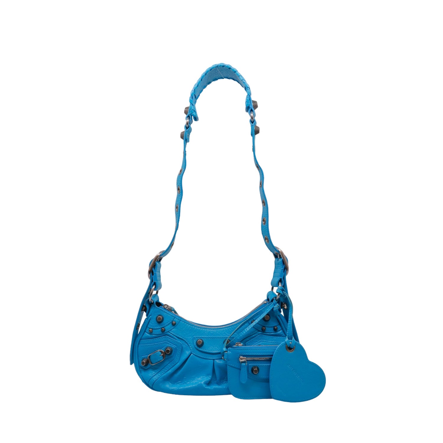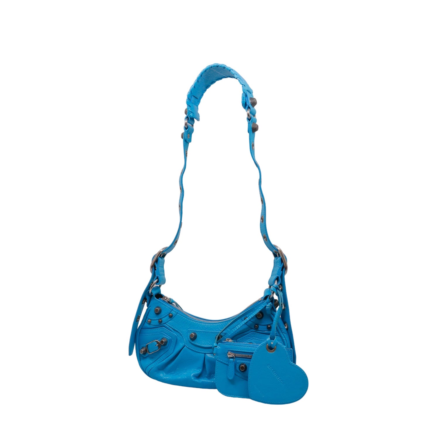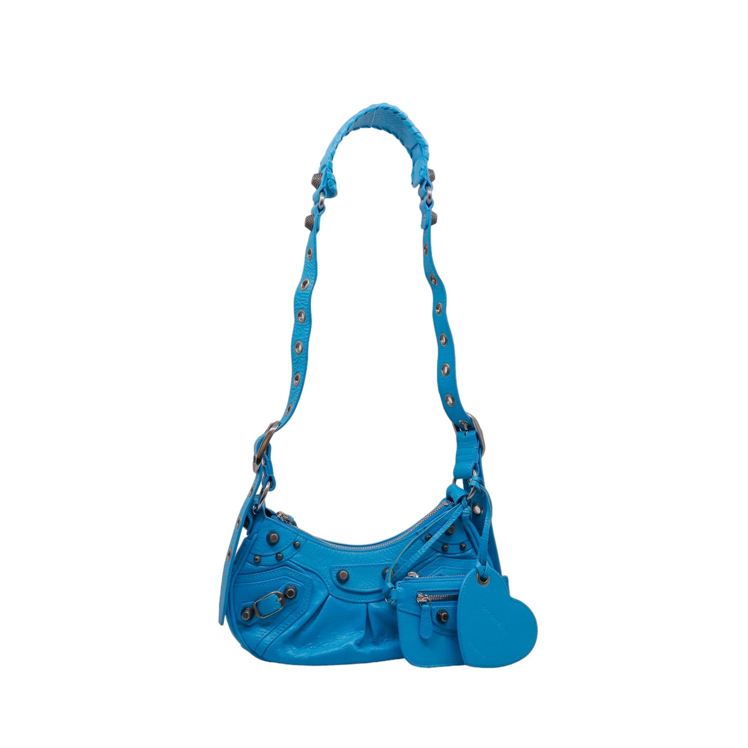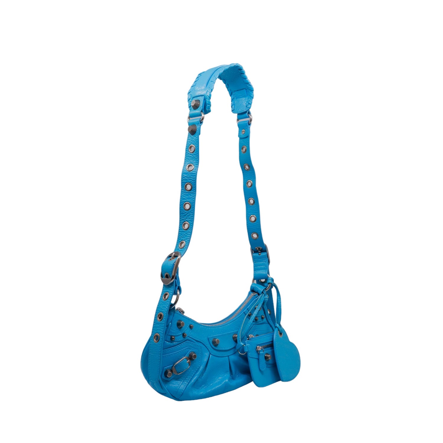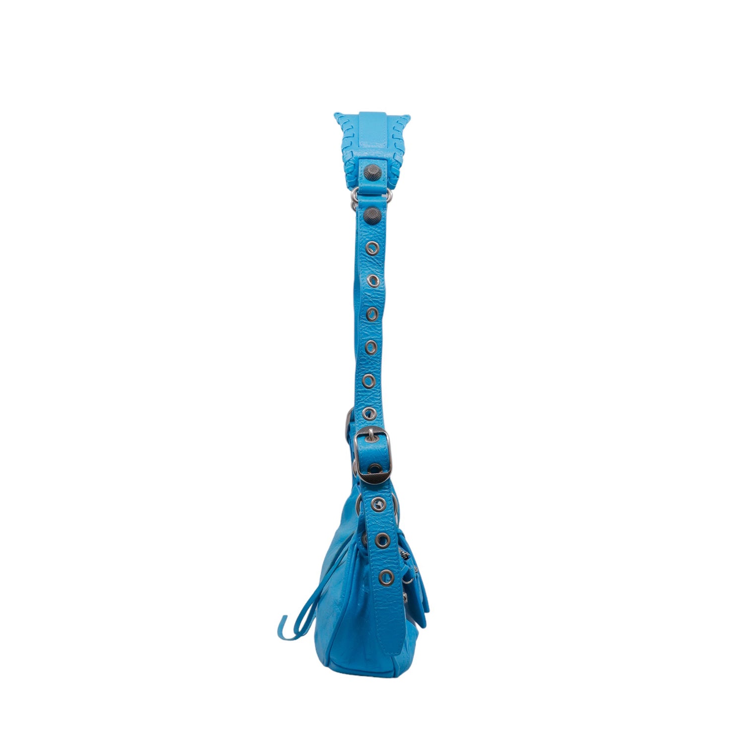 Bolso Balenciaga de la línea Le Cagole XS, confeccionado en piel rígida color azul, forro textil negro, con estoperoles y herrajes en color plata, asa ajustable y espejo.