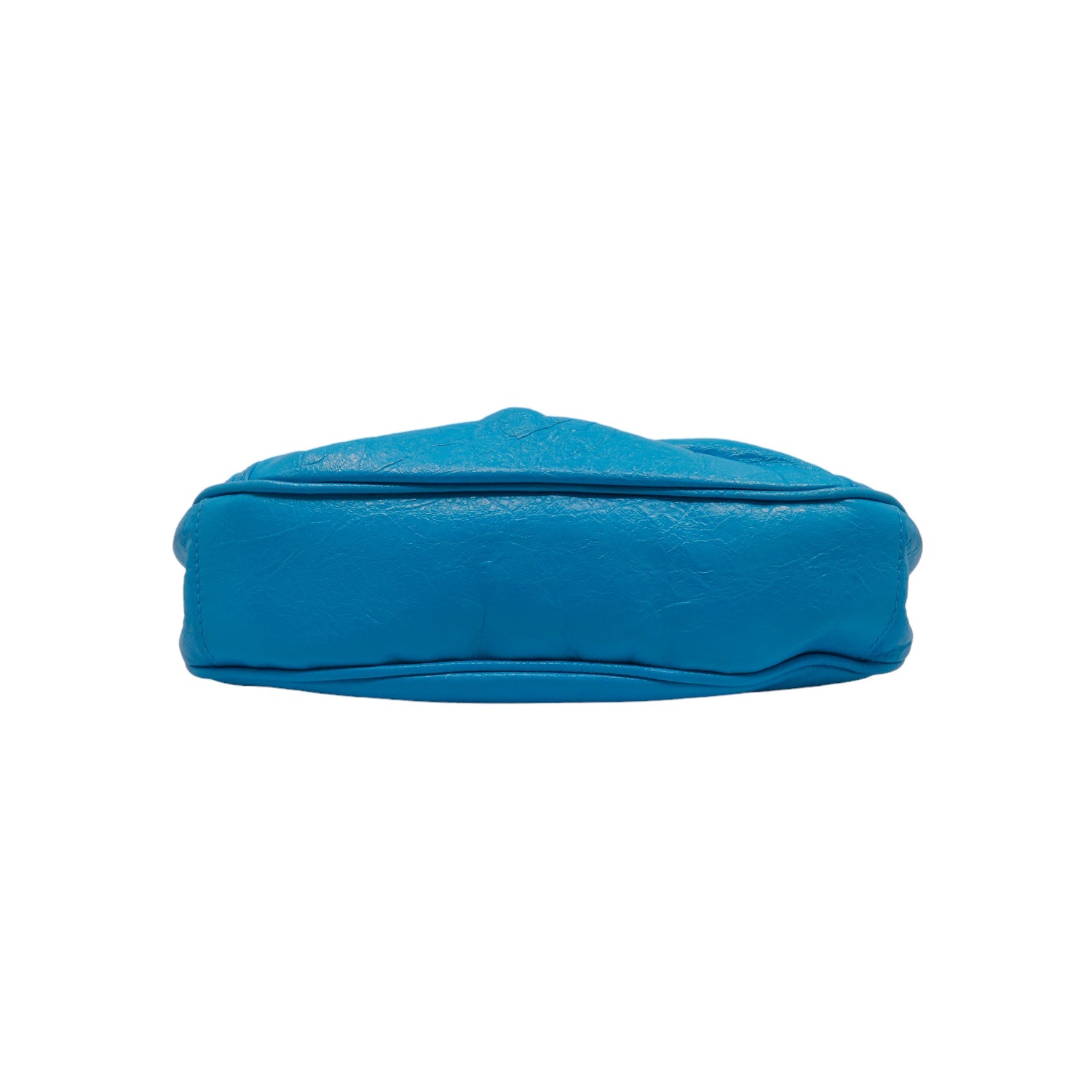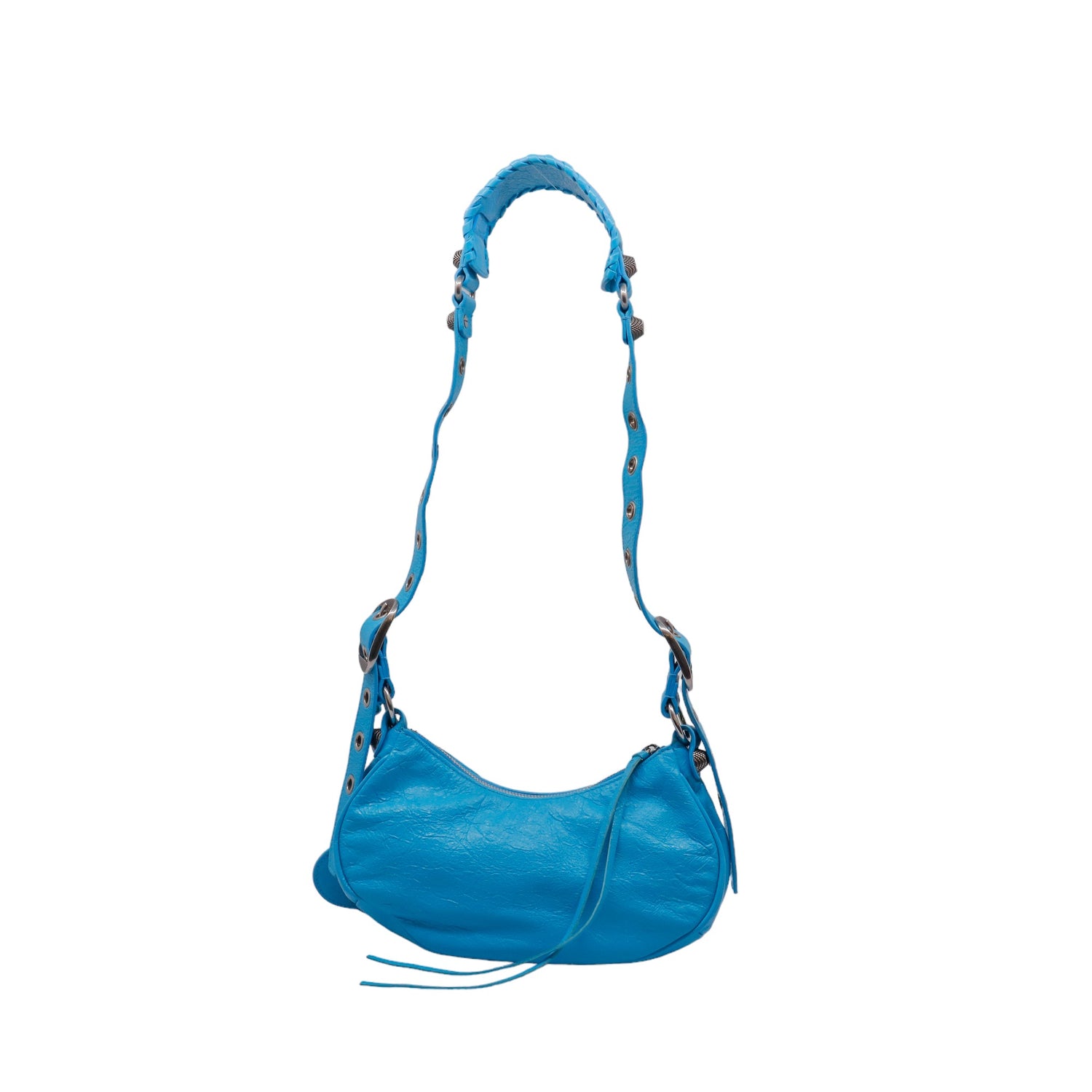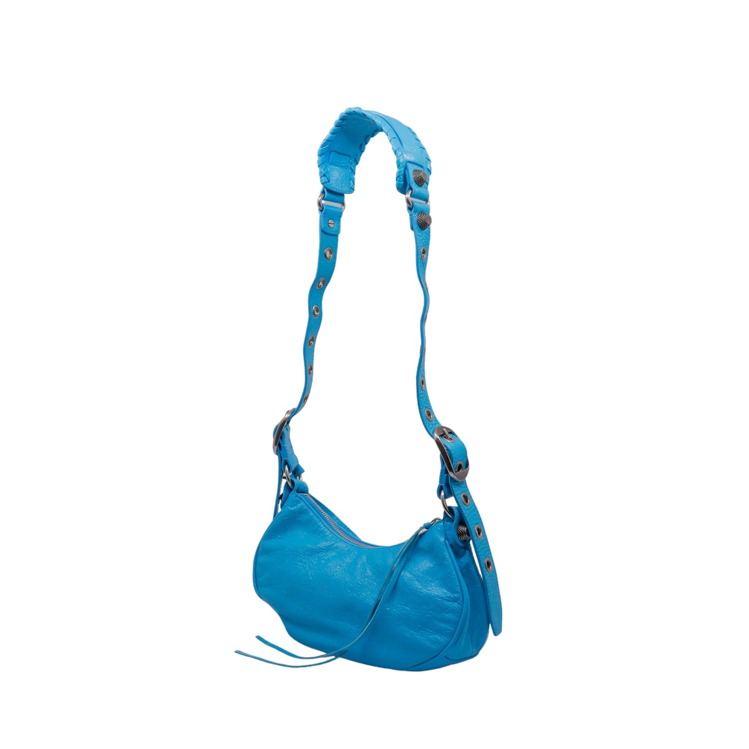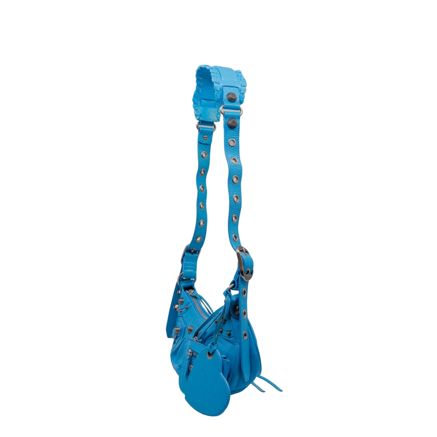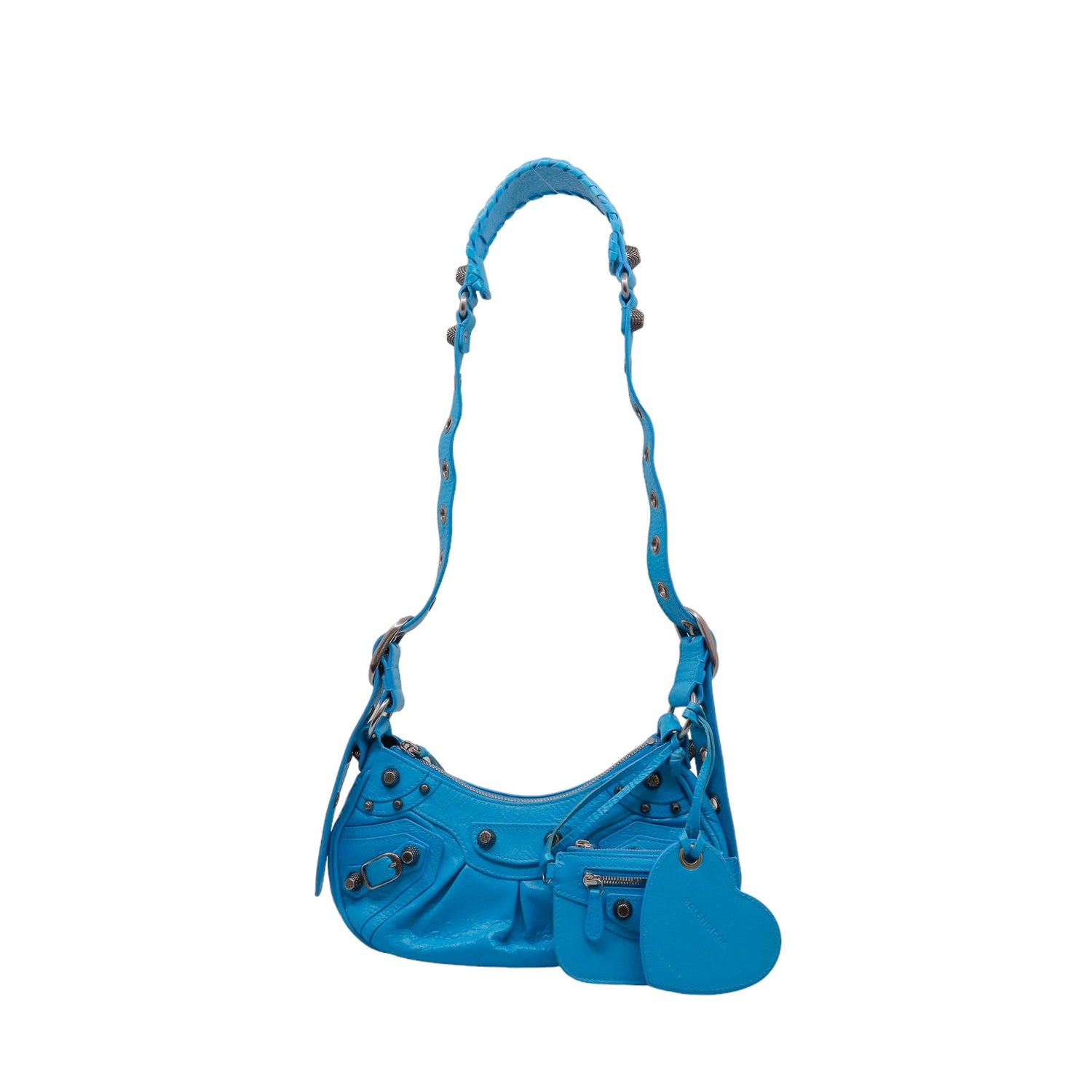 Bolso Balenciaga de la línea Le Cagole XS, confeccionado en piel rígida color azul, forro textil negro, con estoperoles y herrajes en color plata, asa ajustable y espejo.