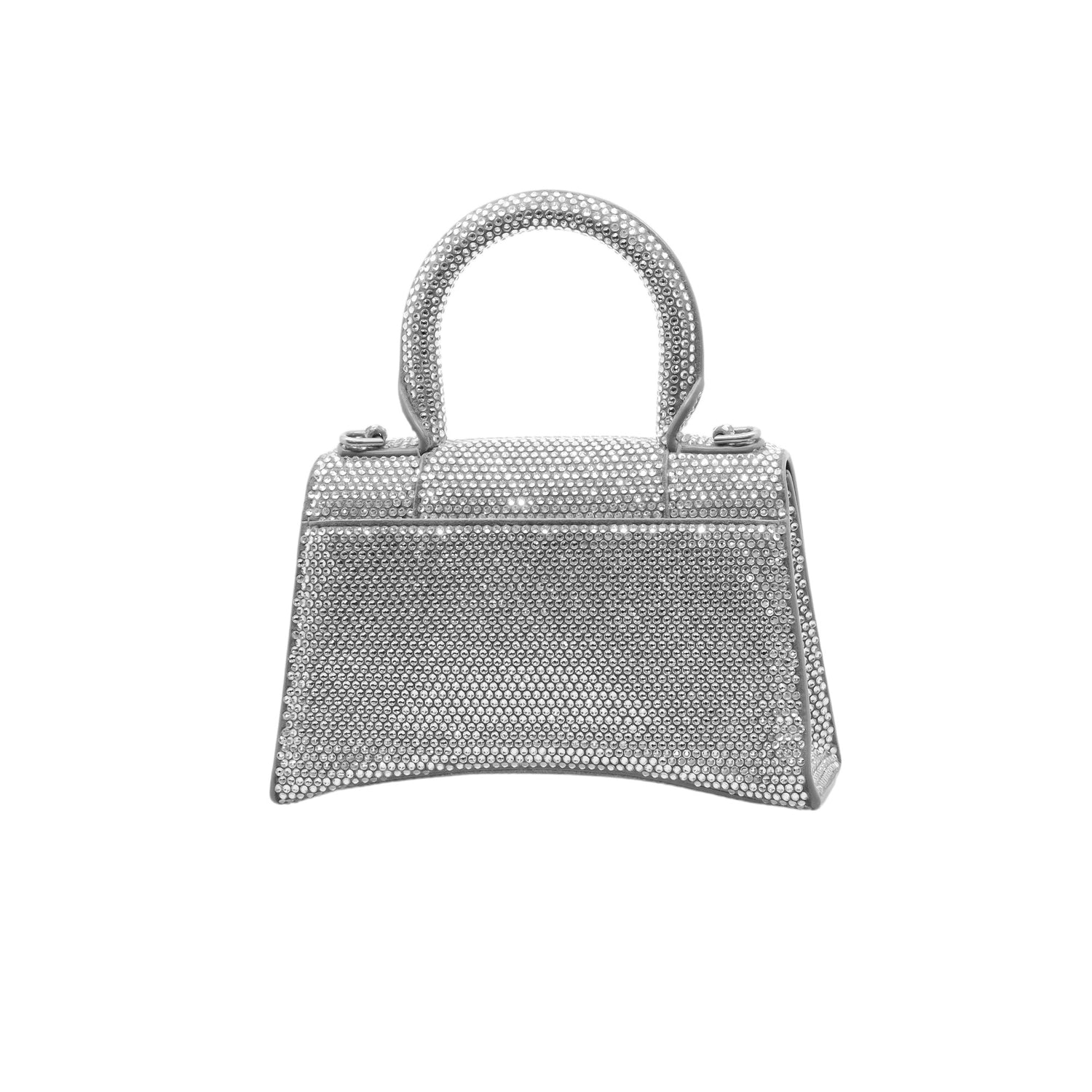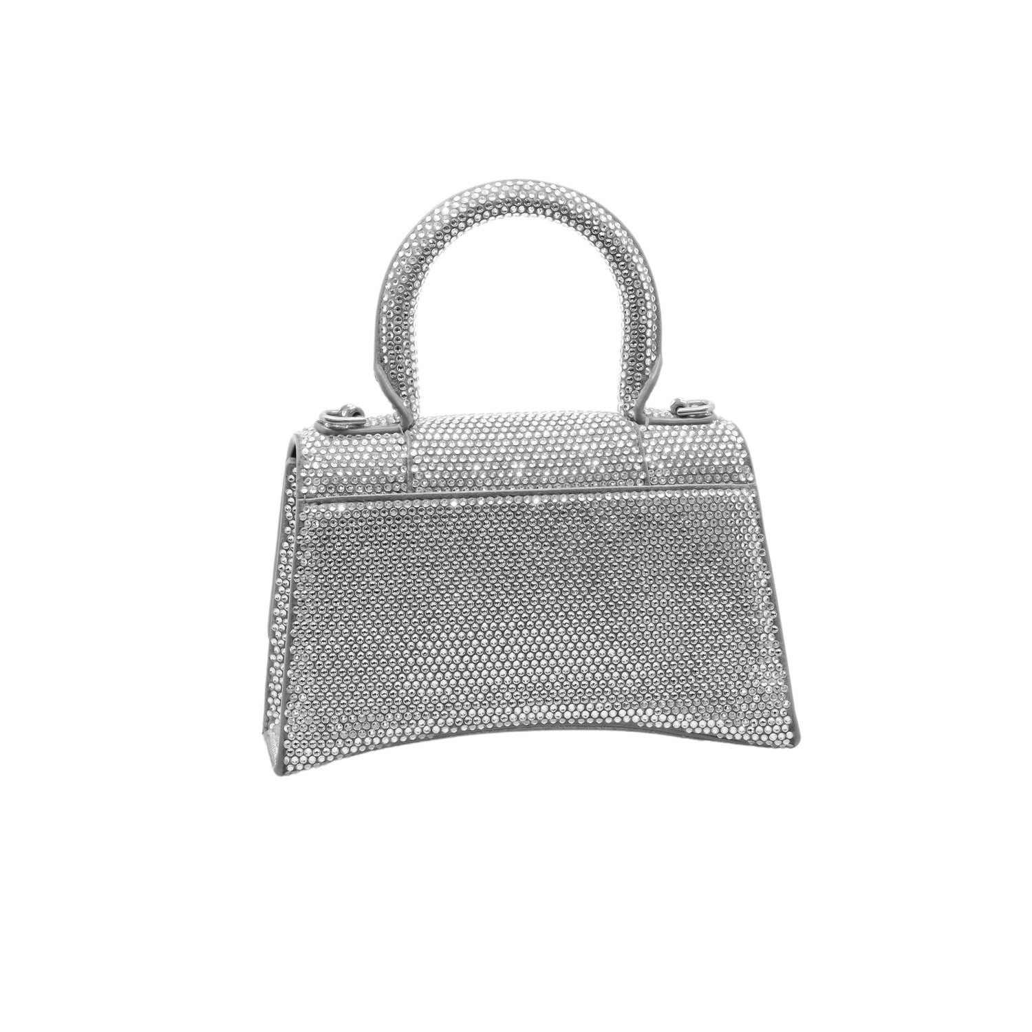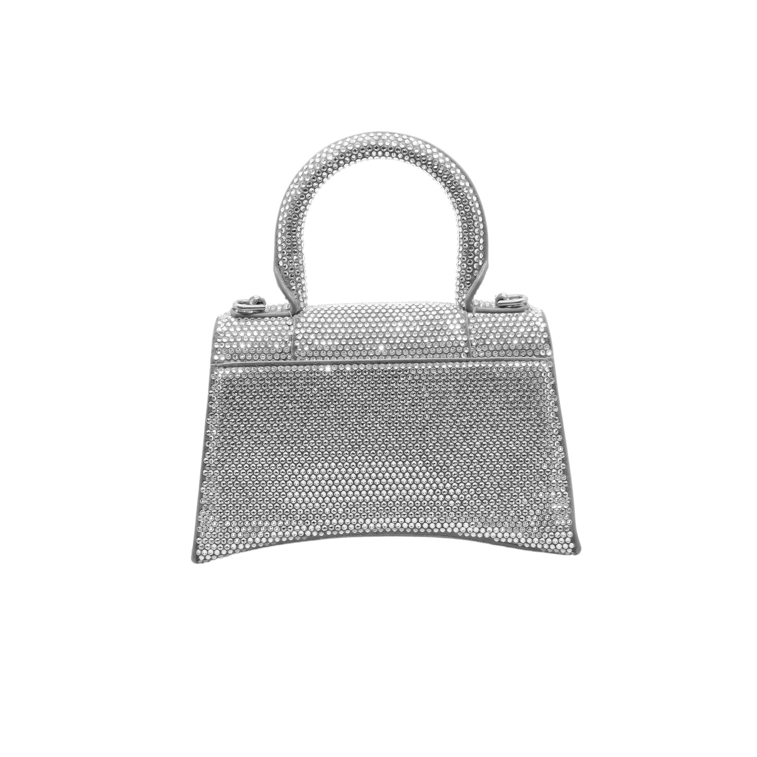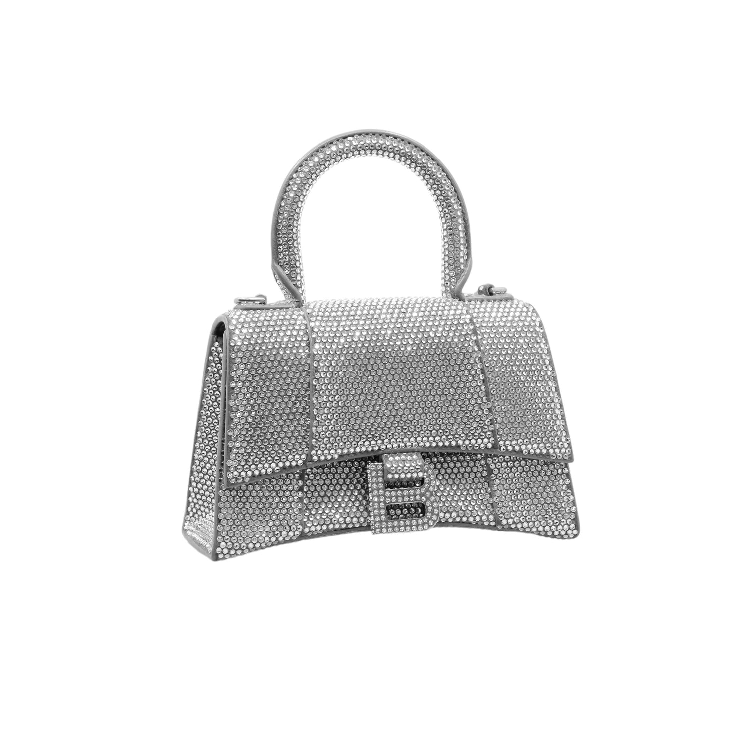 Bolso Balenciaga Hourglass Mini Crystal, confeccionado en piel de becerro y ante en color gris con pequeños cristales plateados en toda la superficie, cuenta con 1 asa rígida y strap de piel con cristales en los mismos colores, interior en piel color negro, con pequeñas manchas, herrajes en color plateado.