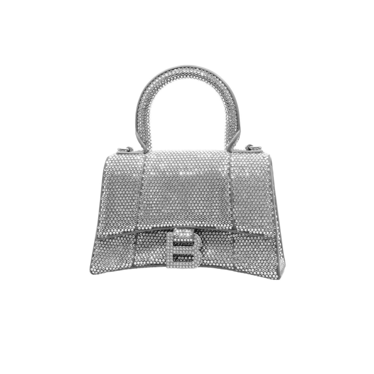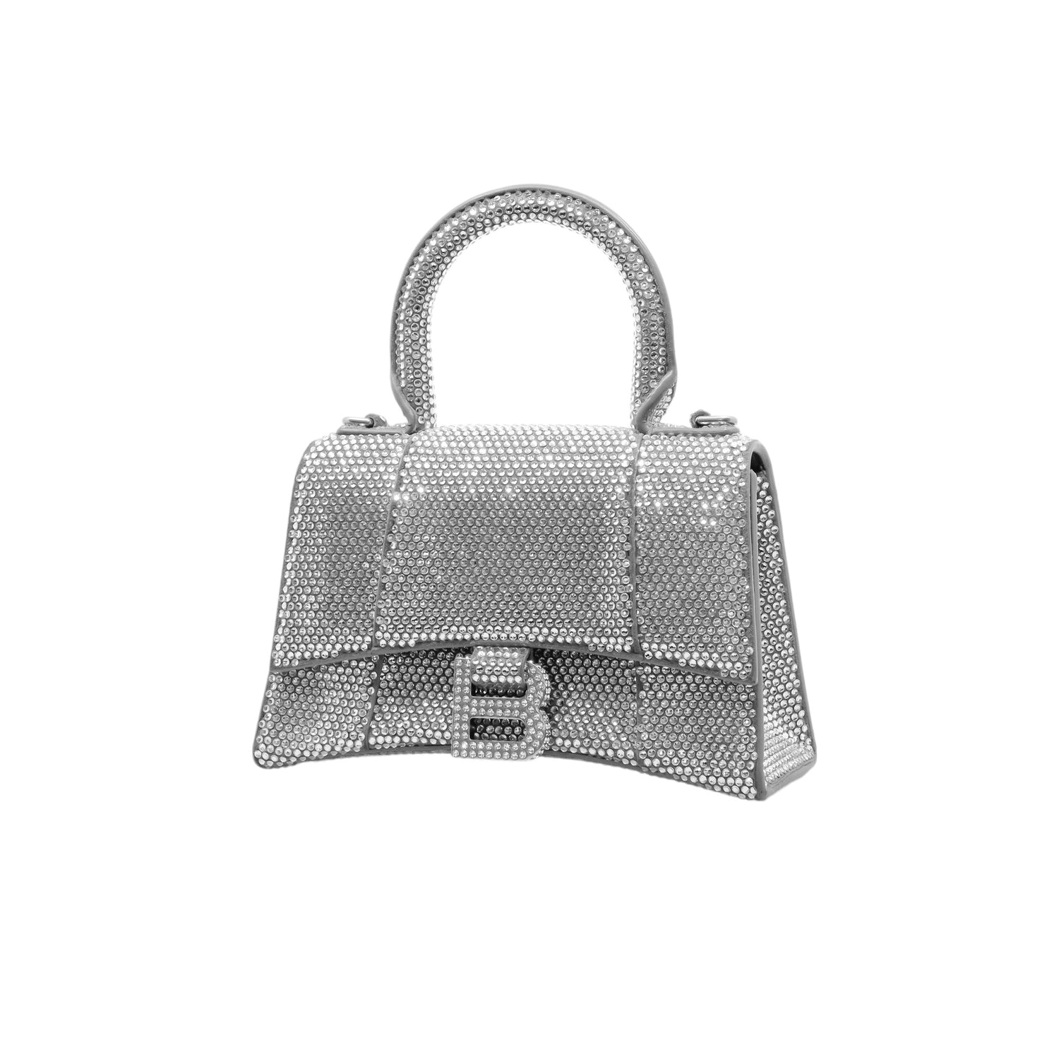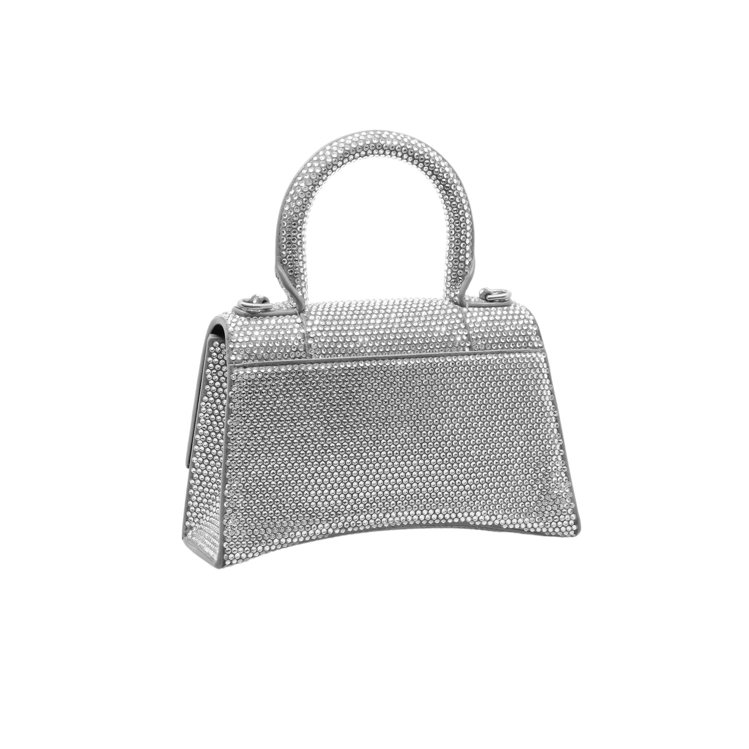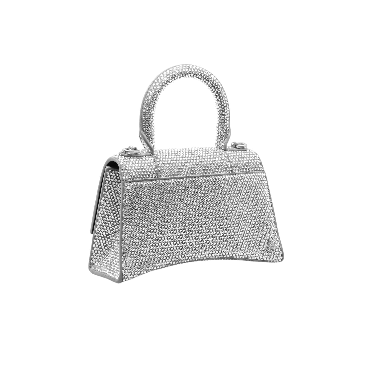 Bolso Balenciaga Hourglass Mini Crystal, confeccionado en piel de becerro y ante en color gris con pequeños cristales plateados en toda la superficie, cuenta con 1 asa rígida y strap de piel con cristales en los mismos colores, interior en piel color negro, con pequeñas manchas, herrajes en color plateado.