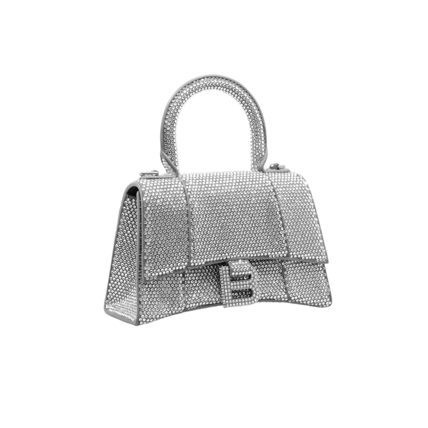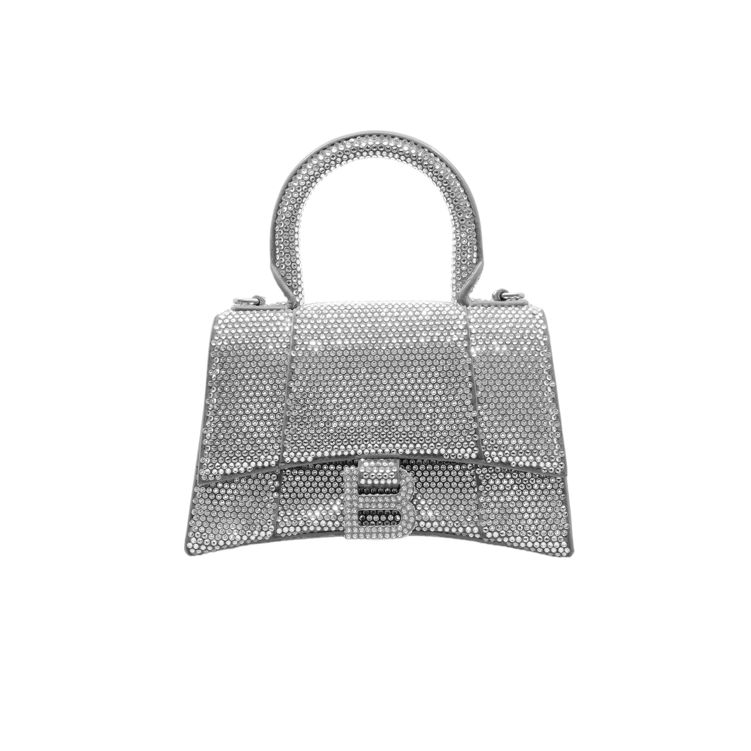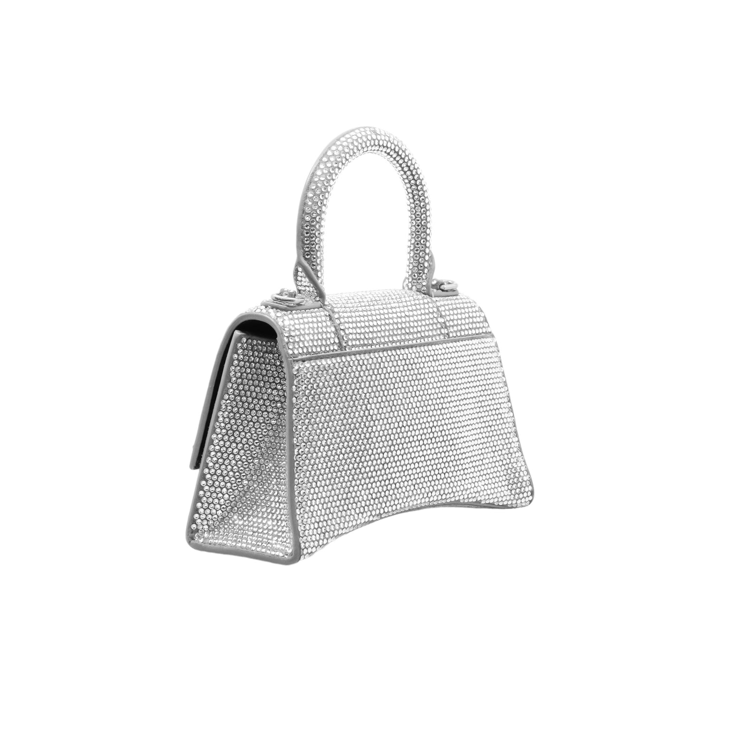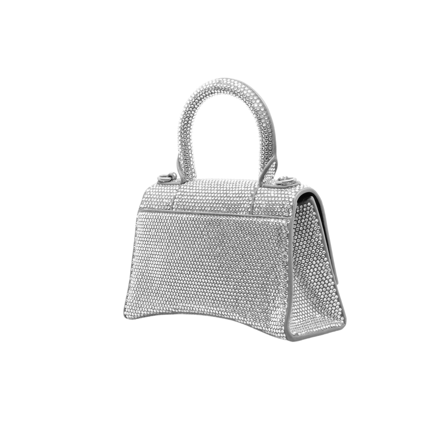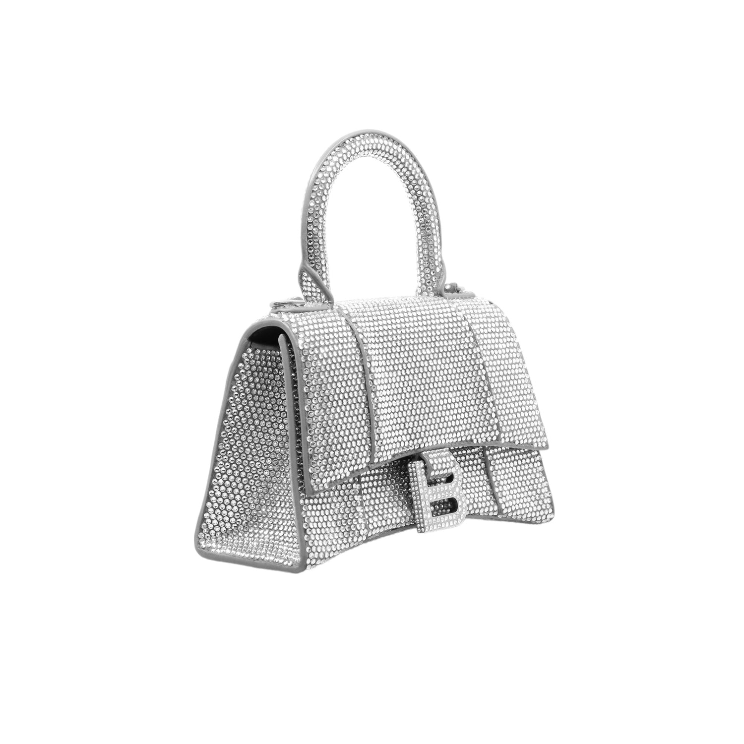 Bolso Balenciaga Hourglass Mini Crystal, confeccionado en piel de becerro y ante en color gris con pequeños cristales plateados en toda la superficie, cuenta con 1 asa rígida y strap de piel con cristales en los mismos colores, interior en piel color negro, con pequeñas manchas, herrajes en color plateado.