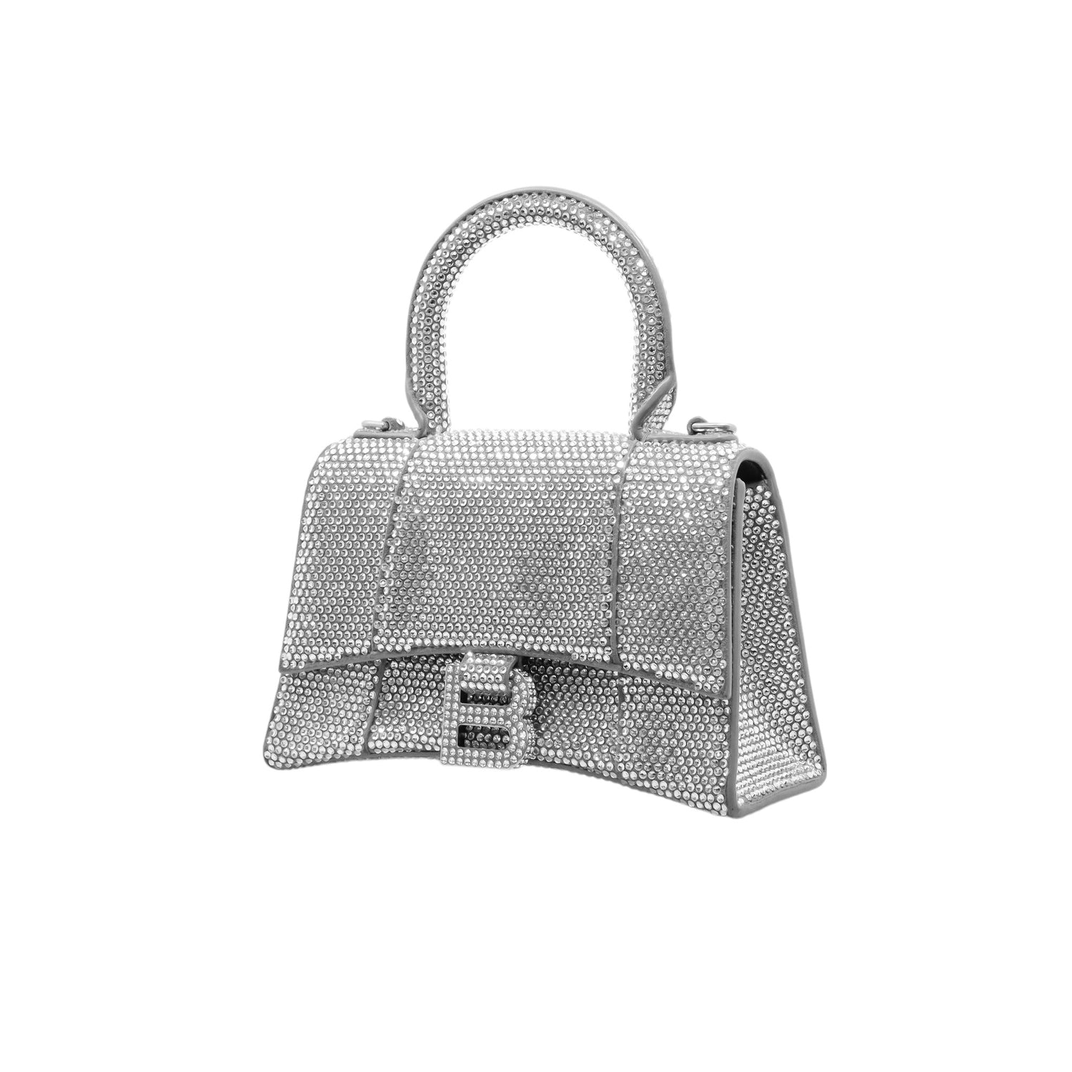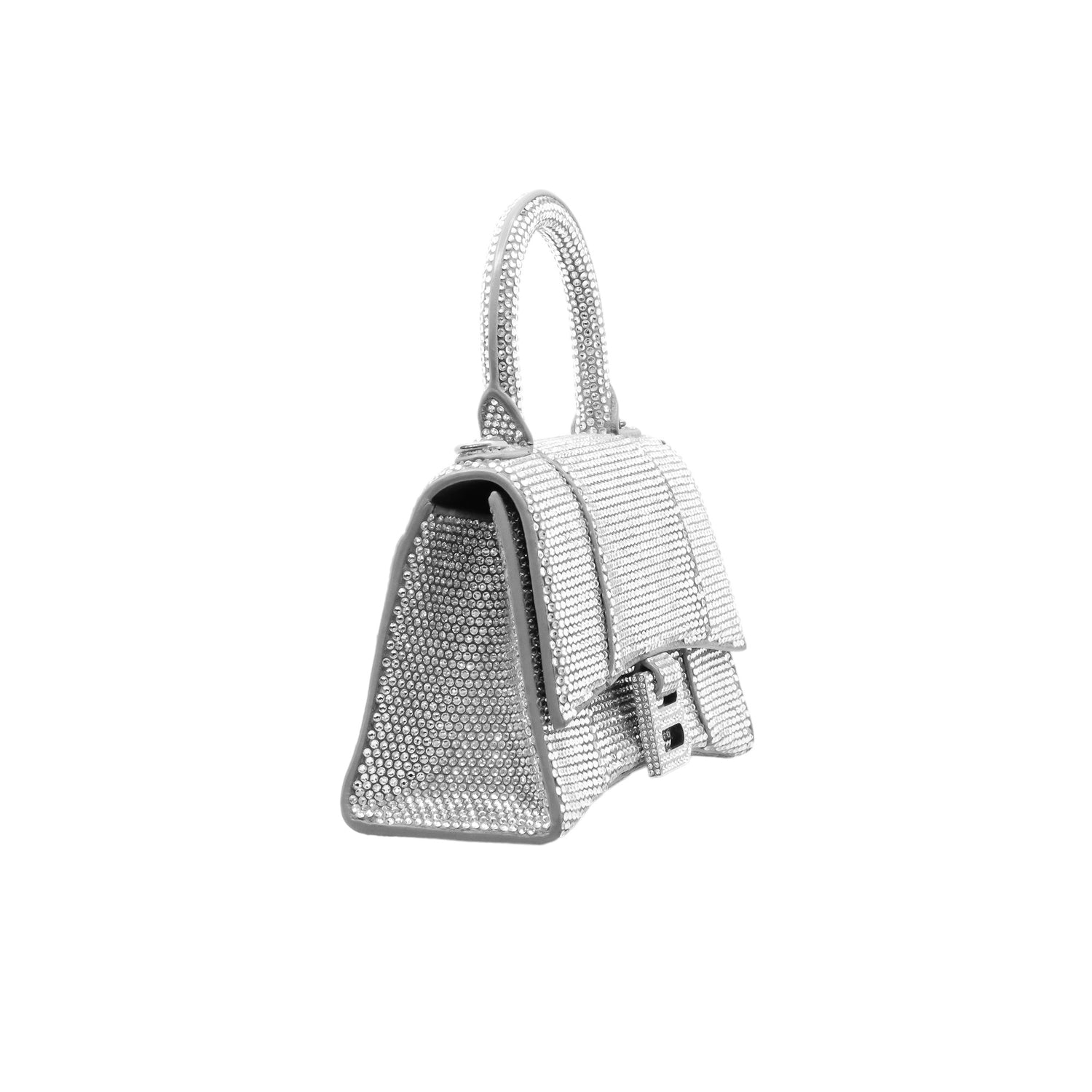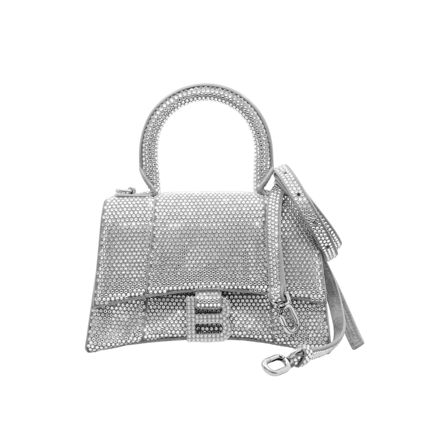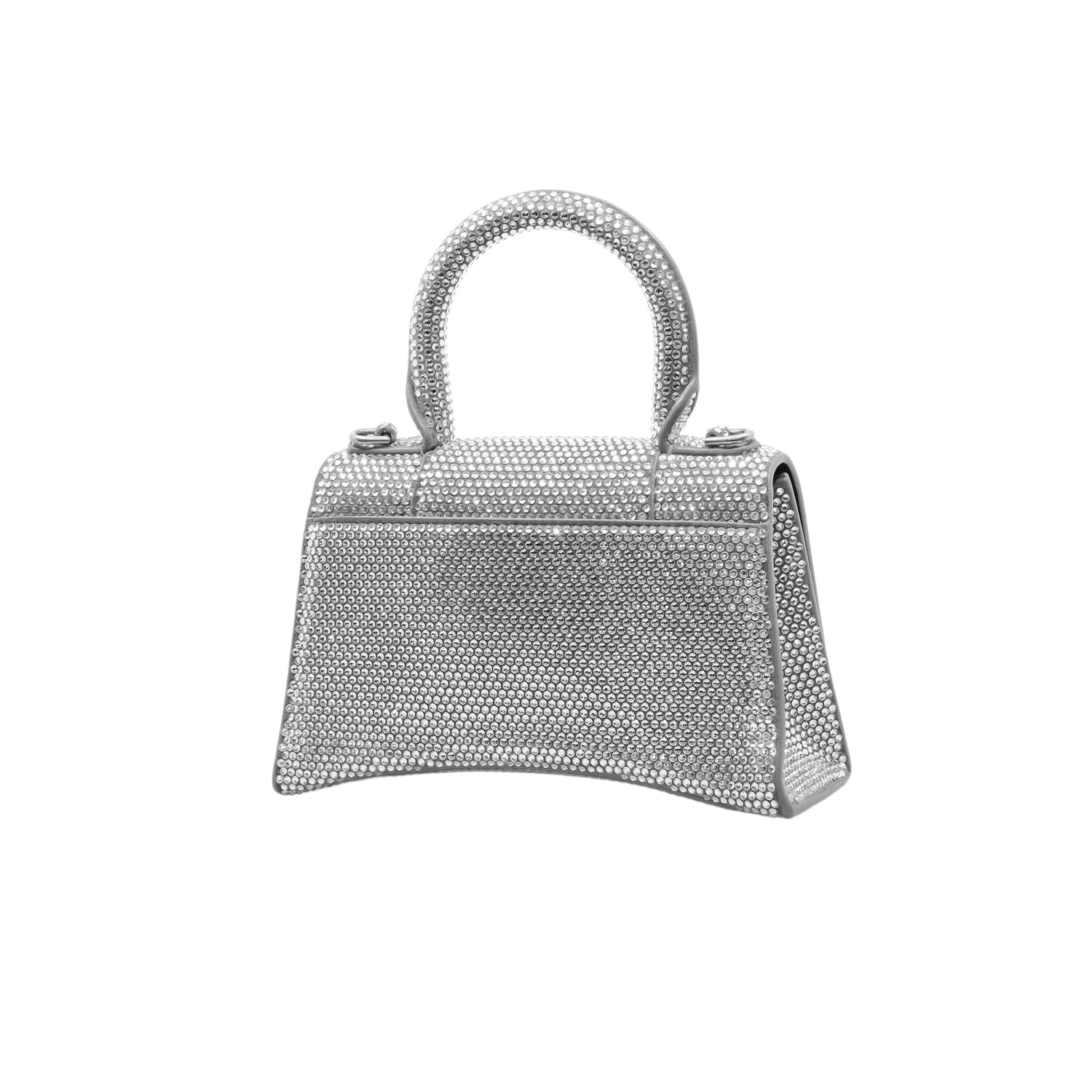 Bolso Balenciaga Hourglass Mini Crystal, confeccionado en piel de becerro y ante en color gris con pequeños cristales plateados en toda la superficie, cuenta con 1 asa rígida y strap de piel con cristales en los mismos colores, interior en piel color negro, con pequeñas manchas, herrajes en color plateado.