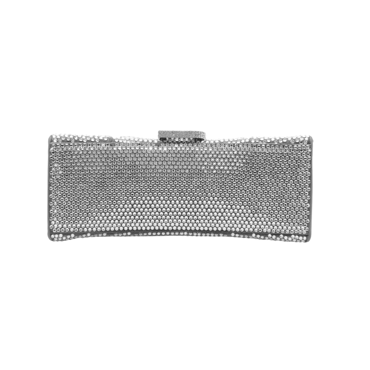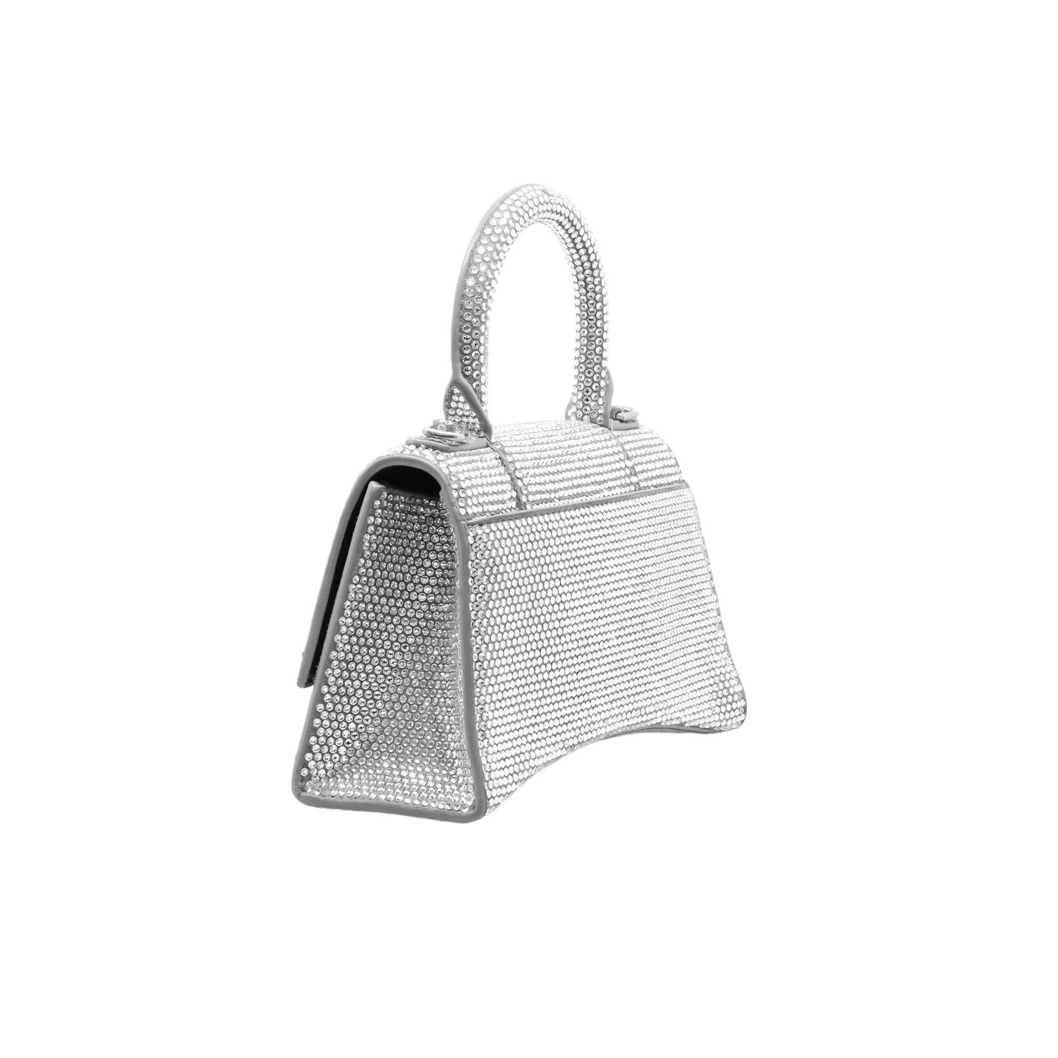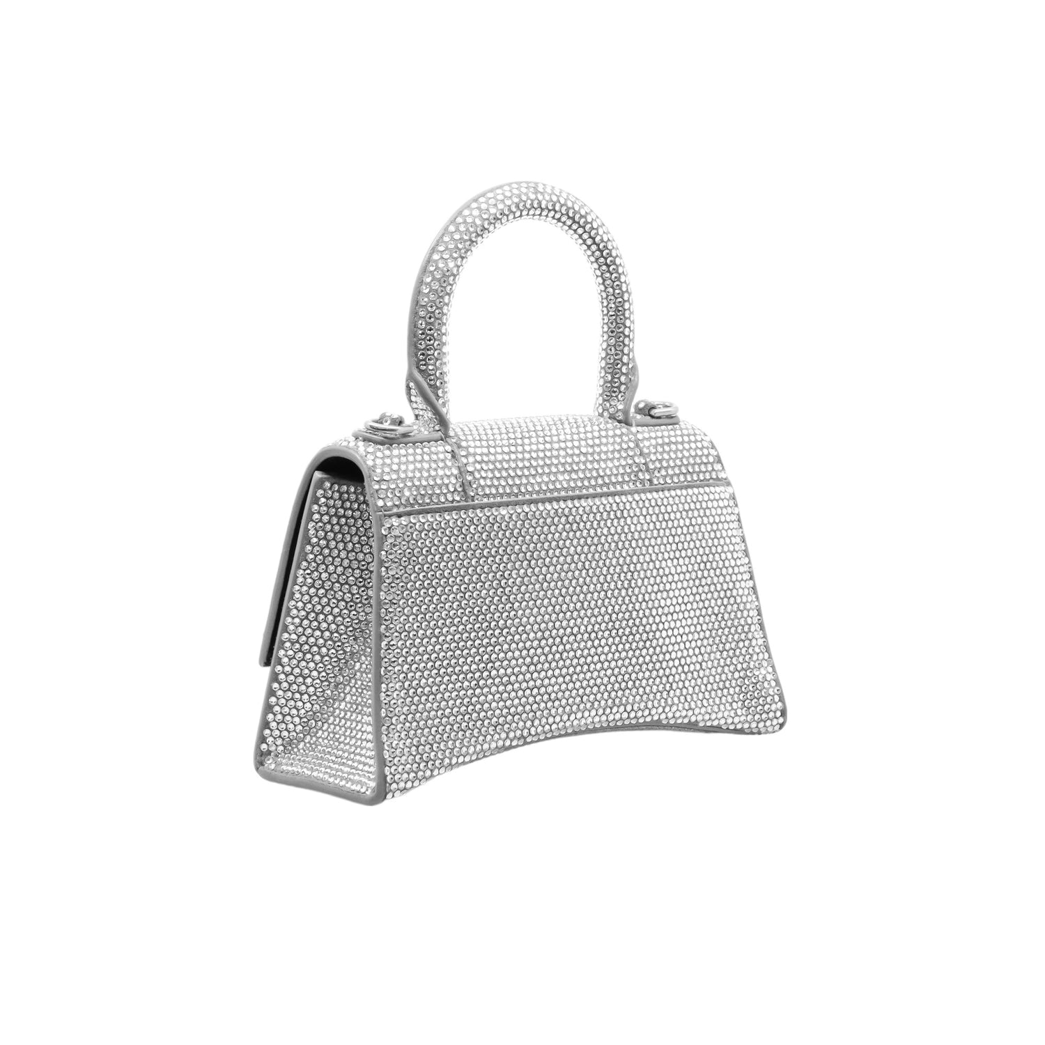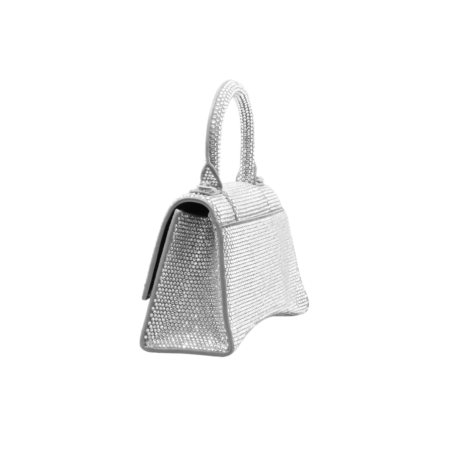 Bolso Balenciaga Hourglass Mini Crystal, confeccionado en piel de becerro y ante en color gris con pequeños cristales plateados en toda la superficie, cuenta con 1 asa rígida y strap de piel con cristales en los mismos colores, interior en piel color negro, con pequeñas manchas, herrajes en color plateado.