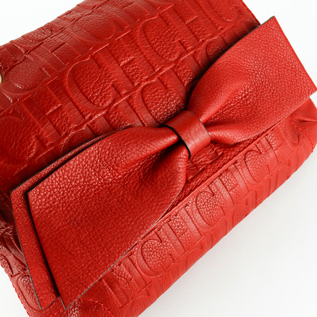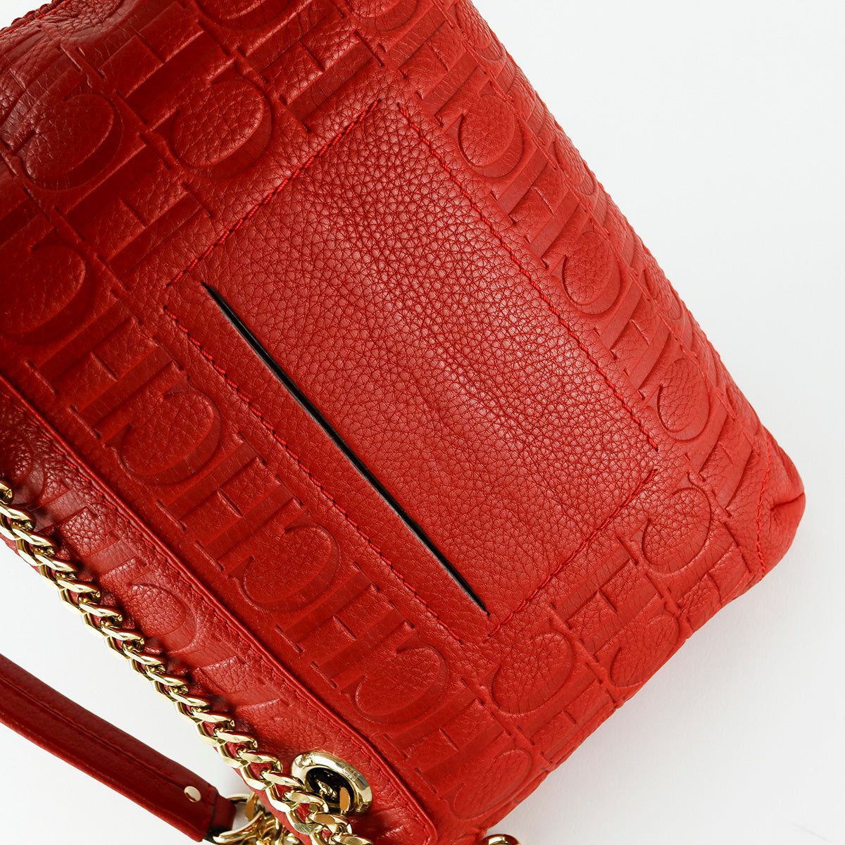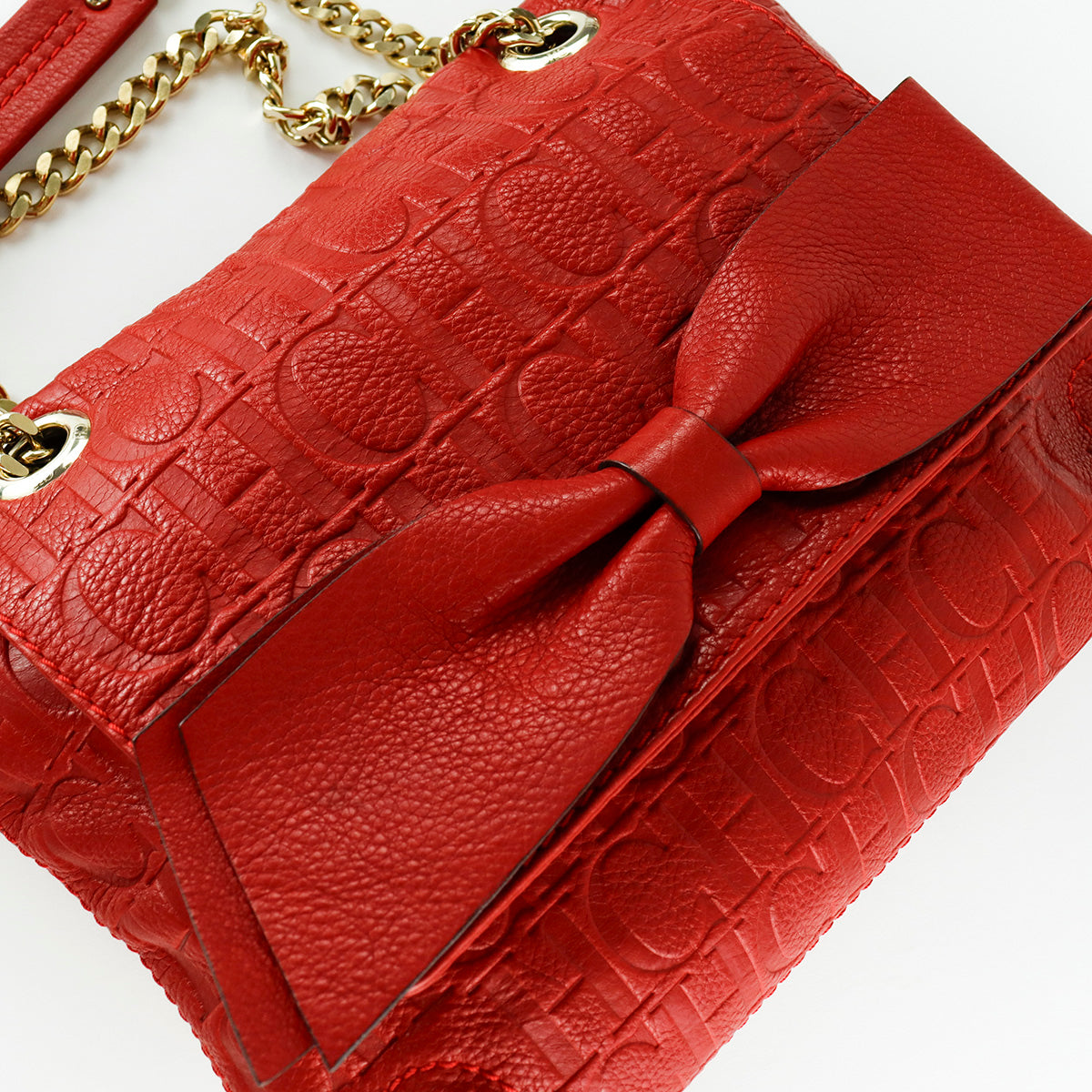 Bolsa Carolina Herrera de la línea Audrey, confeccionada en piel monogram en color rojo, asa con cadena deslizante color dorada, interior en textil beige con bolsillo tipo parche. Ligera mancha en la esquina inferior izquierda.