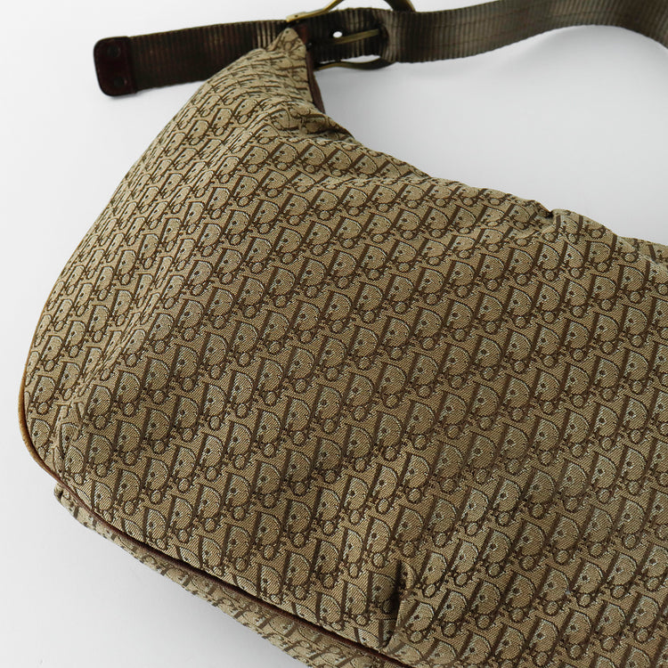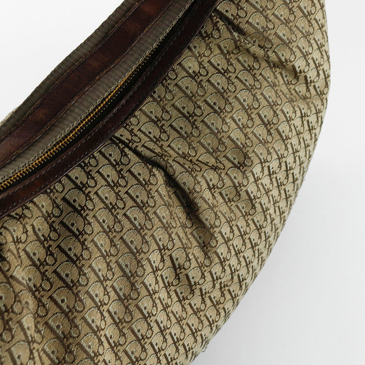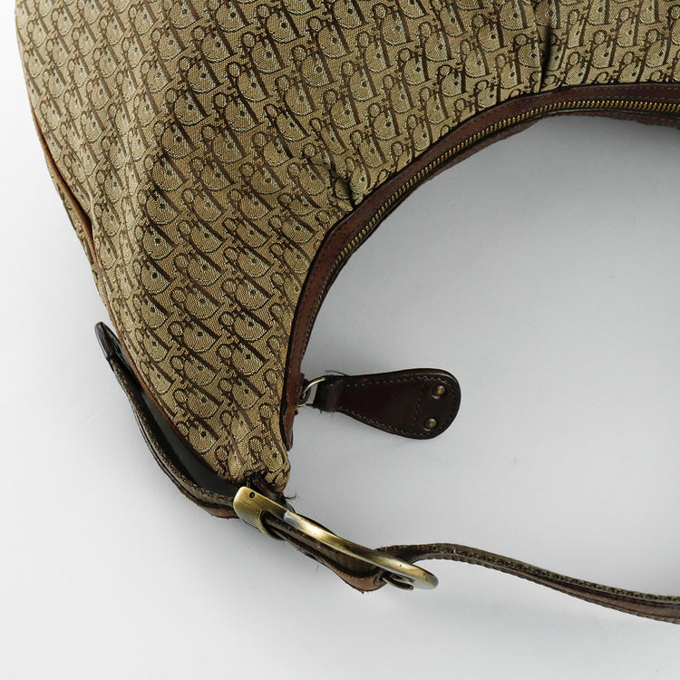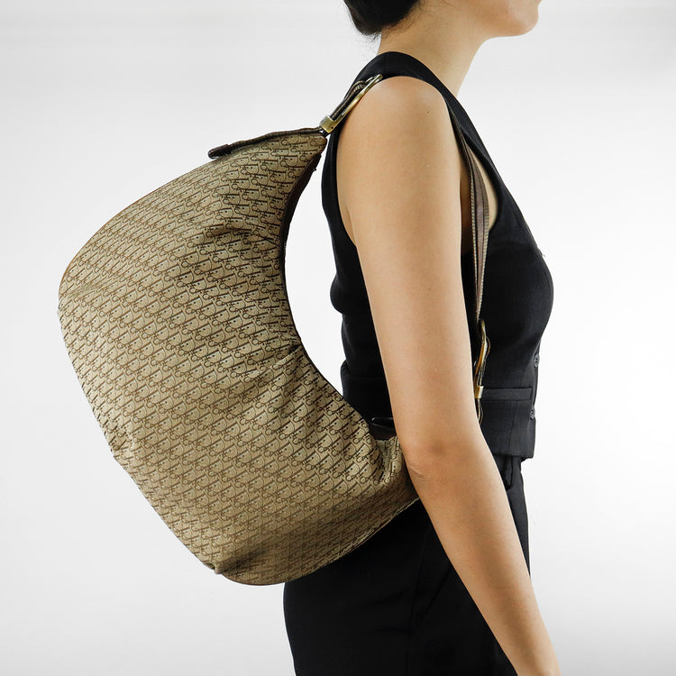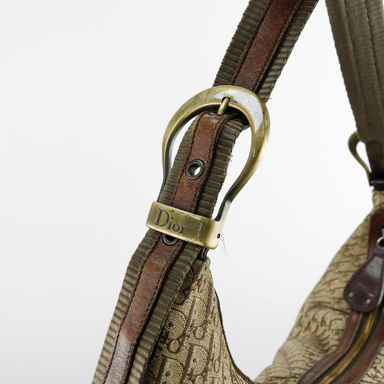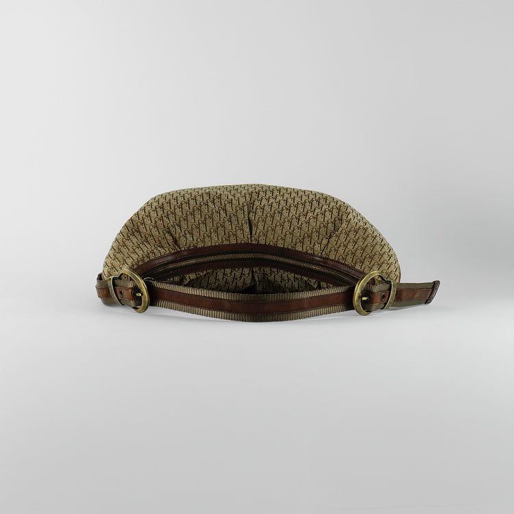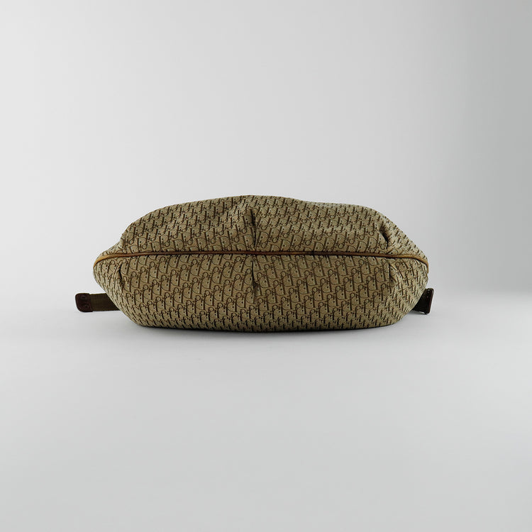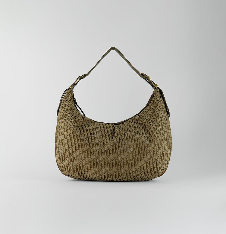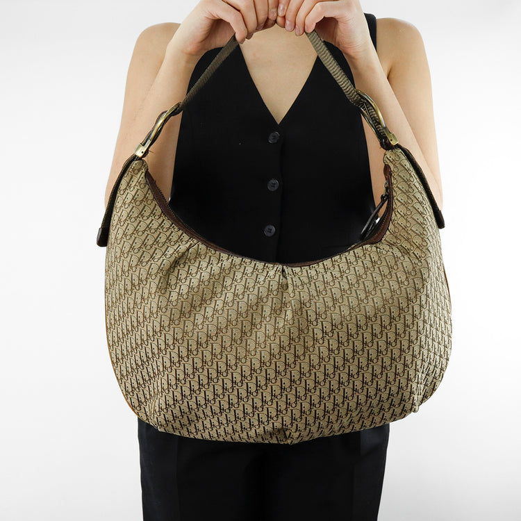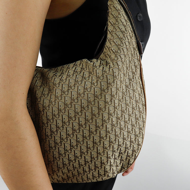 Bolso Christian Dior Ethnic Hobo, confeccionado en lienzo Monogram Oblique, con forro interno en textil, con asa ajustable y ribetes en piel con tela, con poco desgaste, herrajes en color bronce tipo vintage.