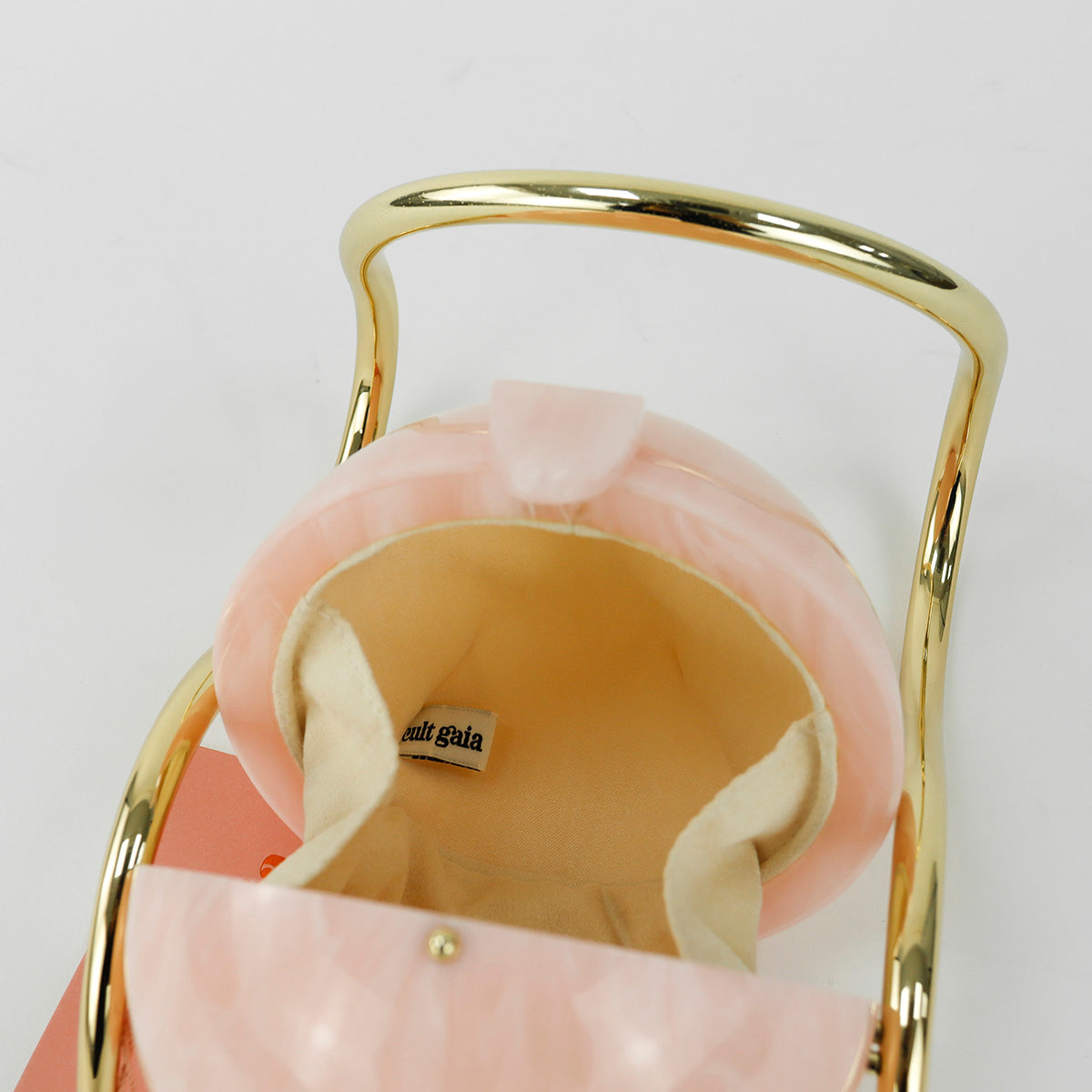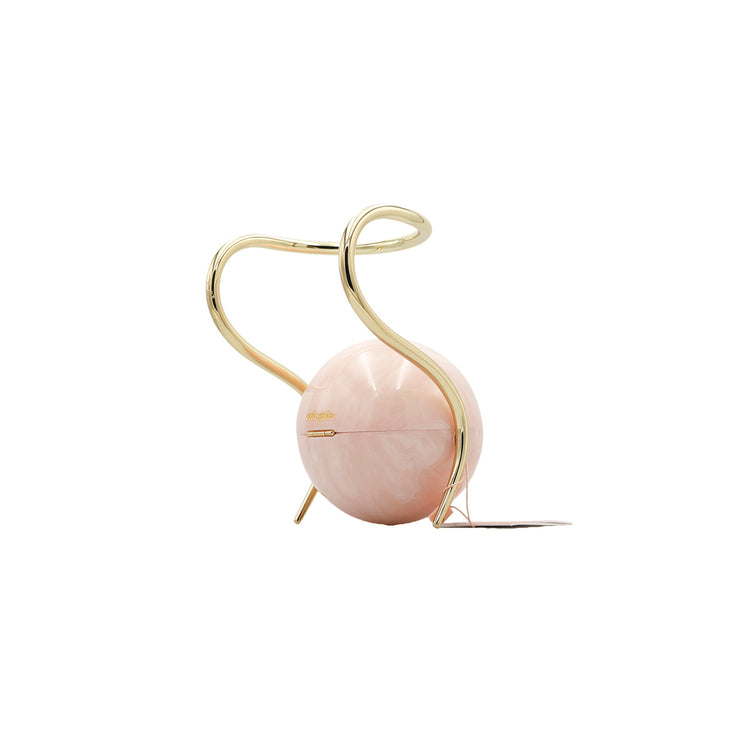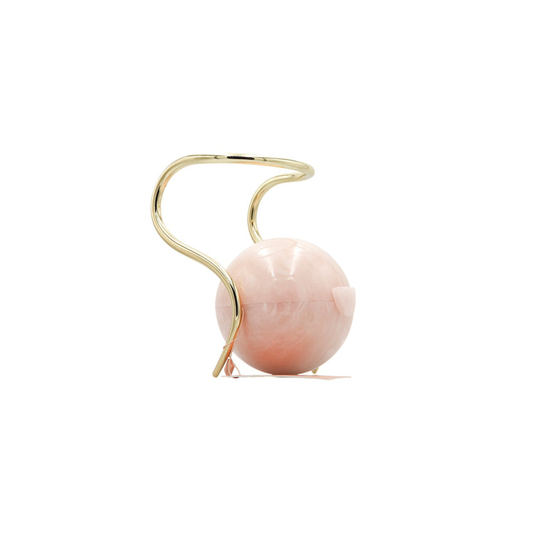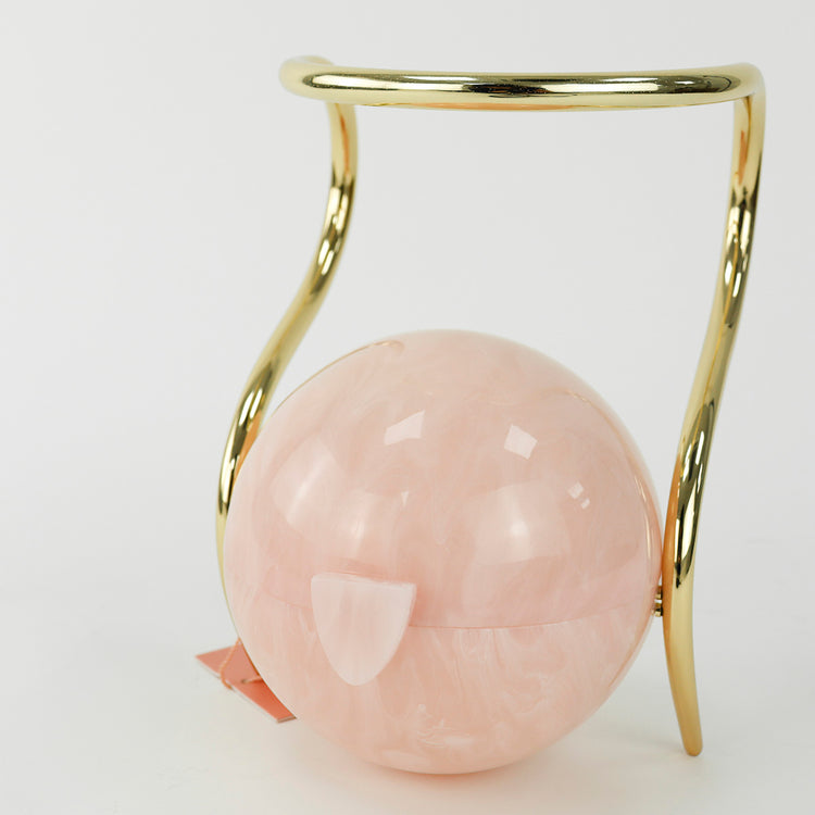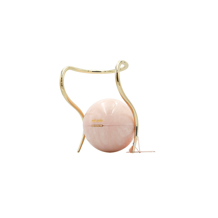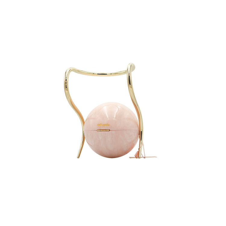 Bolso Cult Gaia de la línea Pearl, confeccionado en acrílico rosa efecto marmoleado, con broche frontal e interior de tela color beige, asa oblicua en herraje dorado.