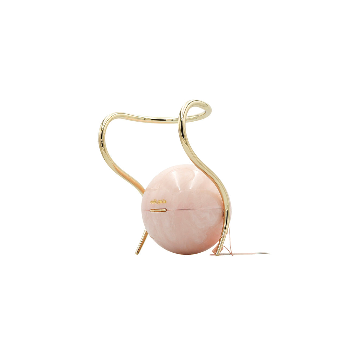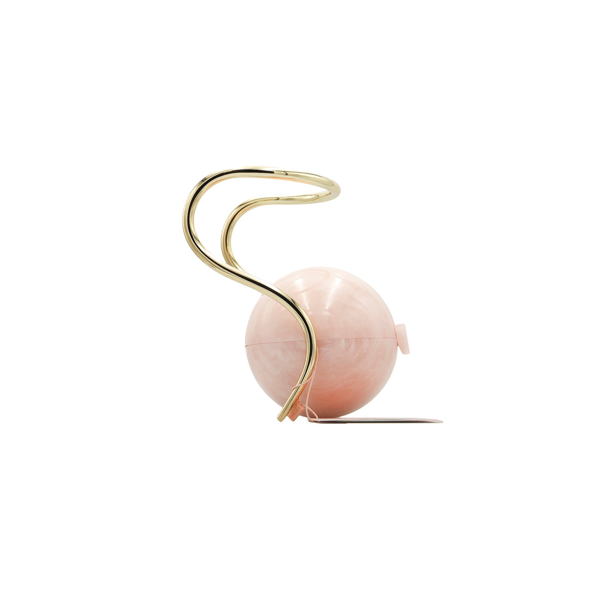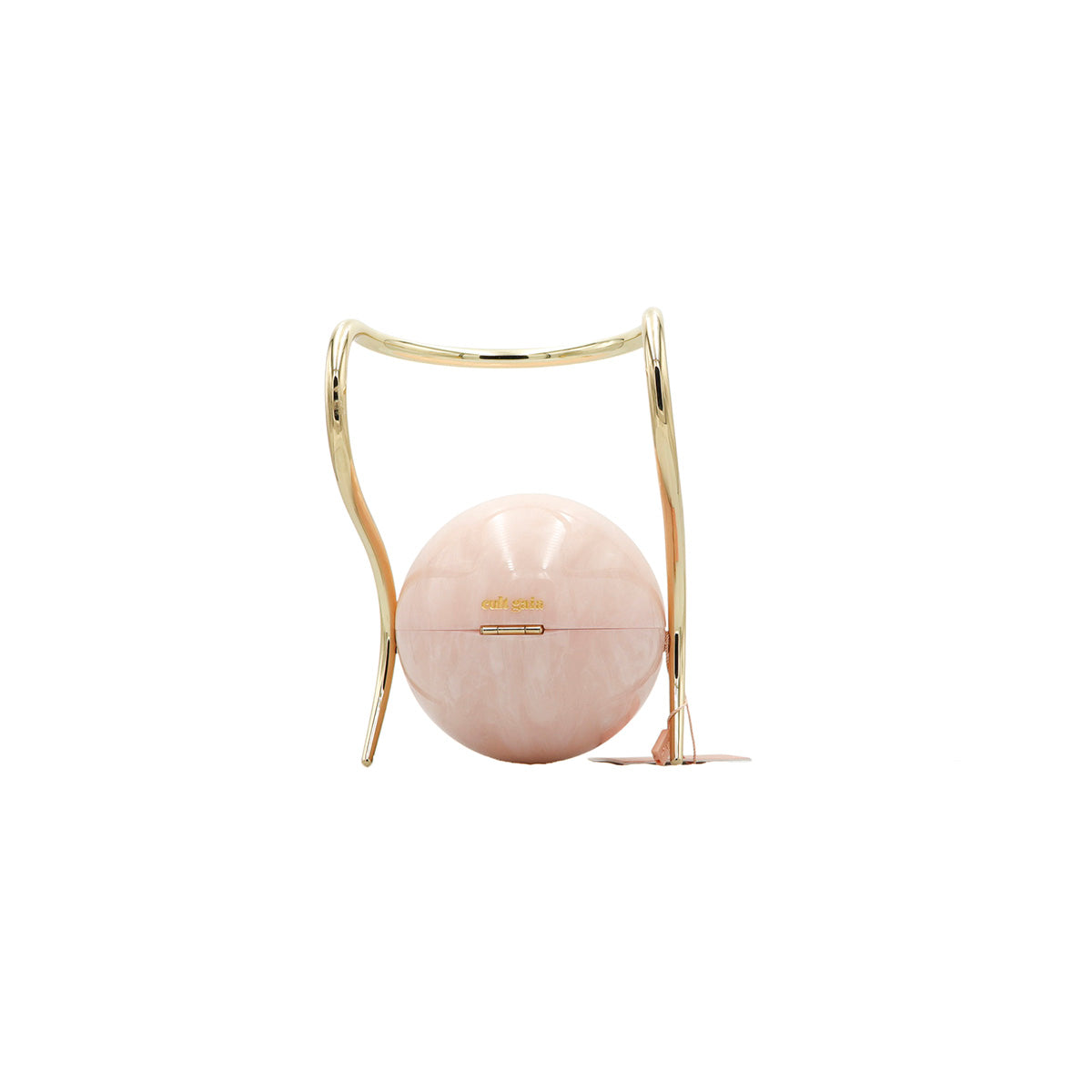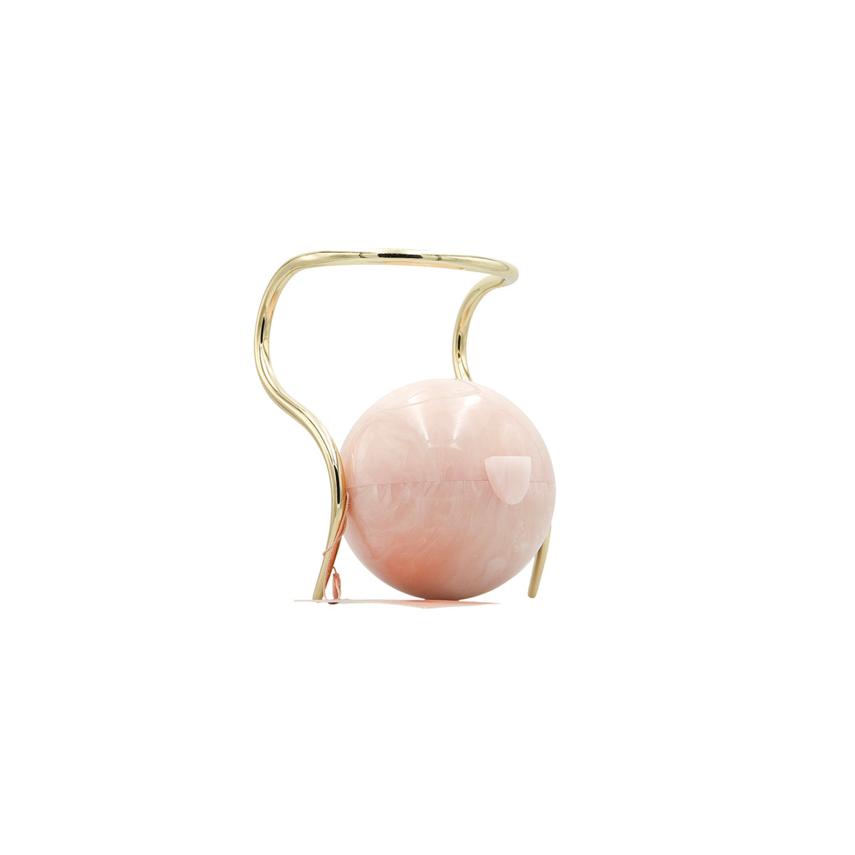 Bolso Cult Gaia de la línea Pearl, confeccionado en acrílico rosa efecto marmoleado, con broche frontal e interior de tela color beige, asa oblicua en herraje dorado.