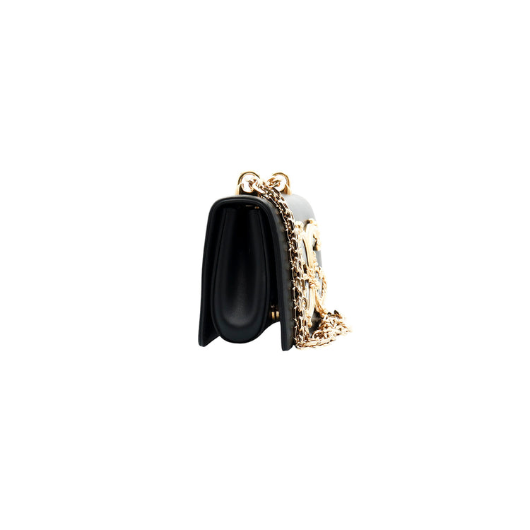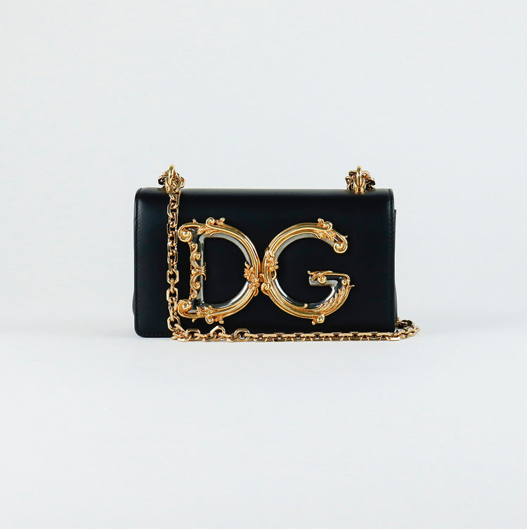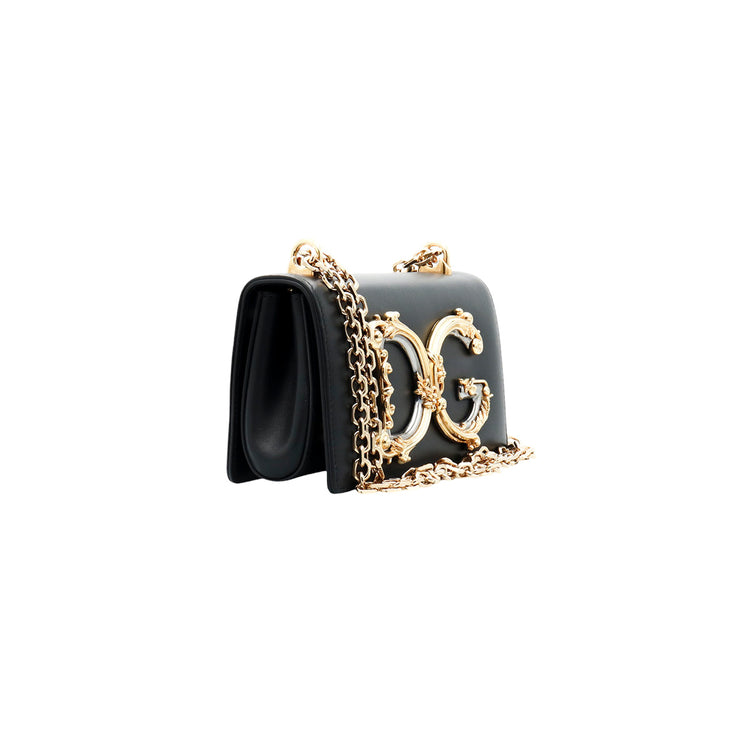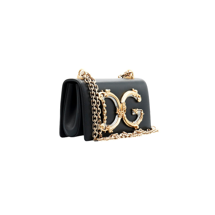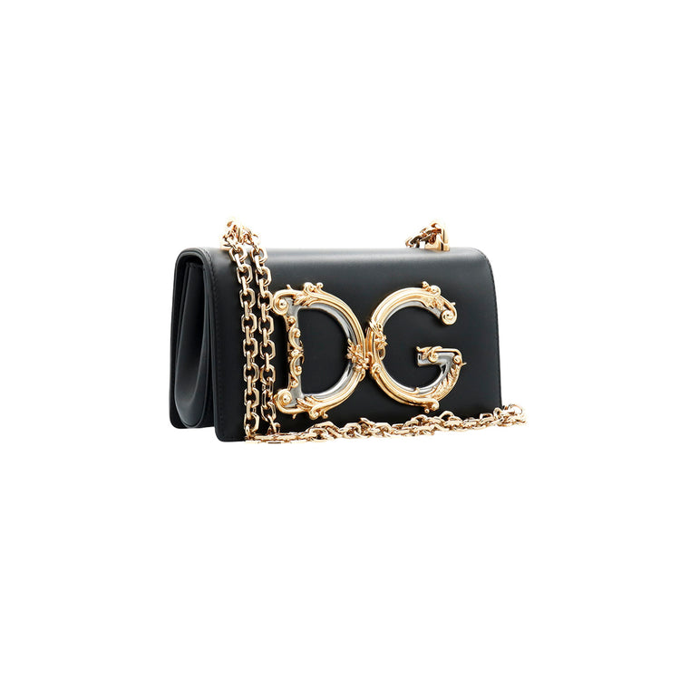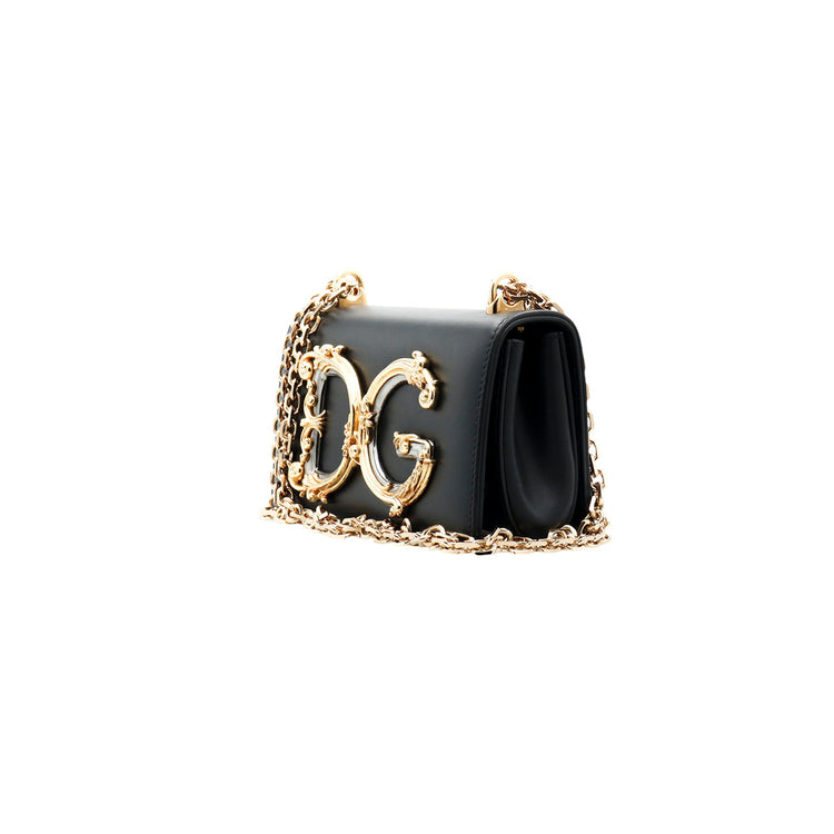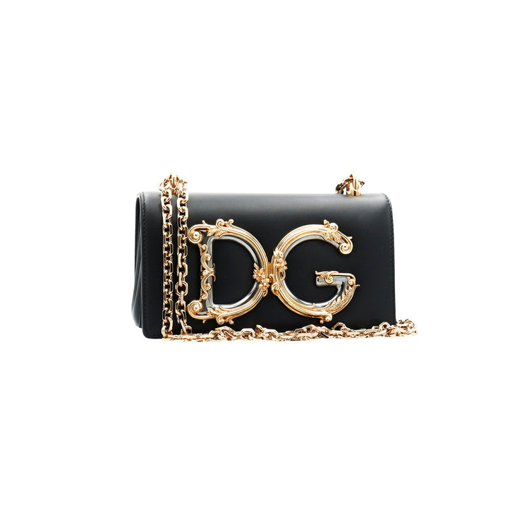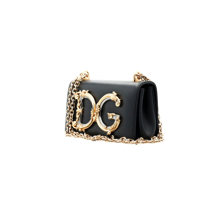 Bolso Dolce & Gabbana de la colección DG Girls en su versión nano, confeccionado en piel de becerro liso color negro, ideal para llevar los objetos más esenciales, solapa con el logotipo DG en estilo barroco en combinación de metales tipo envejecidos así como correa en color dorado.