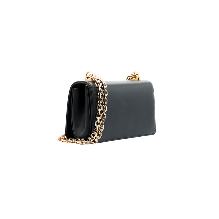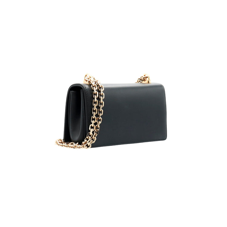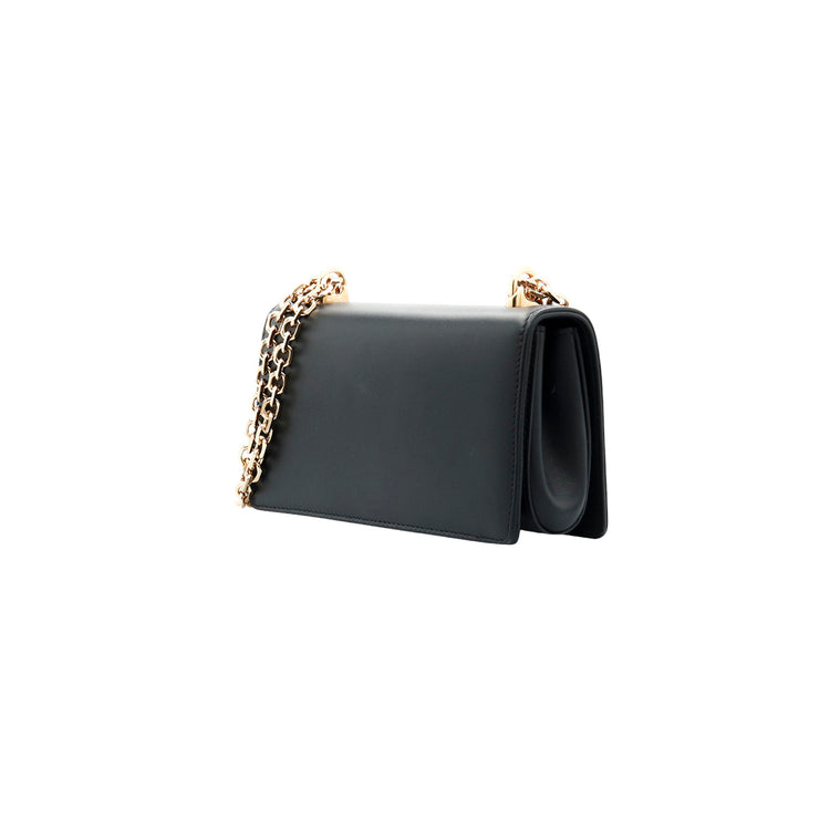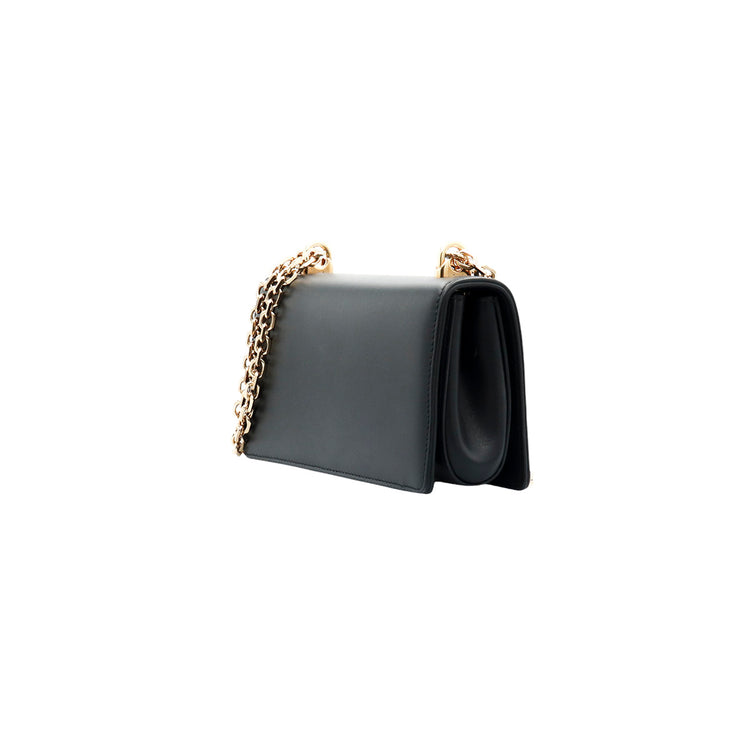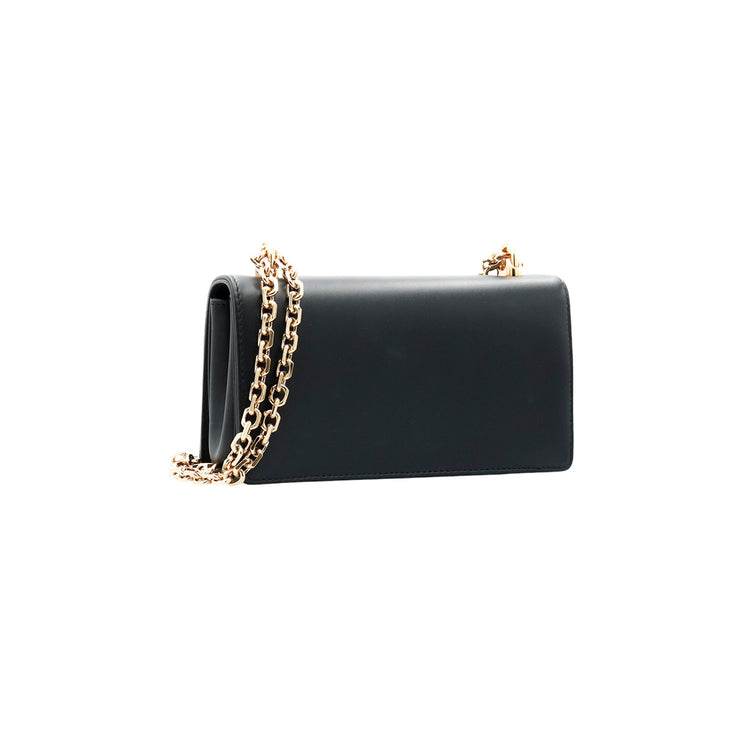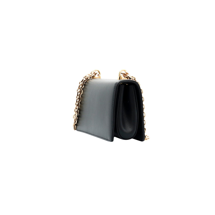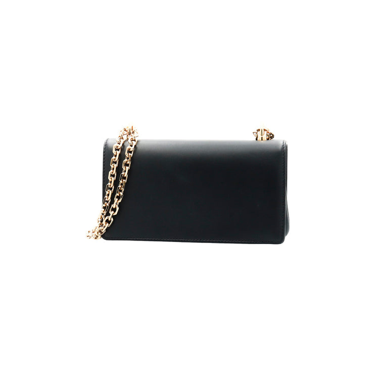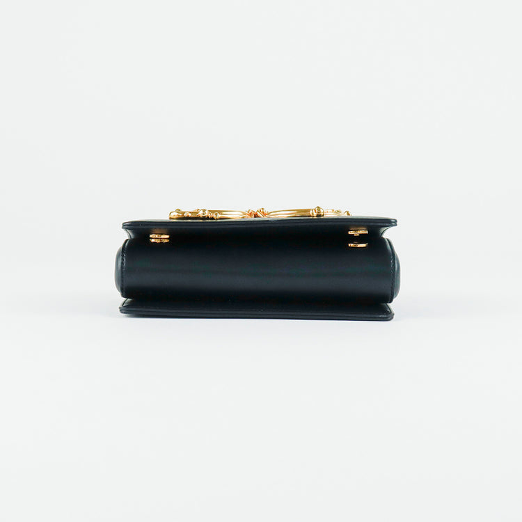 Bolso Dolce & Gabbana de la colección DG Girls en su versión nano, confeccionado en piel de becerro liso color negro, ideal para llevar los objetos más esenciales, solapa con el logotipo DG en estilo barroco en combinación de metales tipo envejecidos así como correa en color dorado.