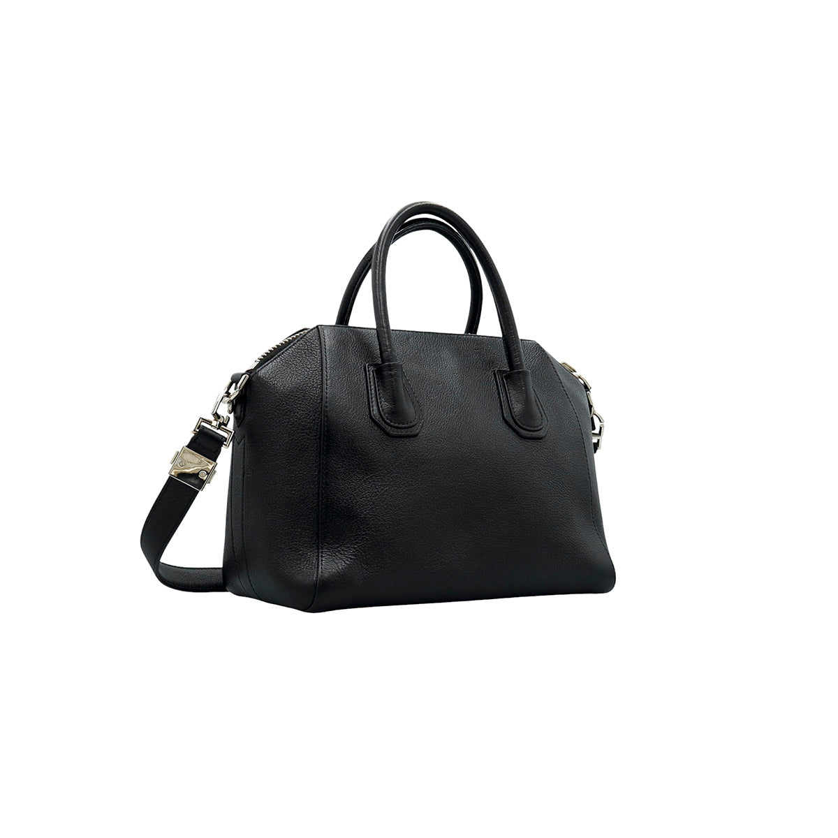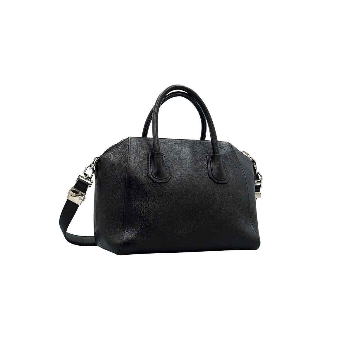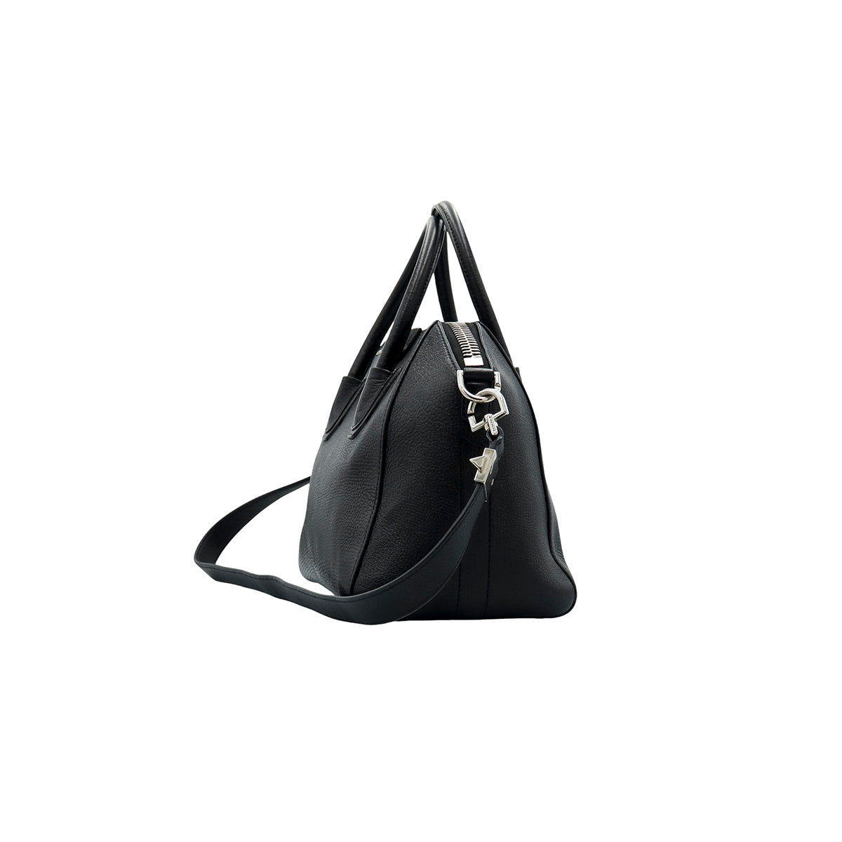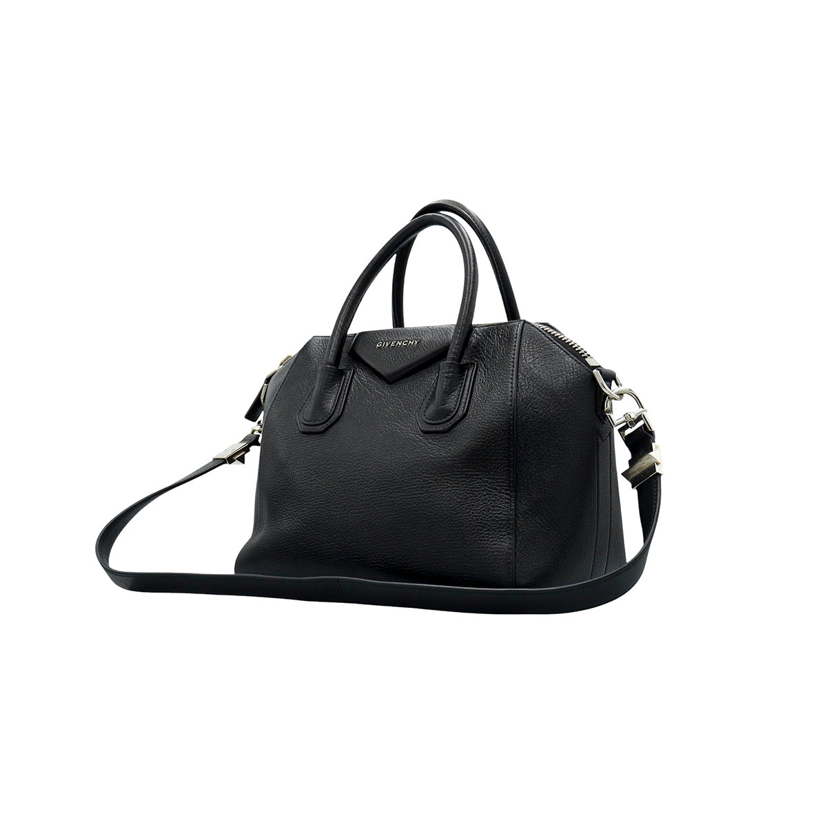Bolso Givenchy Antígona, confeccionado en piel granulada de cabra color negro, con dos asas y bandolera ajustable para usar al hombro o cruzada, logotipo en metal plateado, interior forrado en tela del mismo tono negro , bolsillos planos interiores y cierre tipo cremallera.