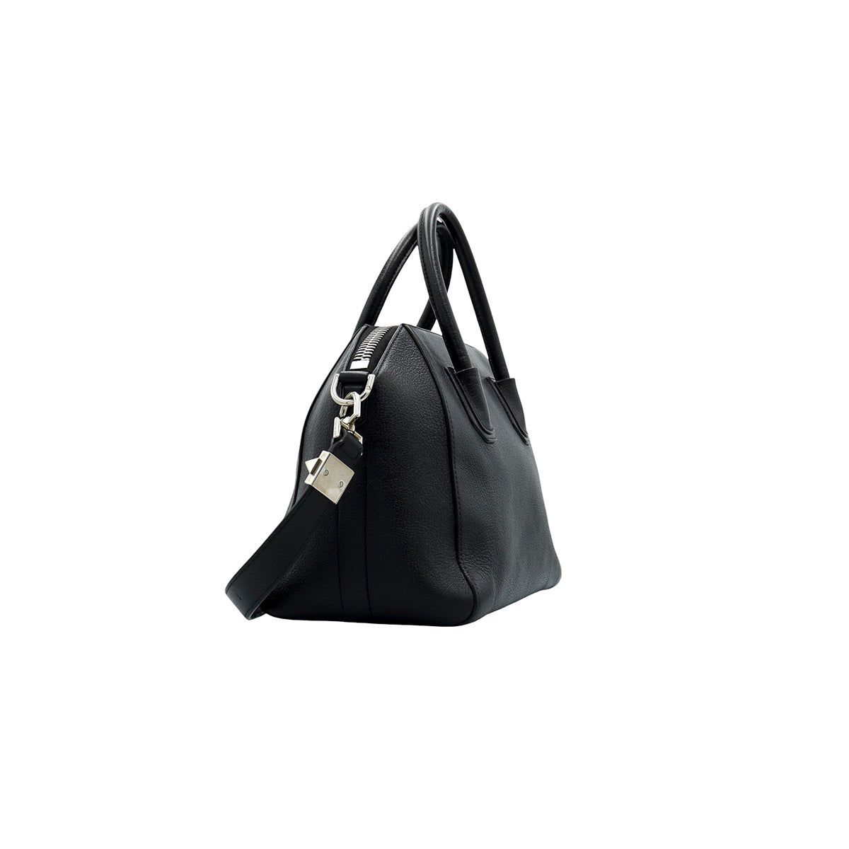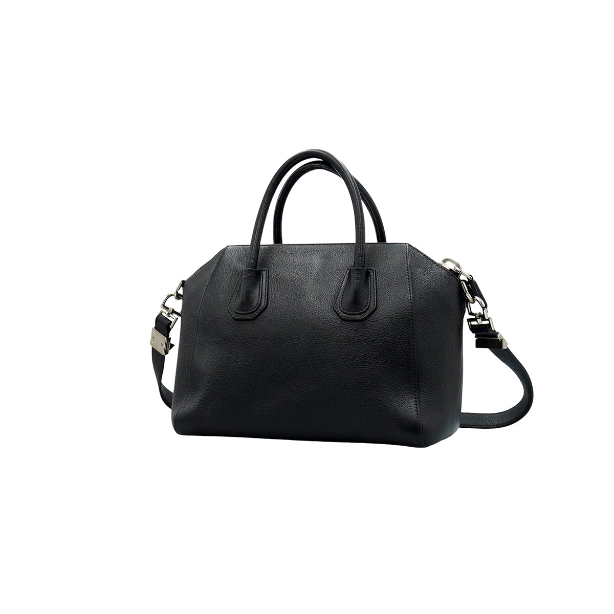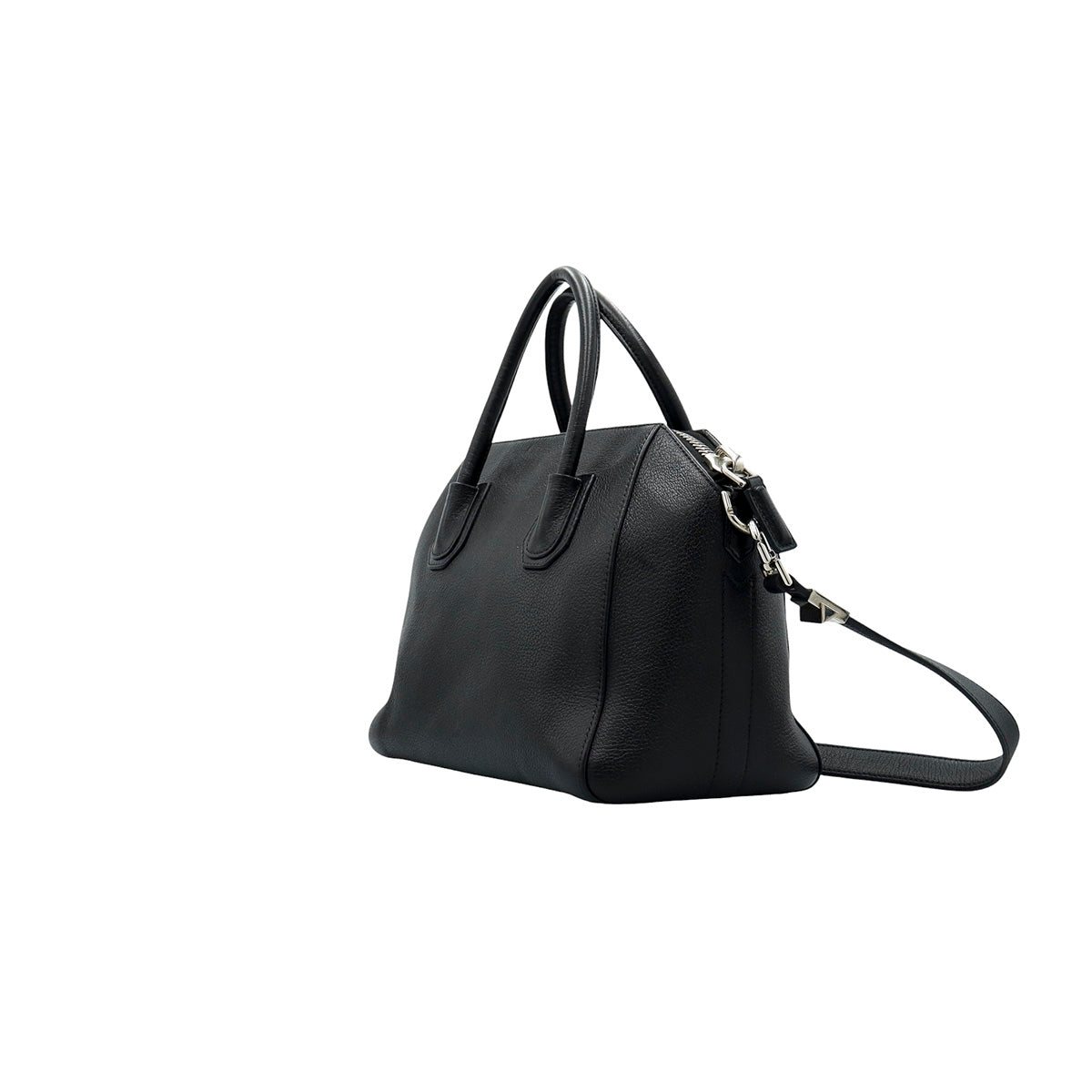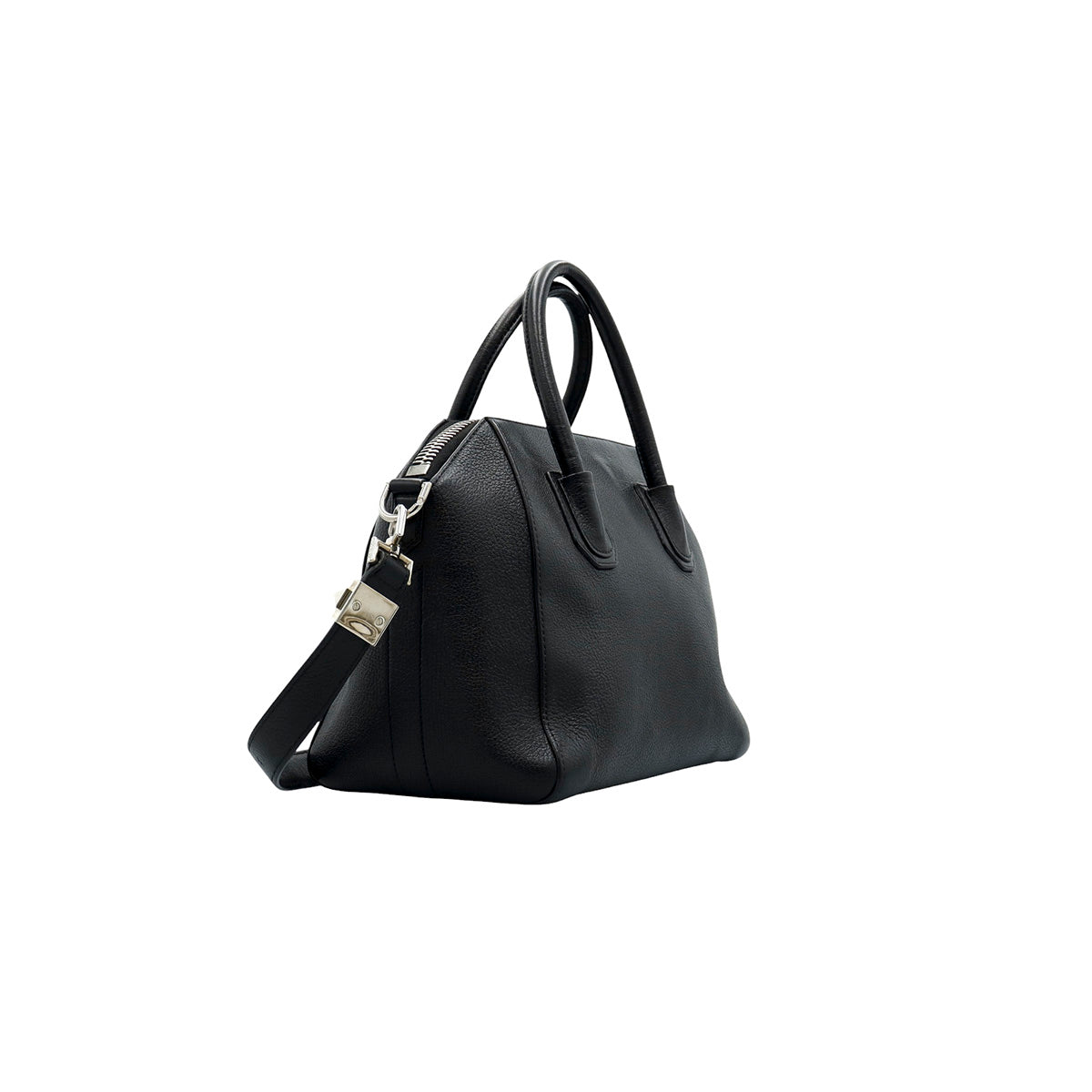 Bolso Givenchy Antígona, confeccionado en piel granulada de cabra color negro, con dos asas y bandolera ajustable para usar al hombro o cruzada, logotipo en metal plateado, interior forrado en tela del mismo tono negro , bolsillos planos interiores y cierre tipo cremallera.