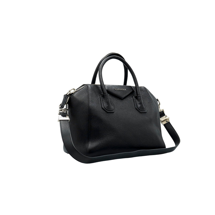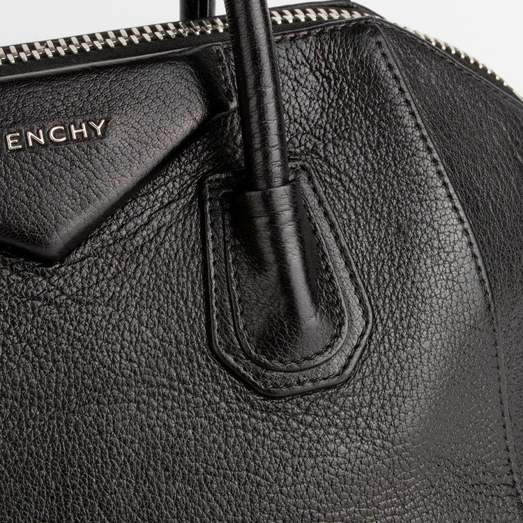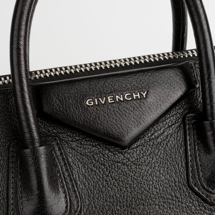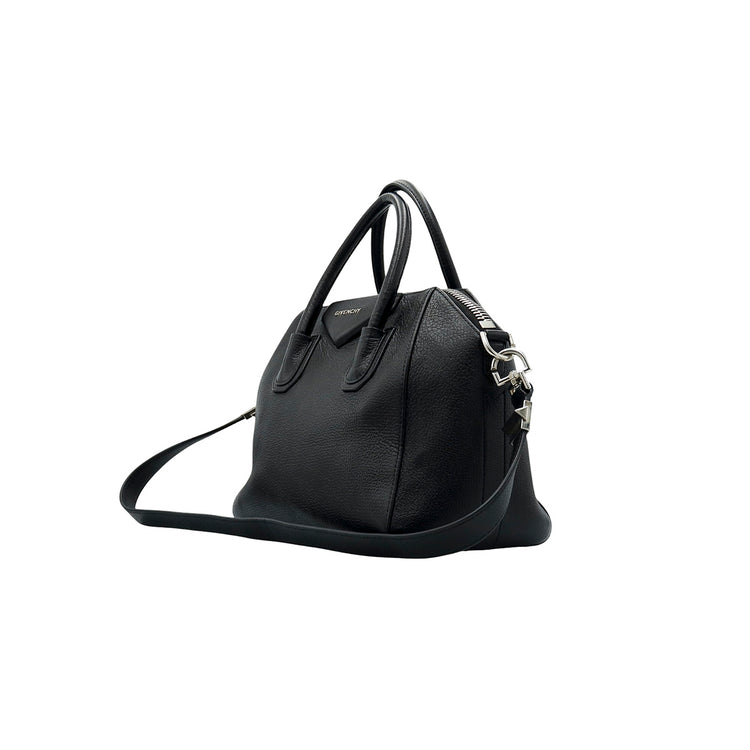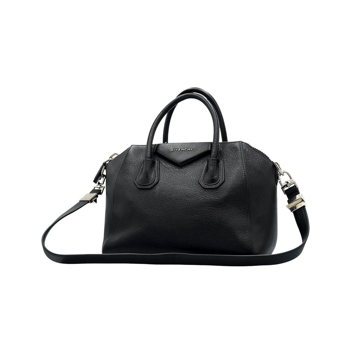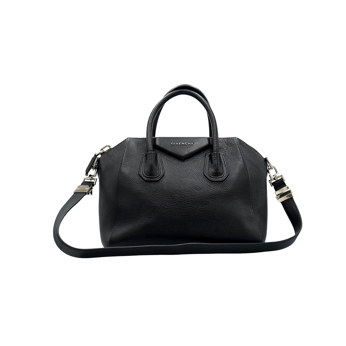 Bolso Givenchy Antígona, confeccionado en piel granulada de cabra color negro, con dos asas y bandolera ajustable para usar al hombro o cruzada, logotipo en metal plateado, interior forrado en tela del mismo tono negro , bolsillos planos interiores y cierre tipo cremallera.