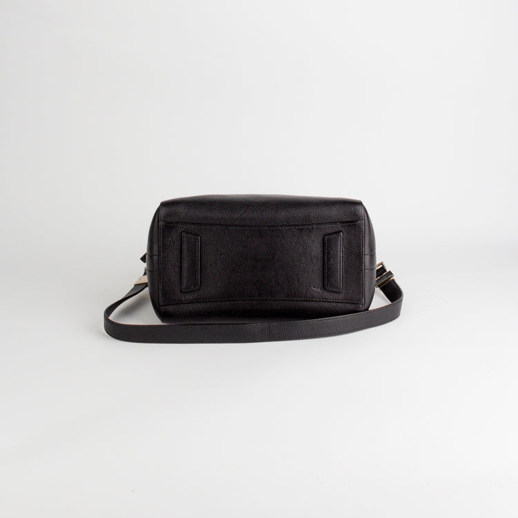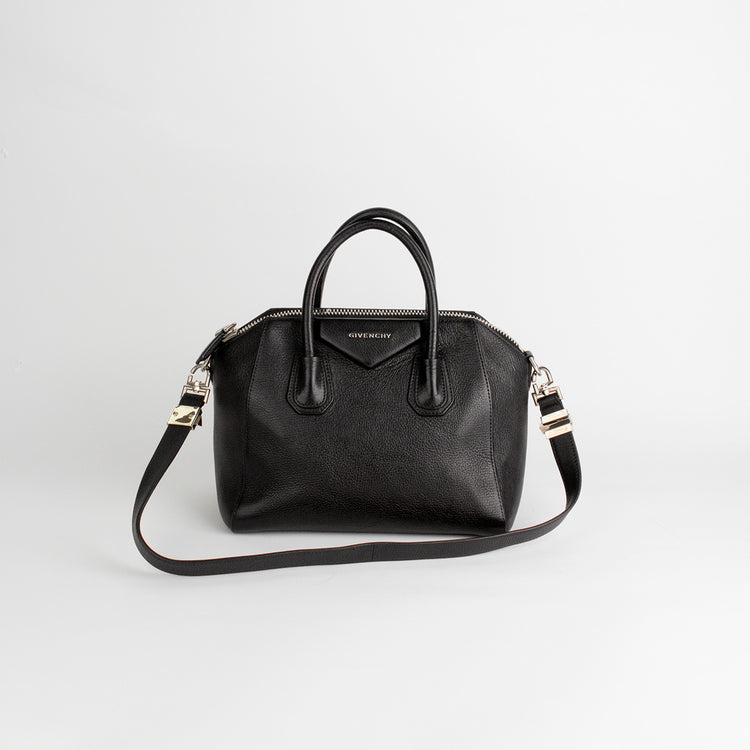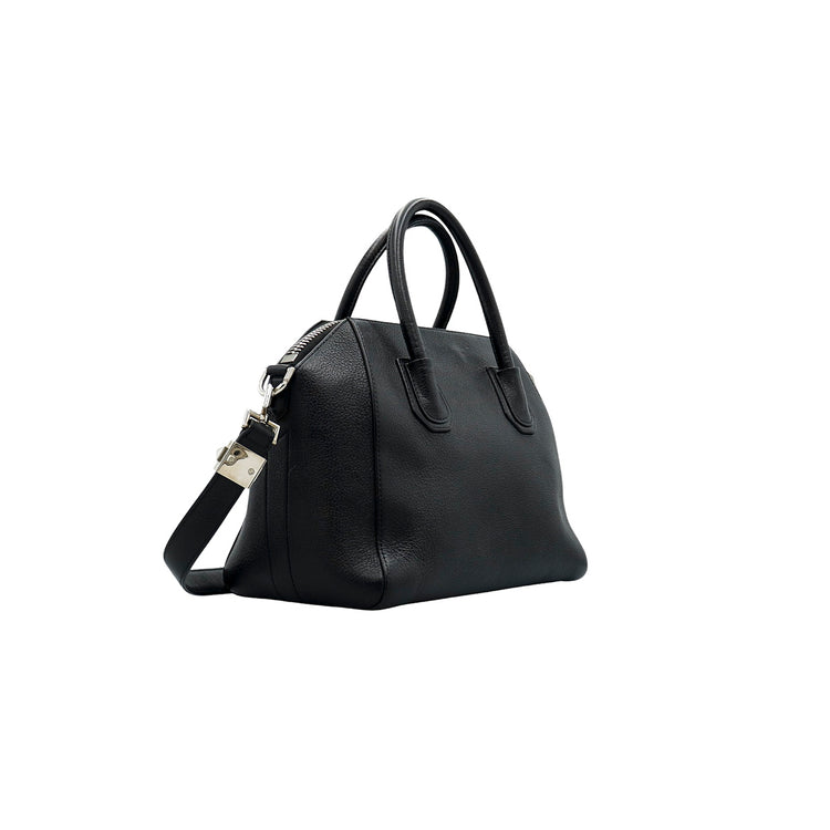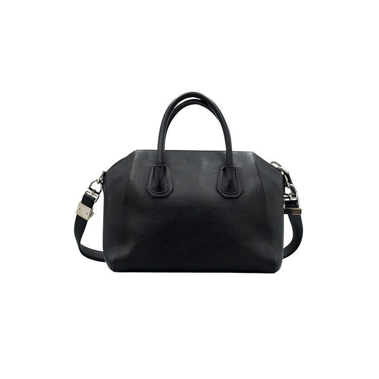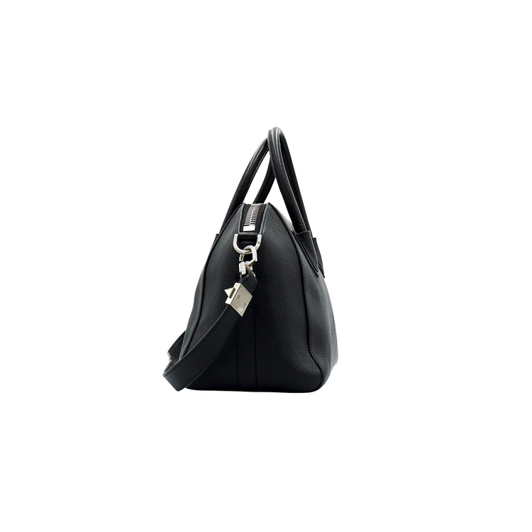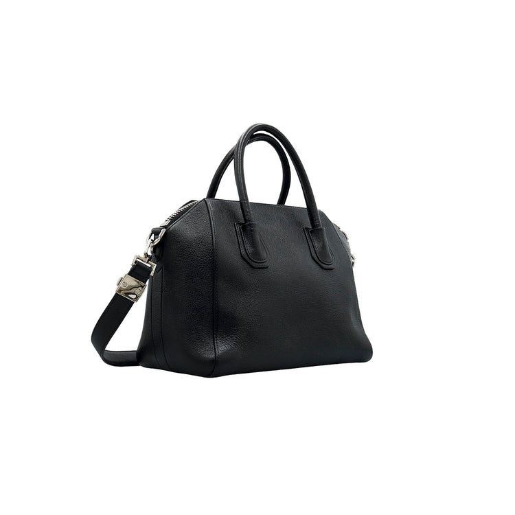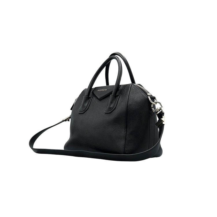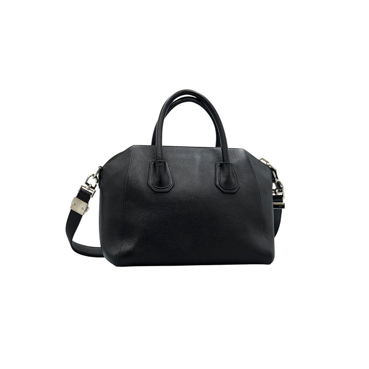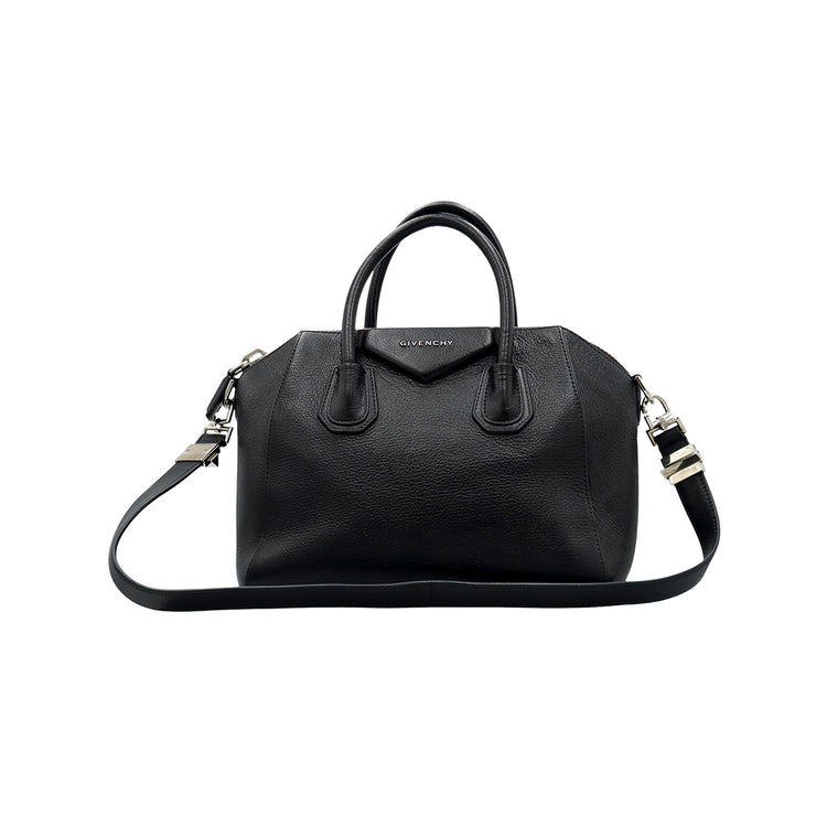 Bolso Givenchy Antígona, confeccionado en piel granulada de cabra color negro, con dos asas y bandolera ajustable para usar al hombro o cruzada, logotipo en metal plateado, interior forrado en tela del mismo tono negro , bolsillos planos interiores y cierre tipo cremallera.