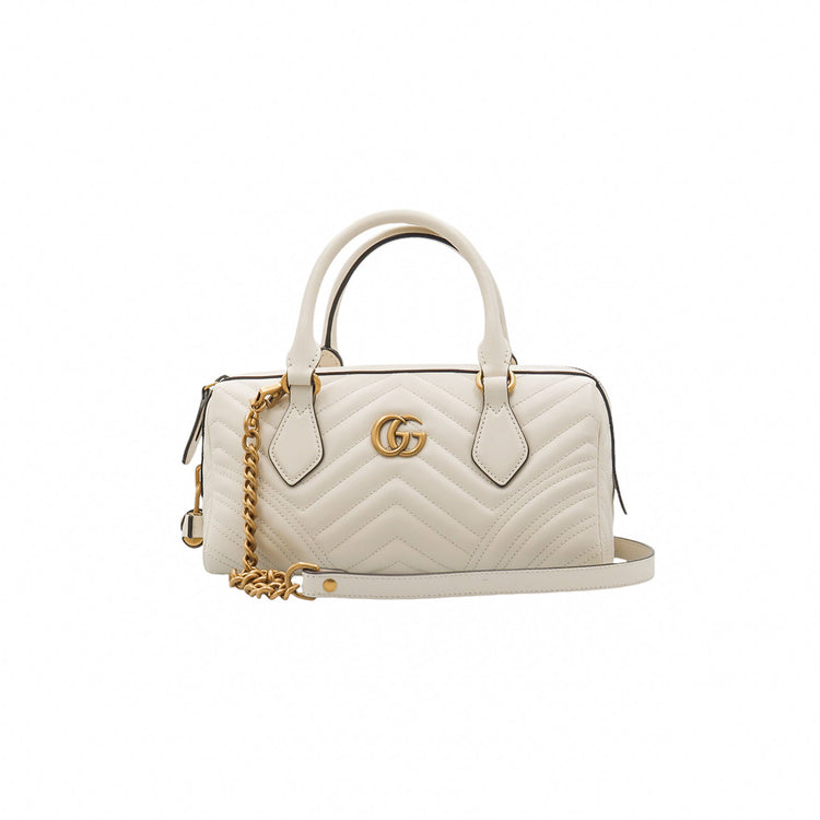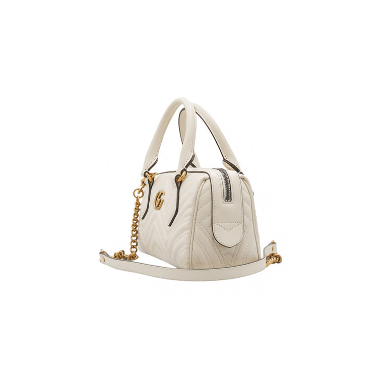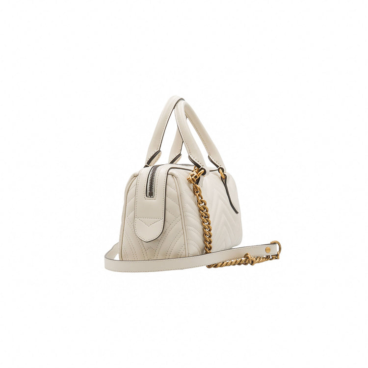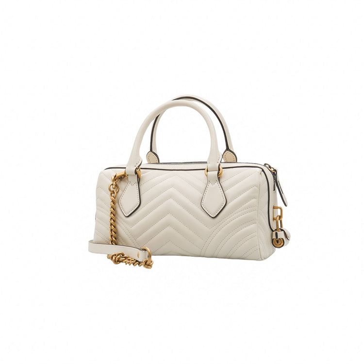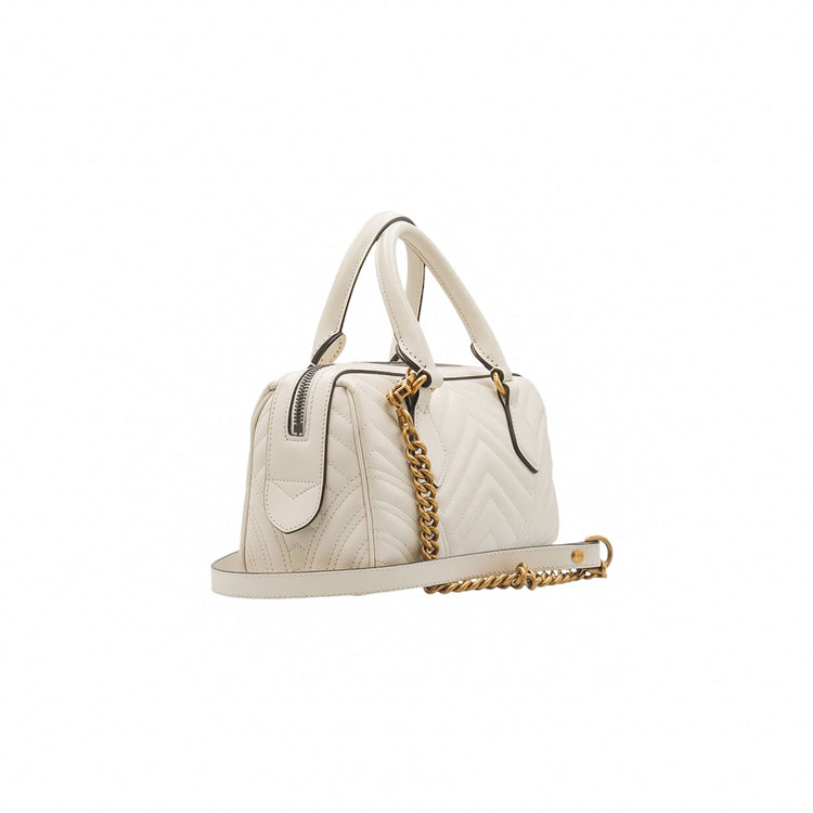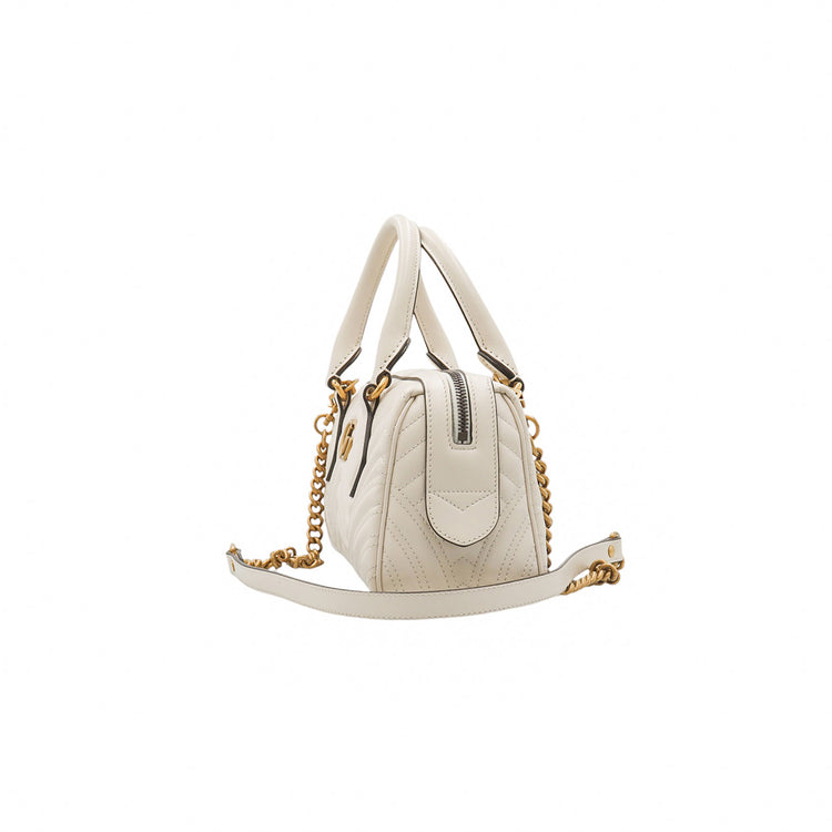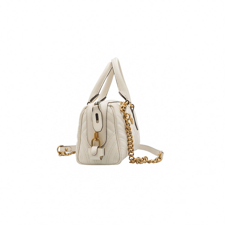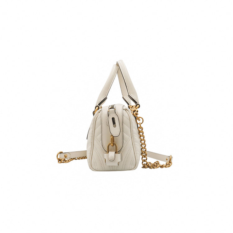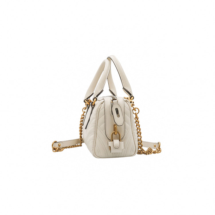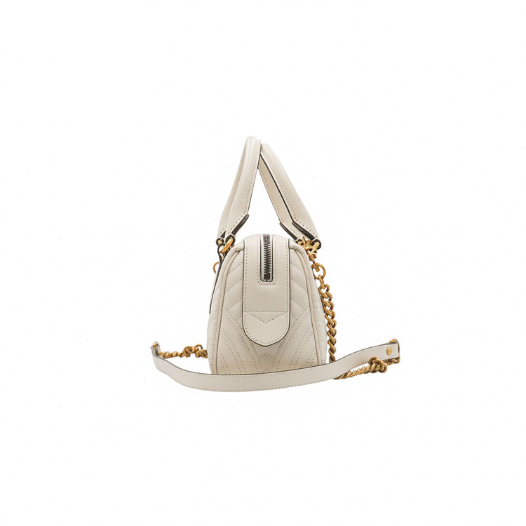 Pequeño bolso Gucci de la línea Marmont confeccionado en piel acolchada color beige, decorado con el emblemático logo GG y herrajes en color dorado, forro interno con acabado tipo ante, cuenta con 2 asas rígidas y correa extraíble para llevar al hombro o cruzada,
