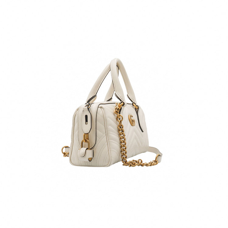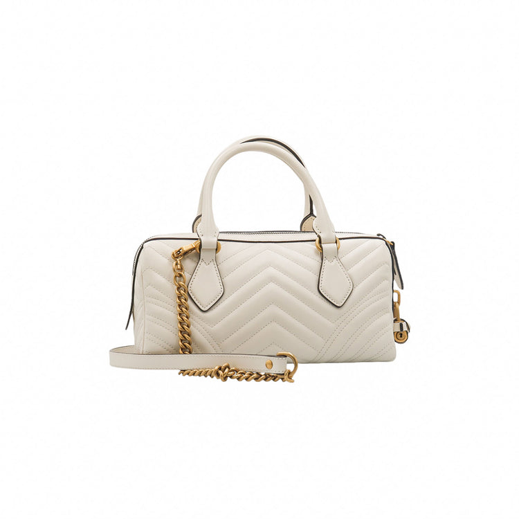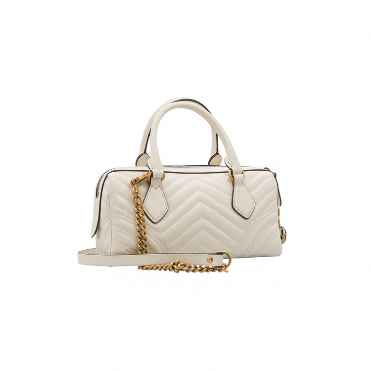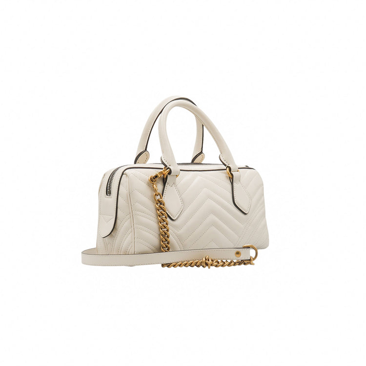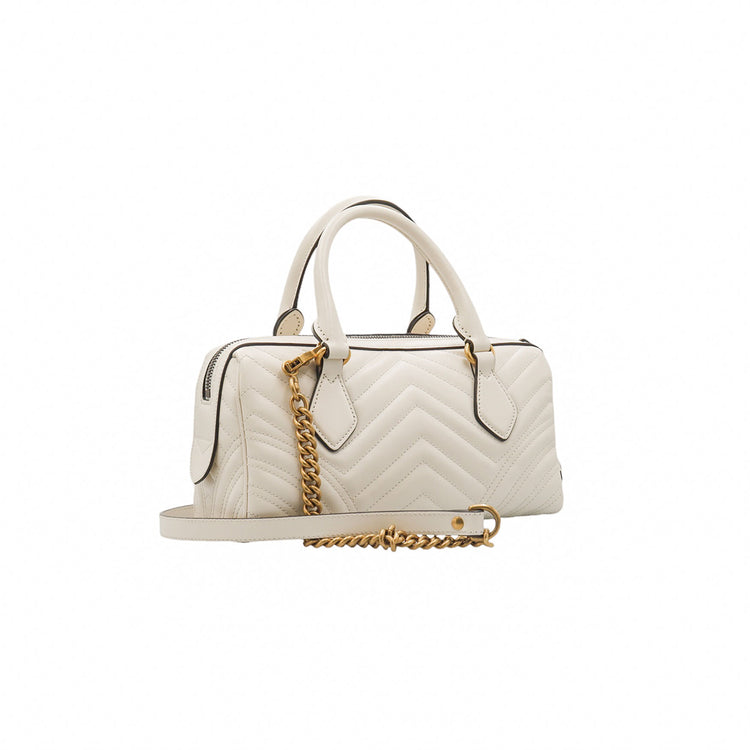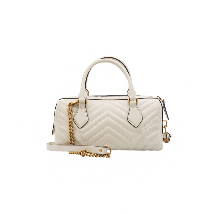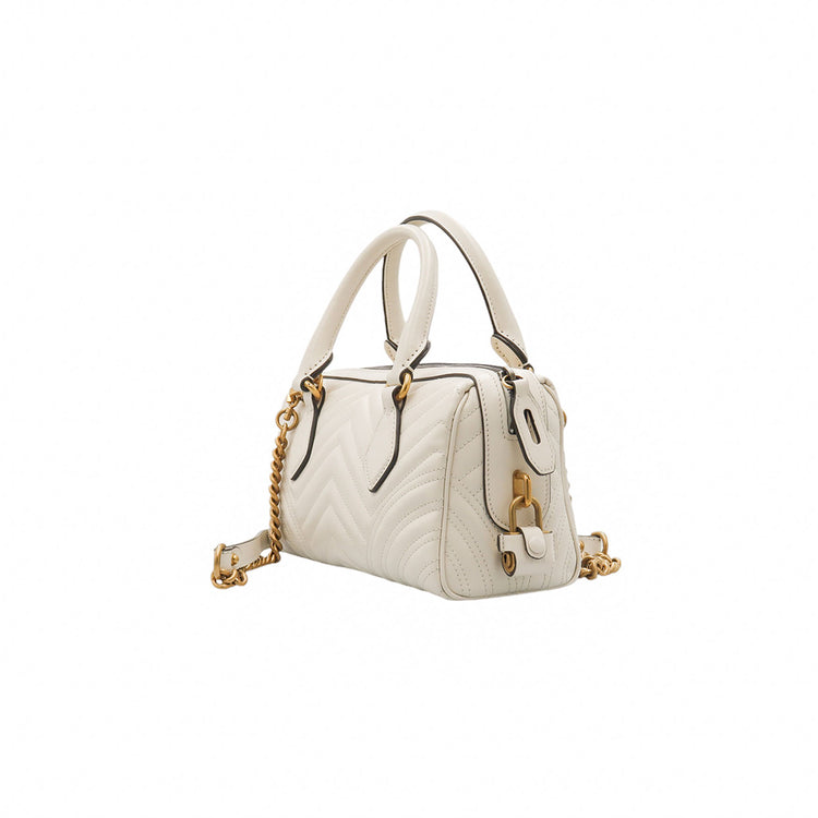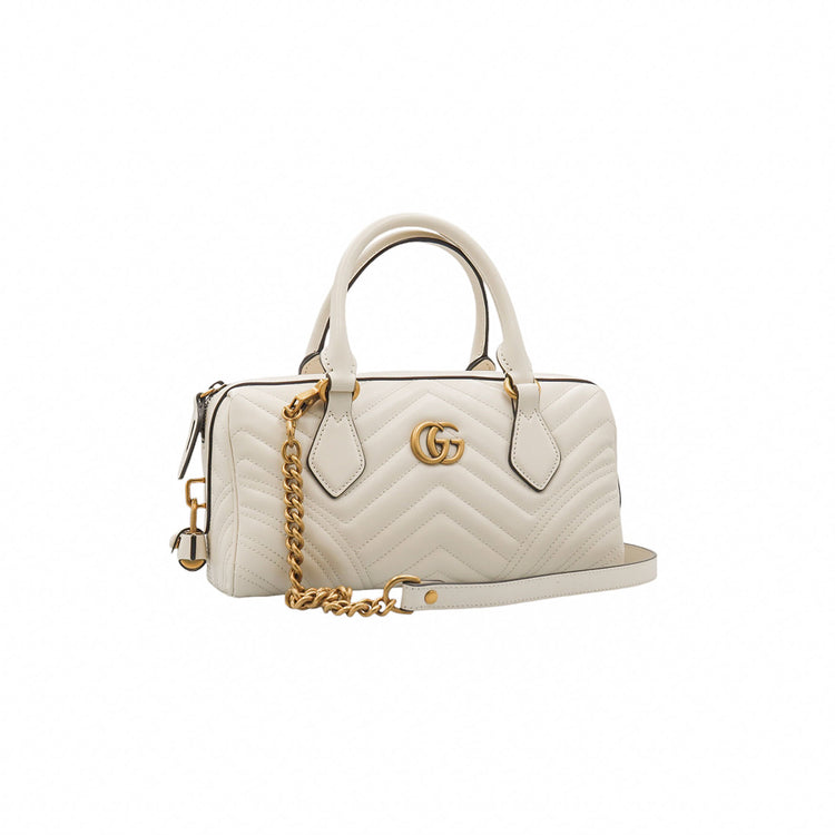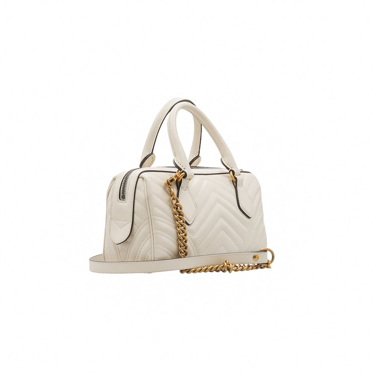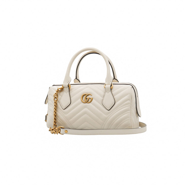 Pequeño bolso Gucci de la línea Marmont confeccionado en piel acolchada color beige, decorado con el emblemático logo GG y herrajes en color dorado, forro interno con acabado tipo ante, cuenta con 2 asas rígidas y correa extraíble para llevar al hombro o cruzada,