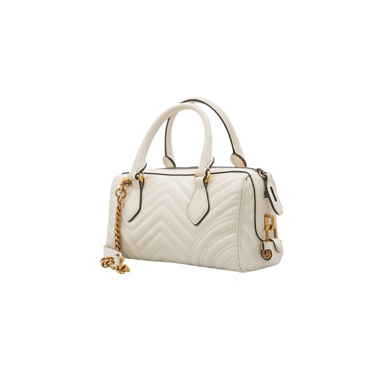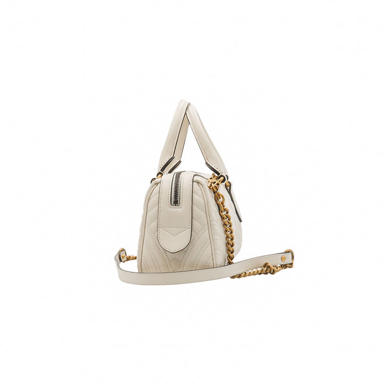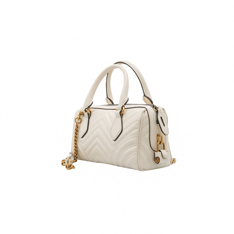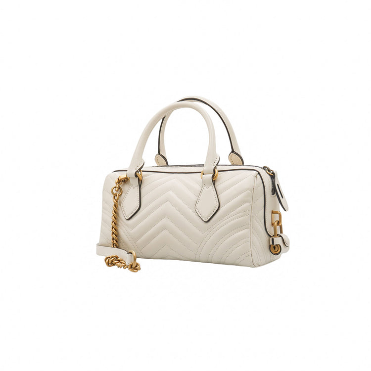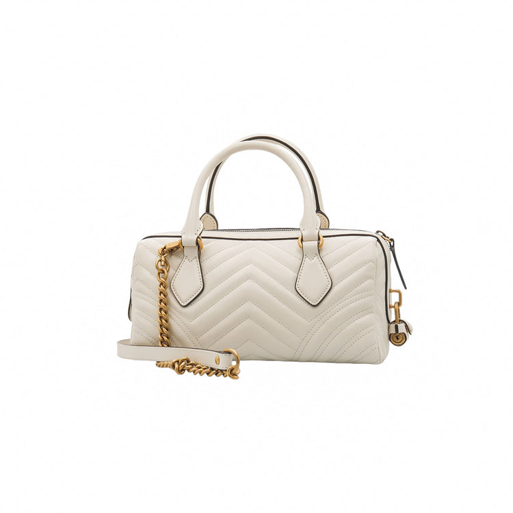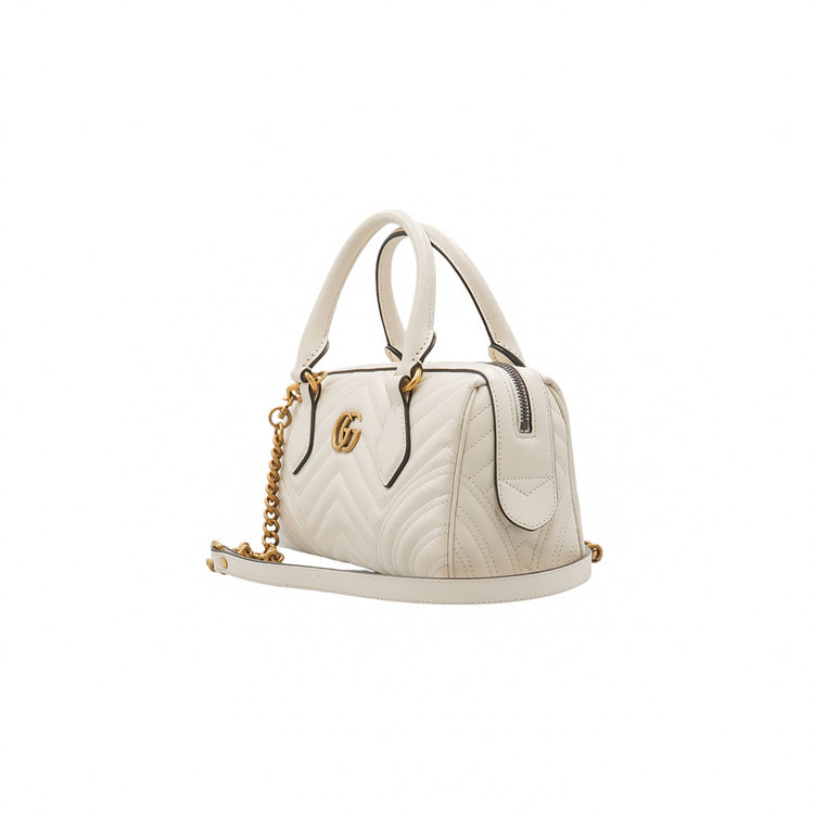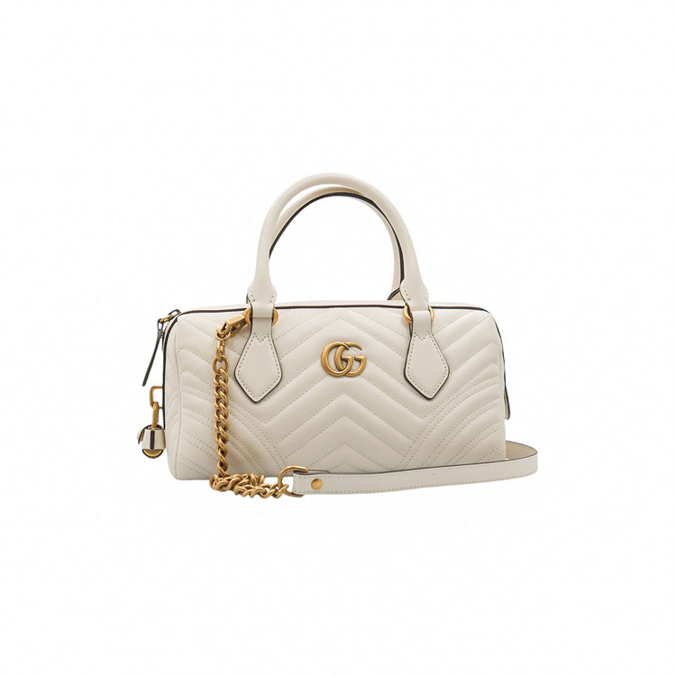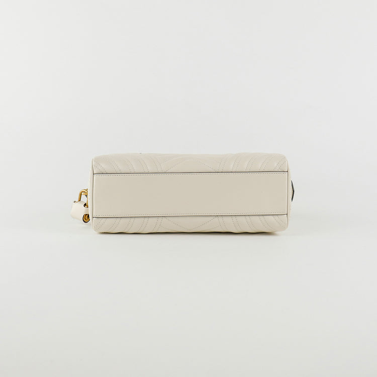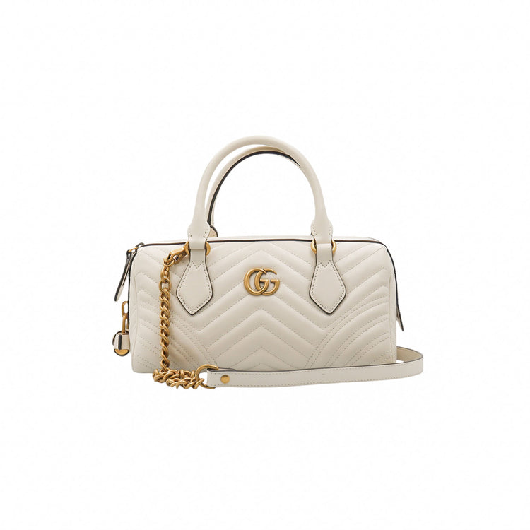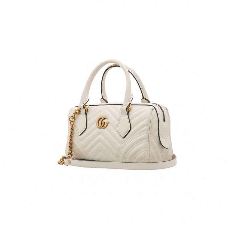 Pequeño bolso Gucci de la línea Marmont confeccionado en piel acolchada color beige, decorado con el emblemático logo GG y herrajes en color dorado, forro interno con acabado tipo ante, cuenta con 2 asas rígidas y correa extraíble para llevar al hombro o cruzada,