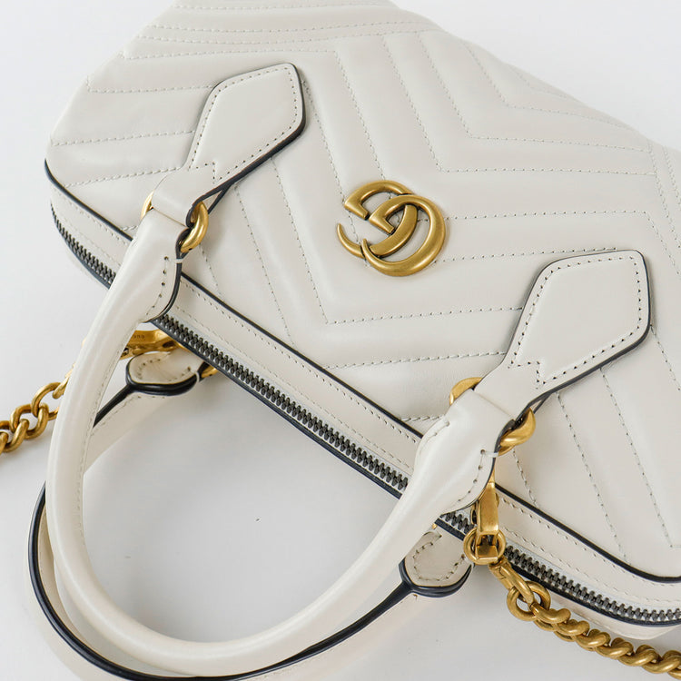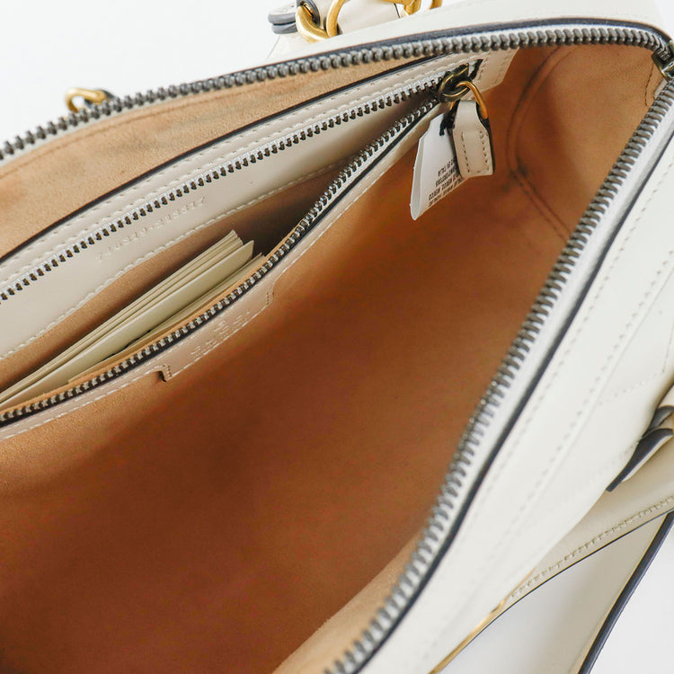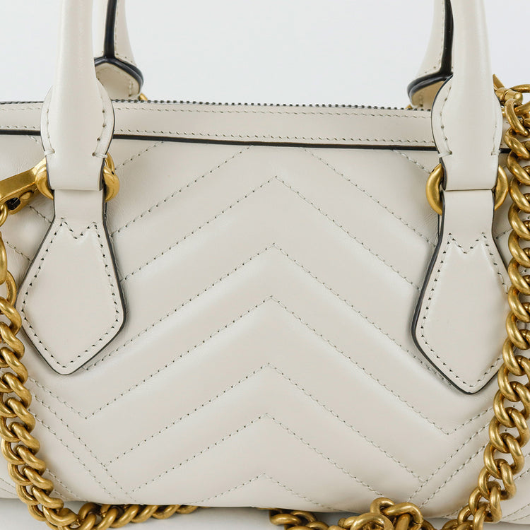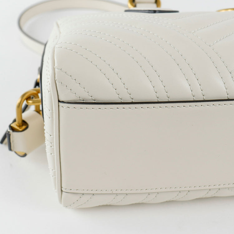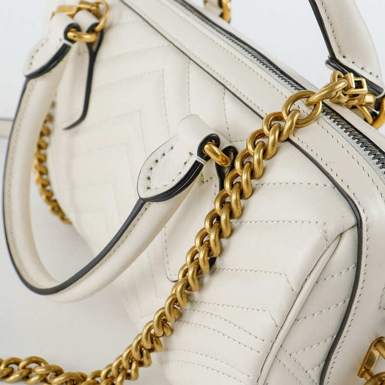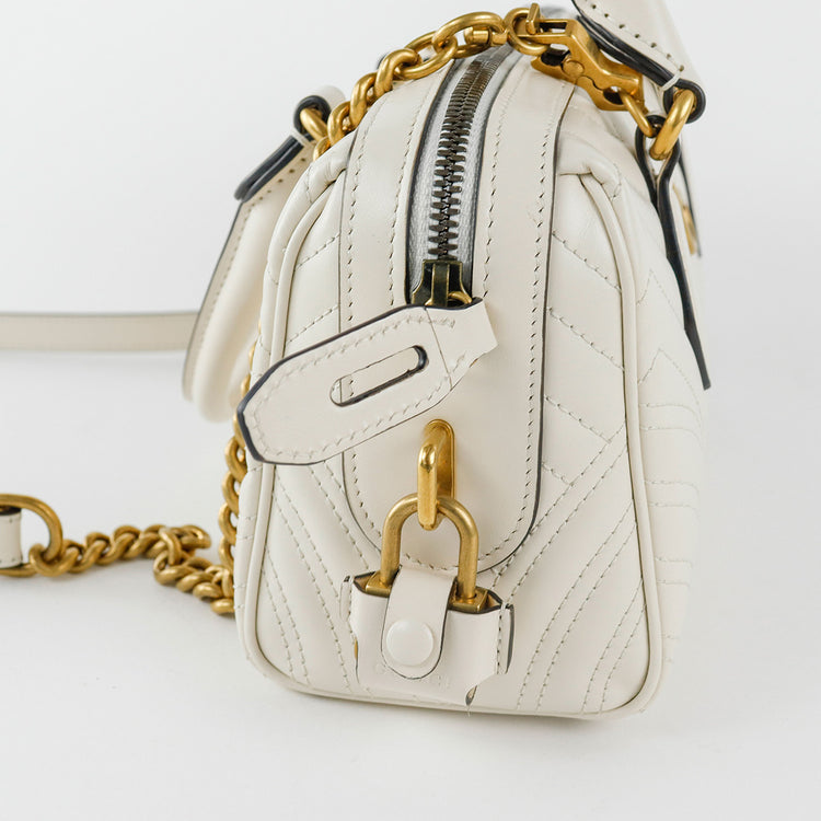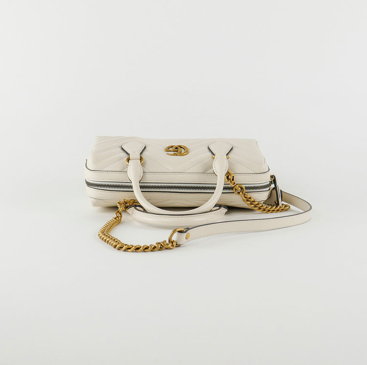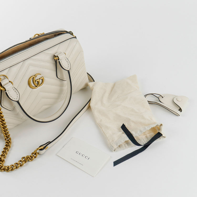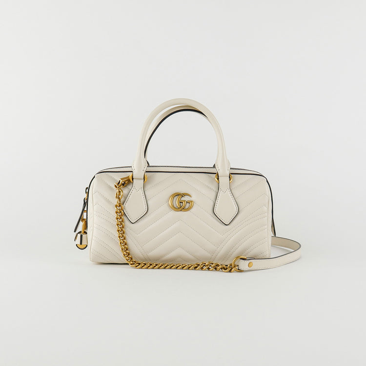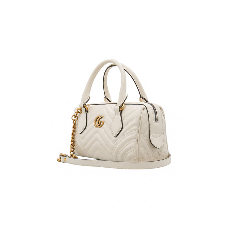 Pequeño bolso Gucci de la línea Marmont confeccionado en piel acolchada color beige, decorado con el emblemático logo GG y herrajes en color dorado, forro interno con acabado tipo ante, cuenta con 2 asas rígidas y correa extraíble para llevar al hombro o cruzada,