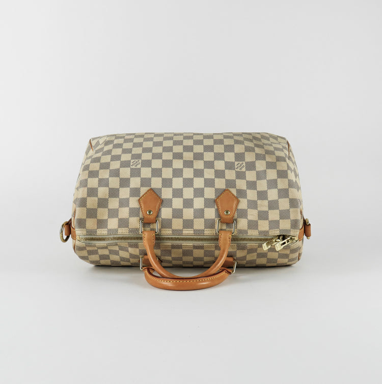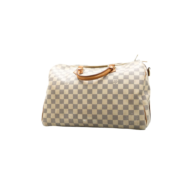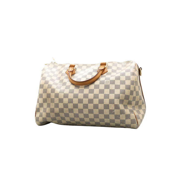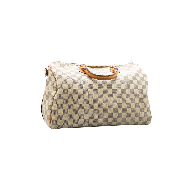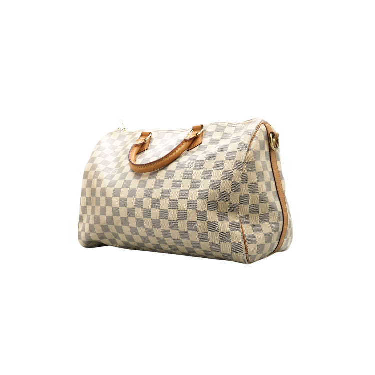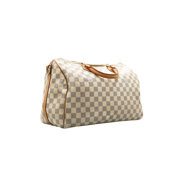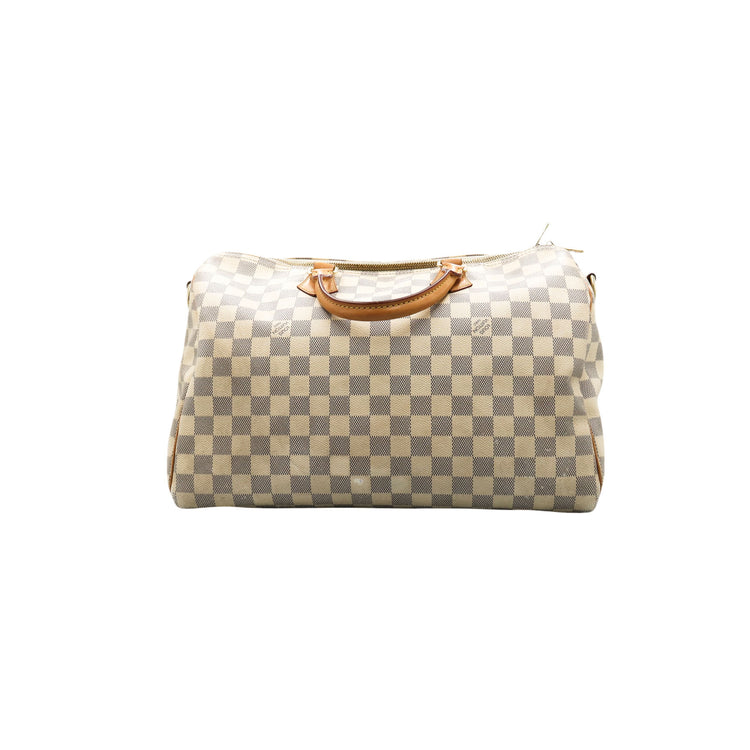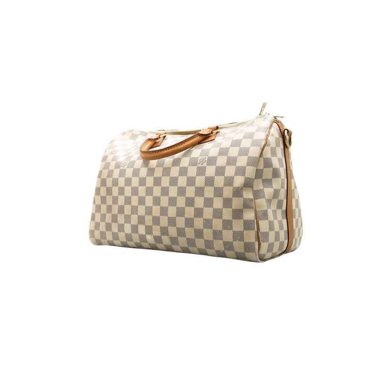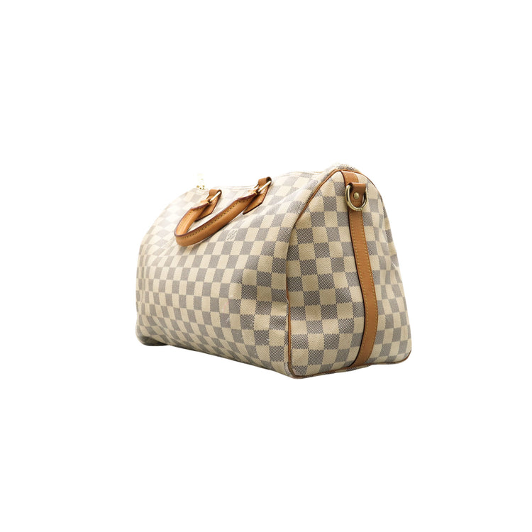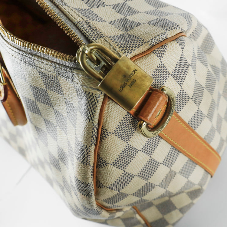 Bolso Louis Vuitton Speedy 35, confeccionado en lona Damier Azur, con asas y detalles en cuero natural, interior en color beige poco sucio, con candado sin llave, detalles en la superficie (rayones de pluma), no incluye strap.