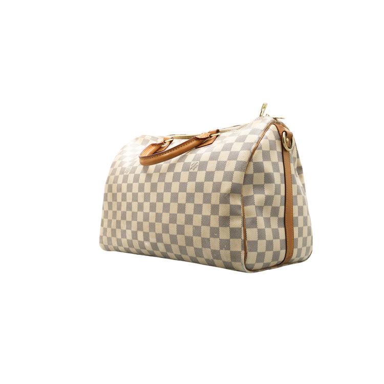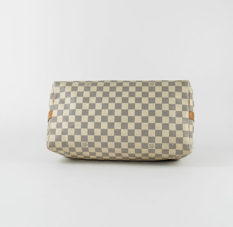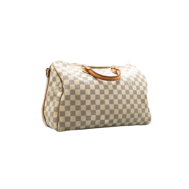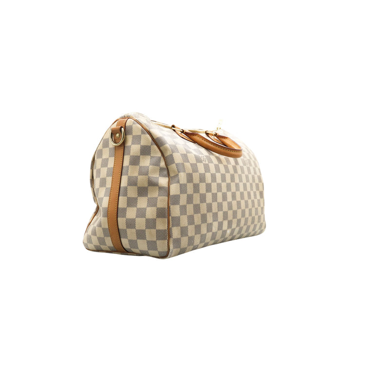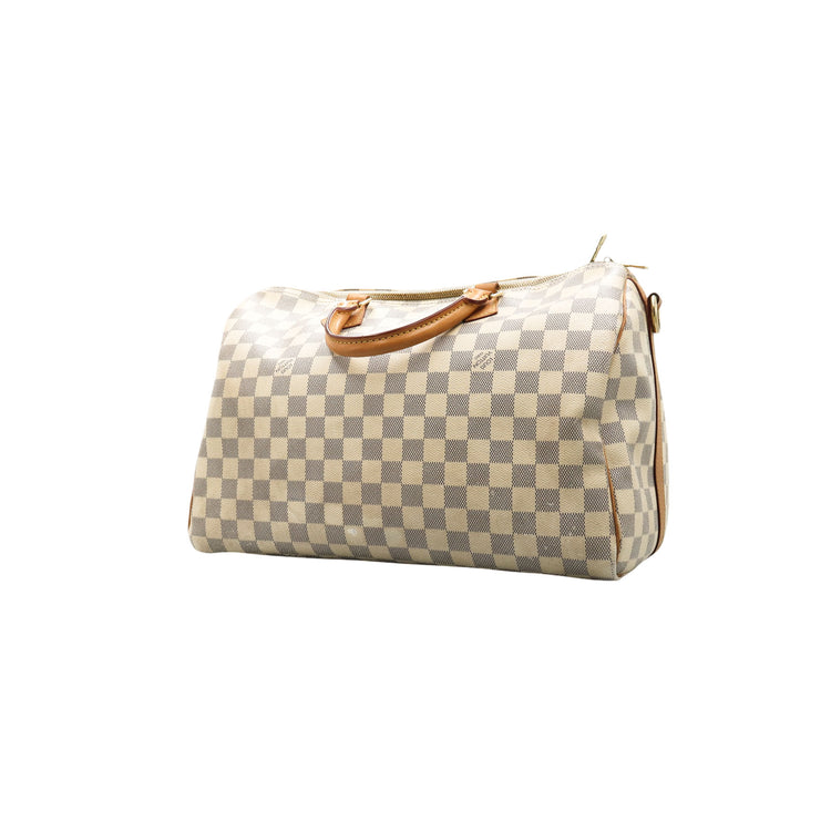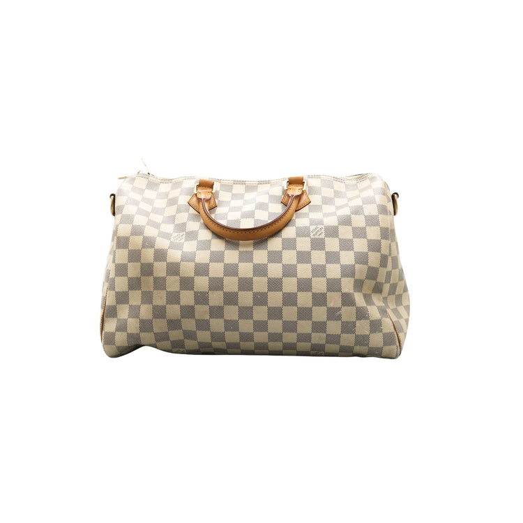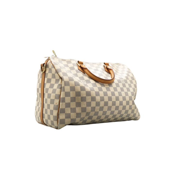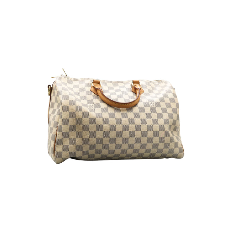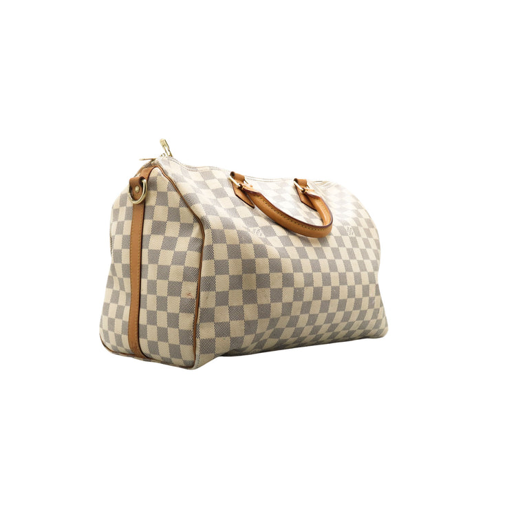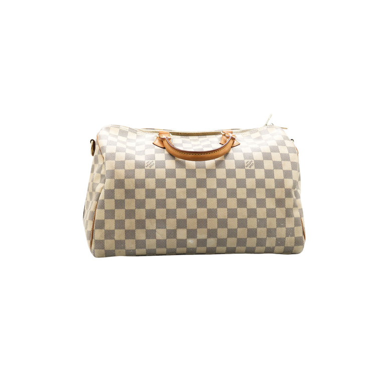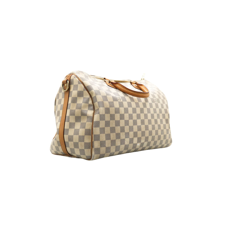 Bolso Louis Vuitton Speedy 35, confeccionado en lona Damier Azur, con asas y detalles en cuero natural, interior en color beige poco sucio, con candado sin llave, detalles en la superficie (rayones de pluma), no incluye strap.