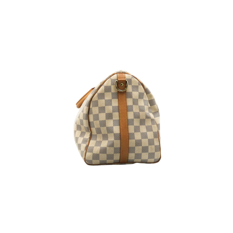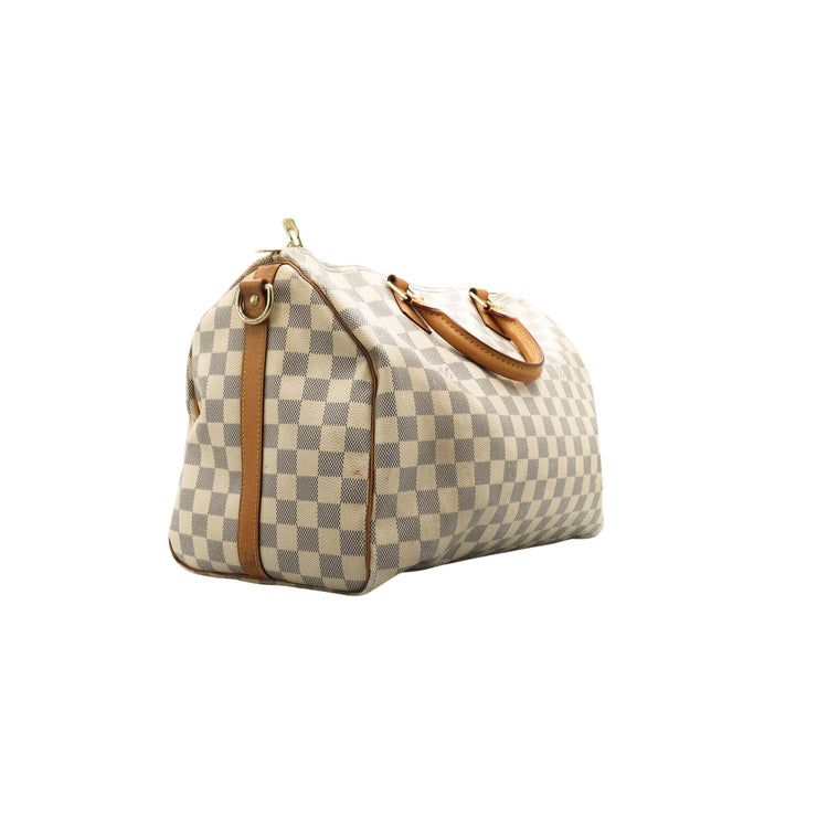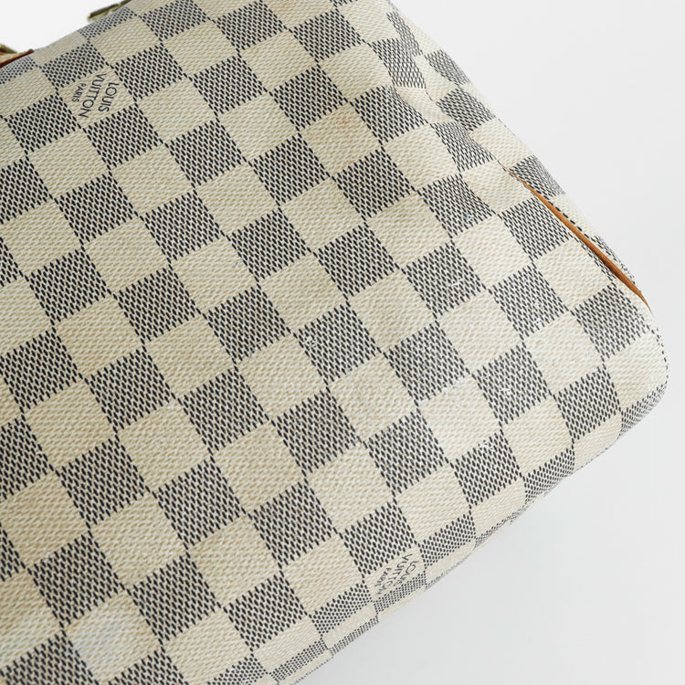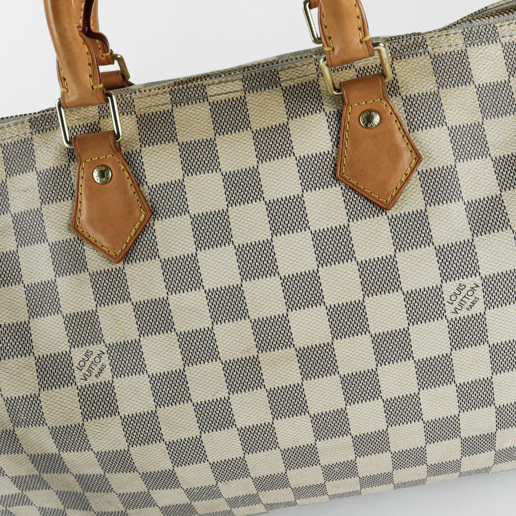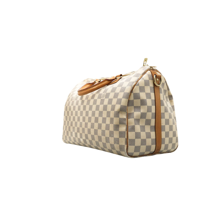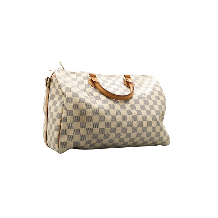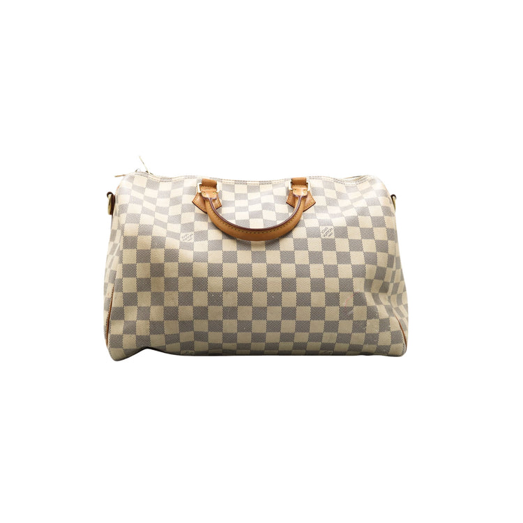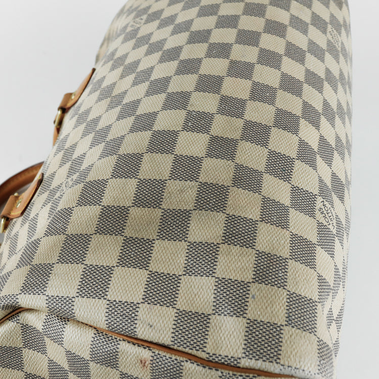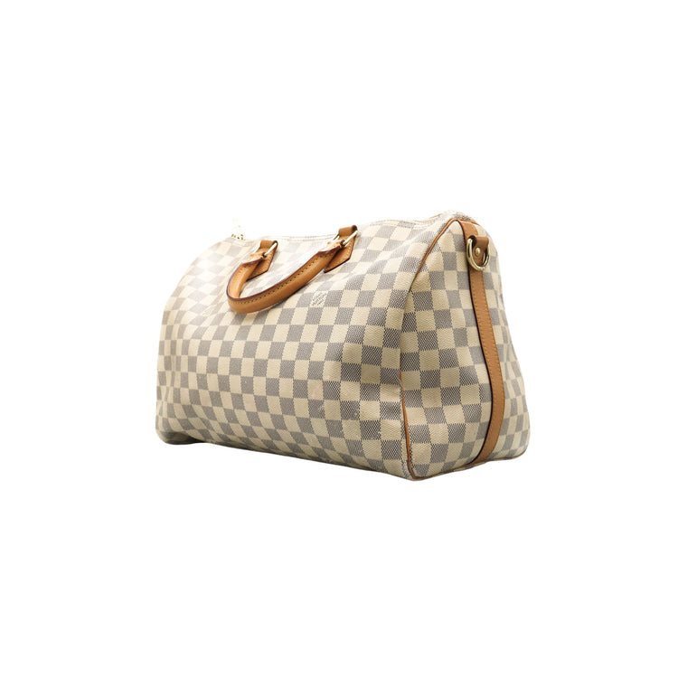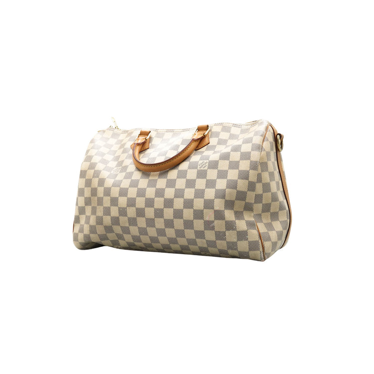 Bolso Louis Vuitton Speedy 35, confeccionado en lona Damier Azur, con asas y detalles en cuero natural, interior en color beige poco sucio, con candado sin llave, detalles en la superficie (rayones de pluma), no incluye strap.