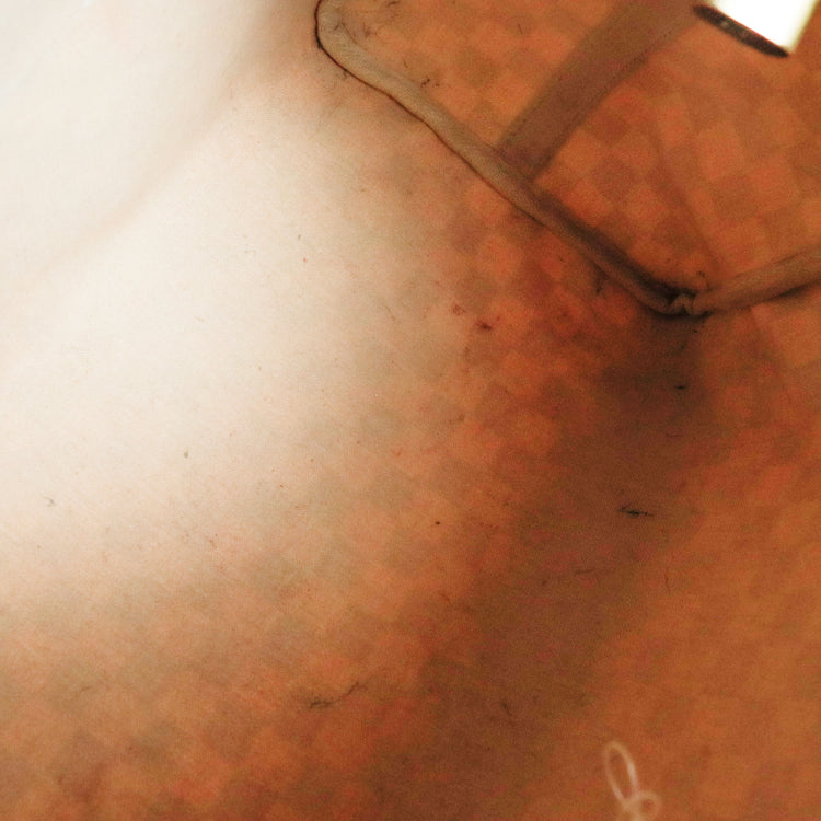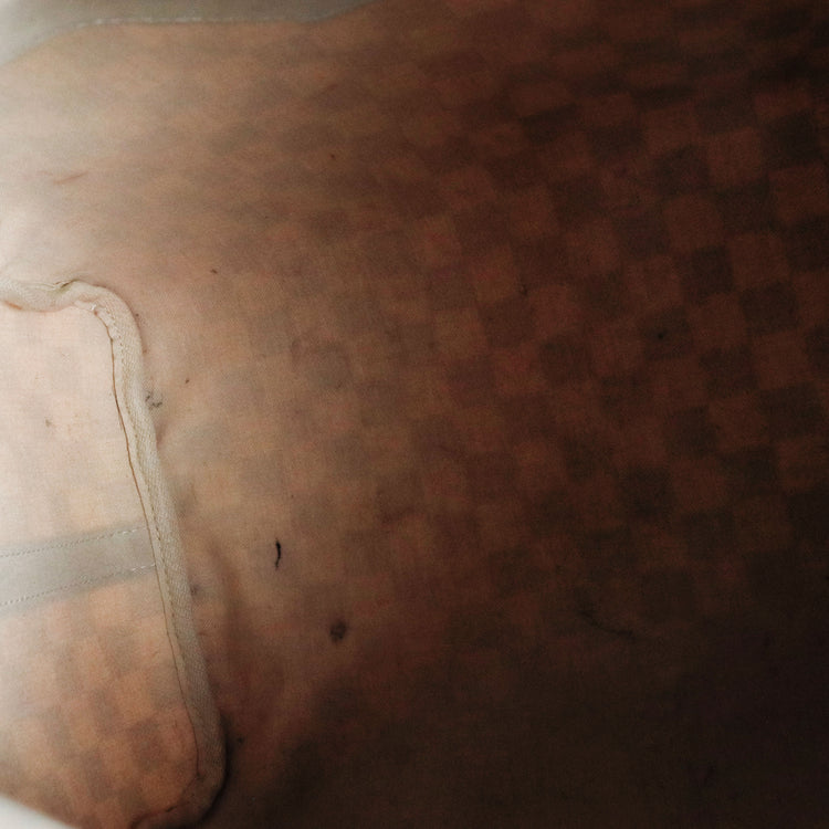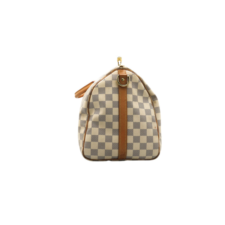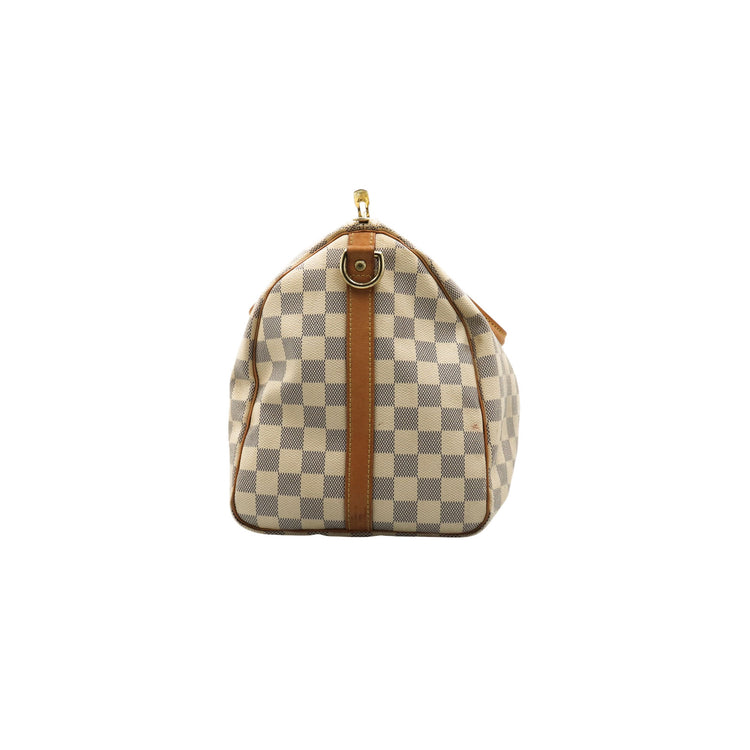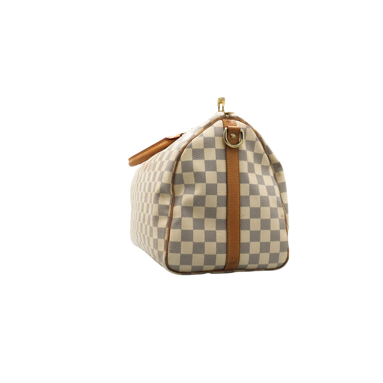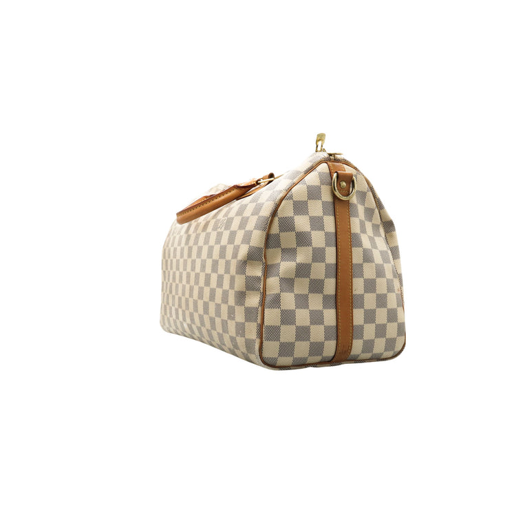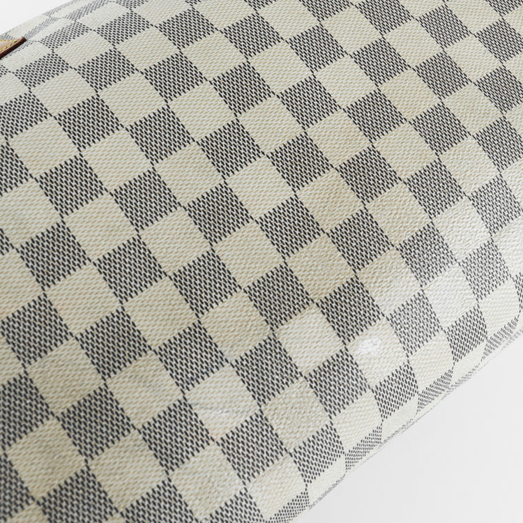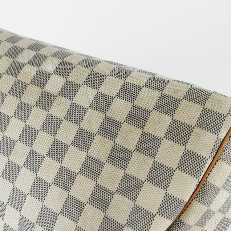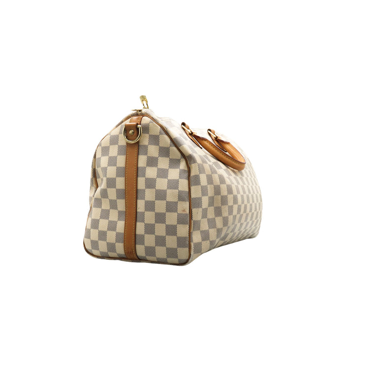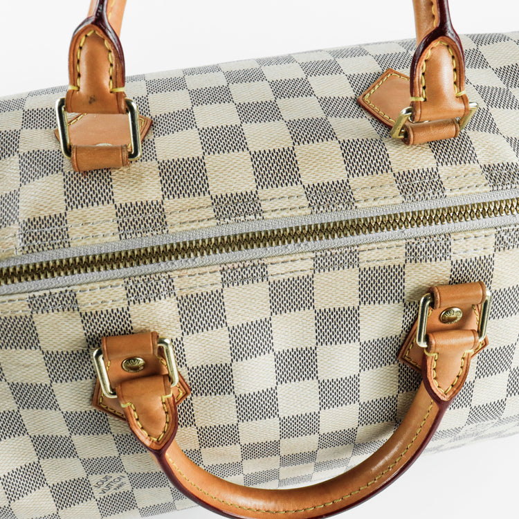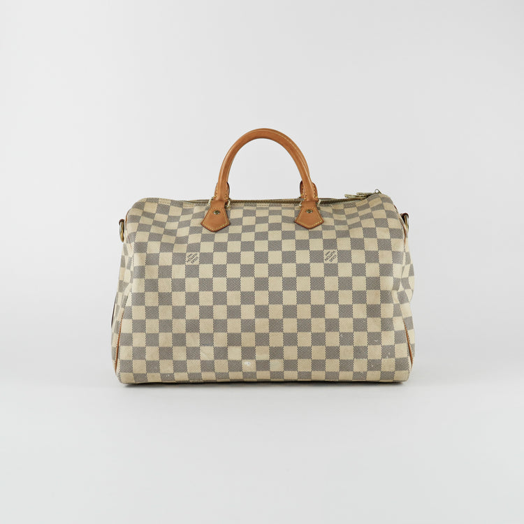 Bolso Louis Vuitton Speedy 35, confeccionado en lona Damier Azur, con asas y detalles en cuero natural, interior en color beige poco sucio, con candado sin llave, detalles en la superficie (rayones de pluma), no incluye strap.