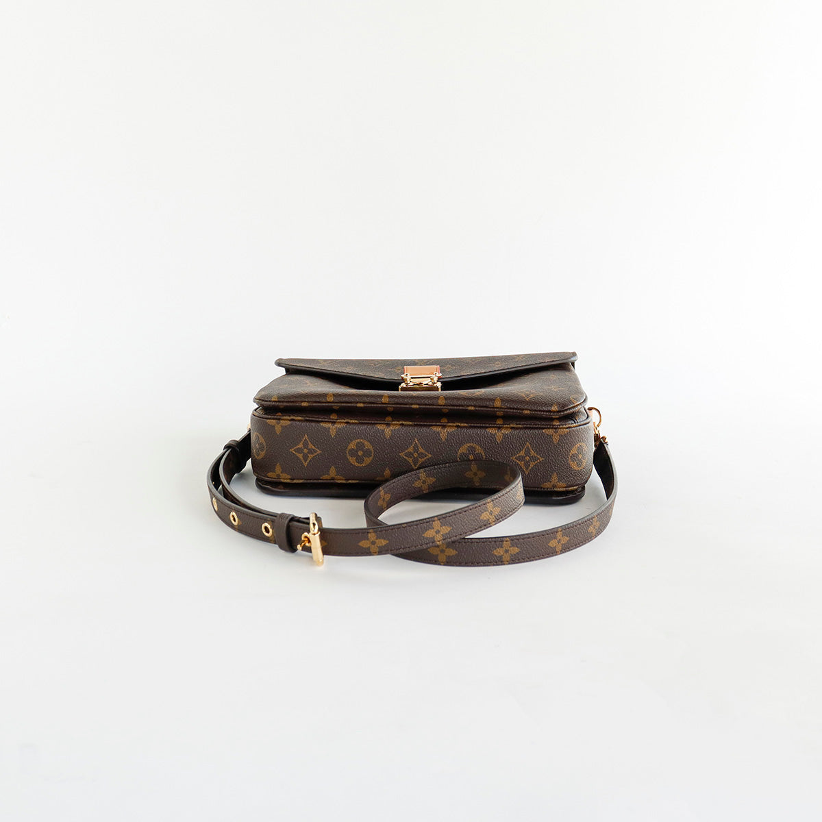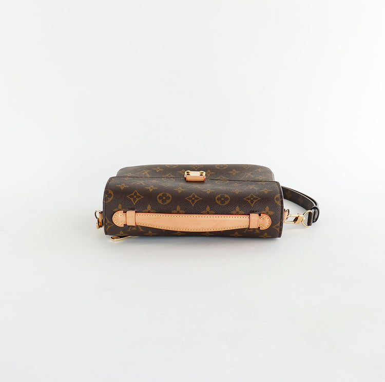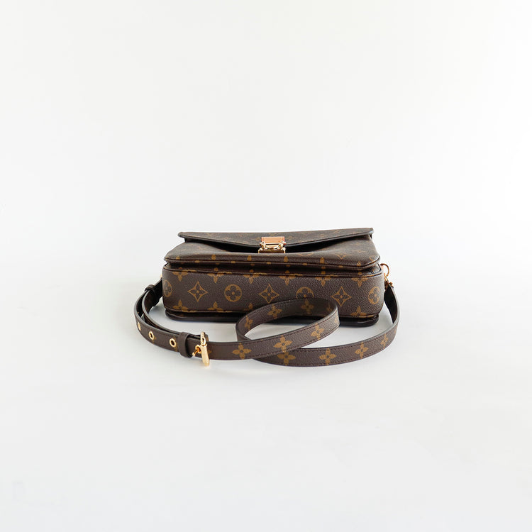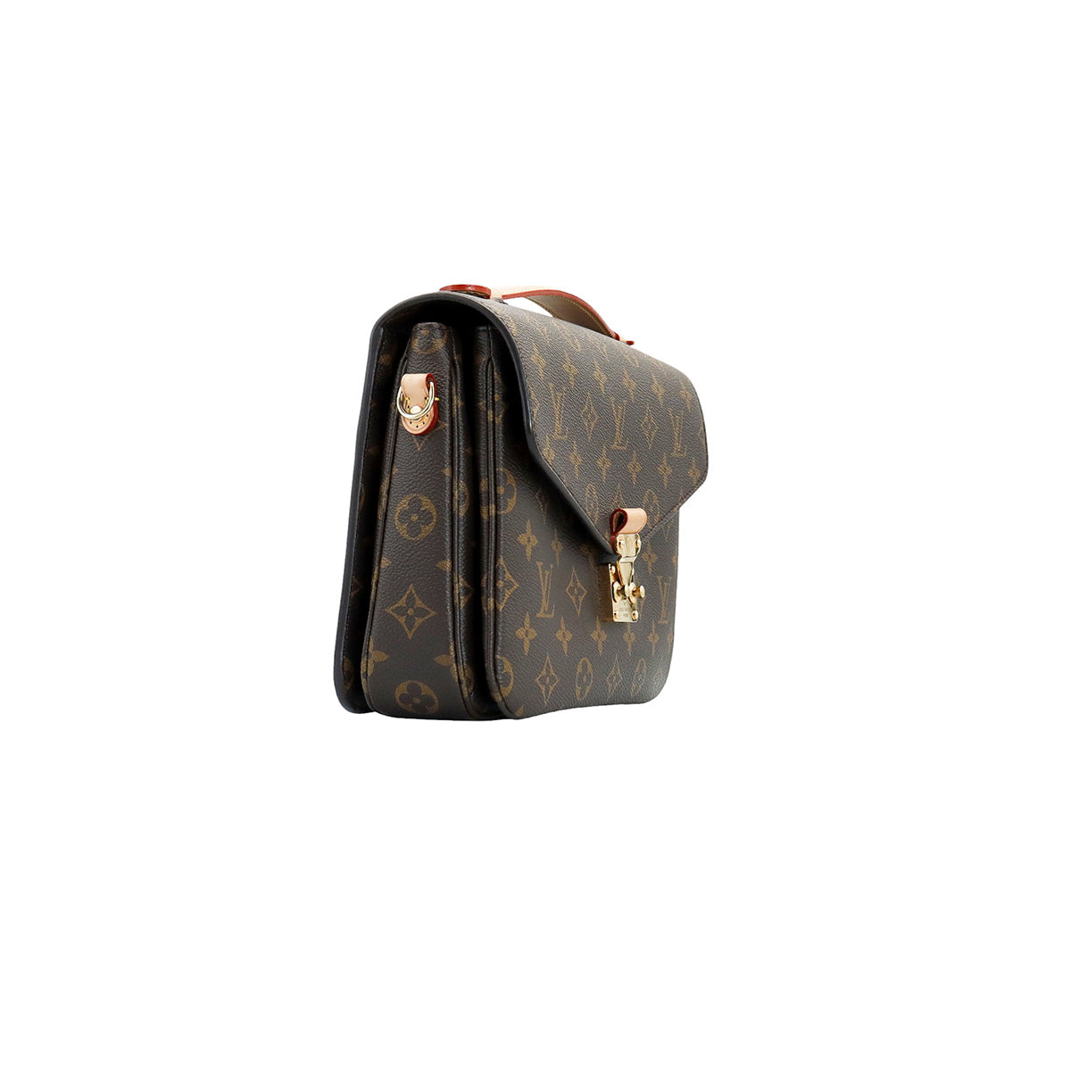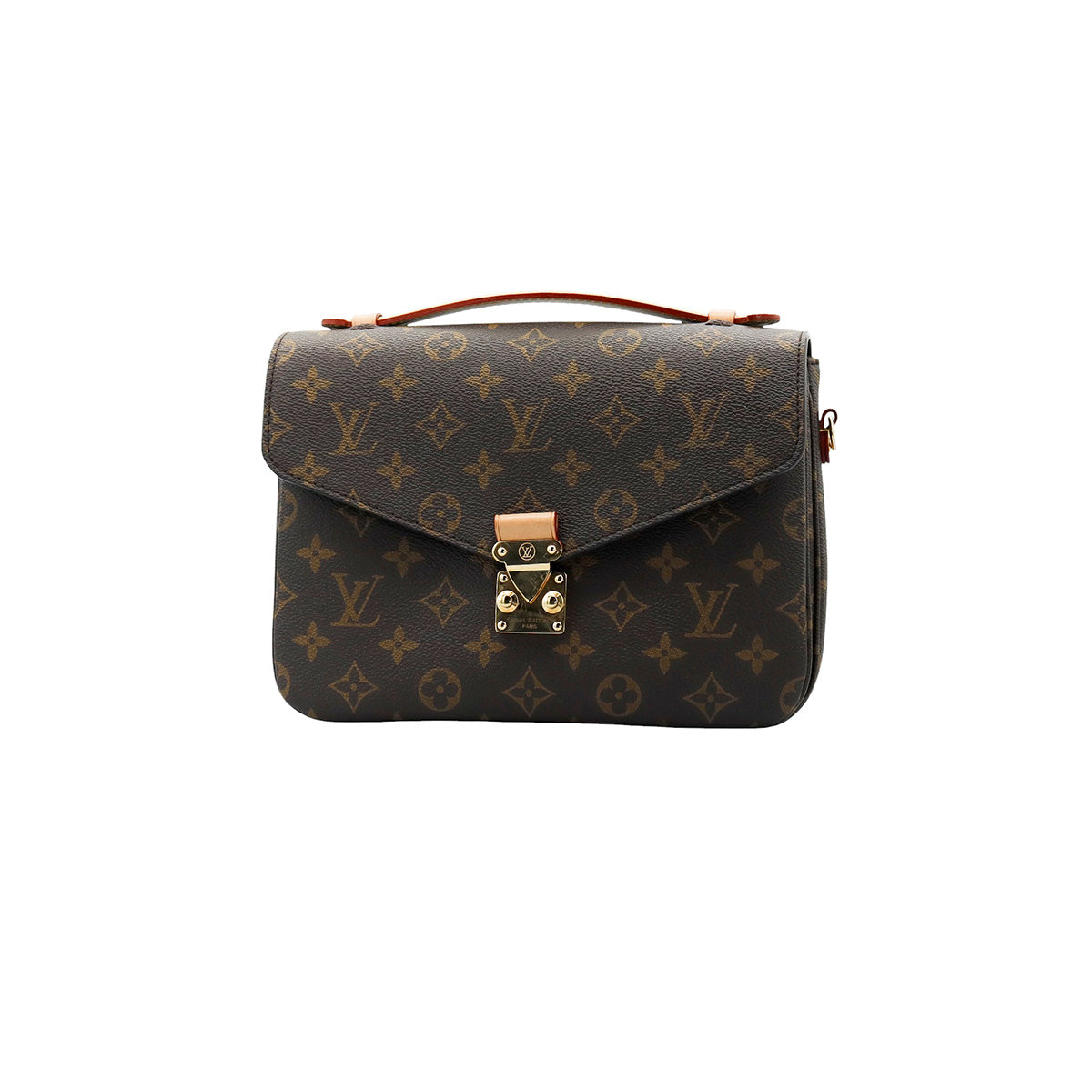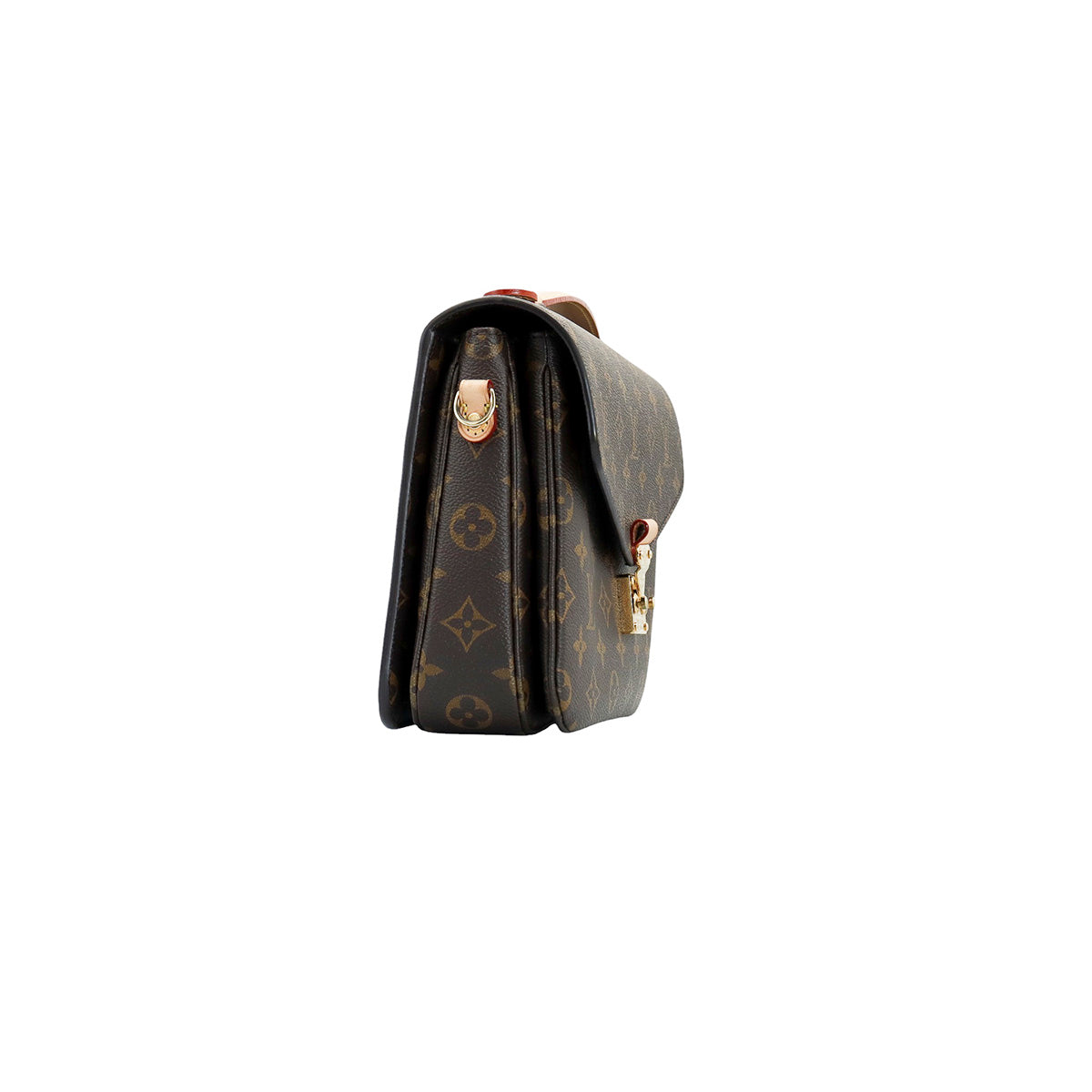 Bolso Louis Vuitton Pochette Metis, confeccionado en lona monogram, con strap desmontable, forro interno en alcántara color café, herrajes en color dorado. Poco sucia por dentro, herrajes con leves rayones poco visibles.