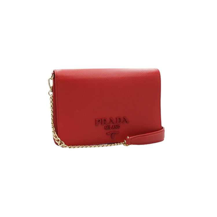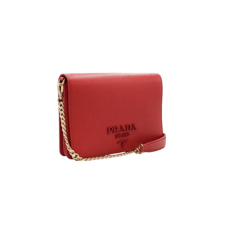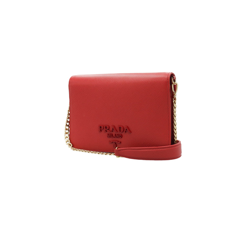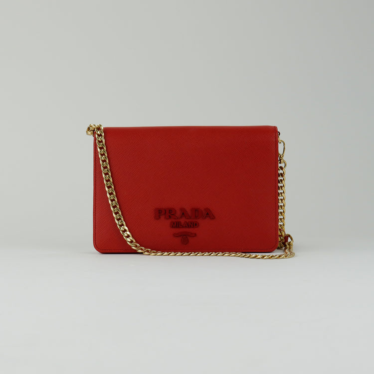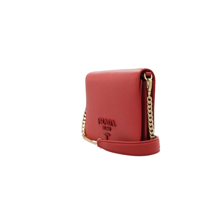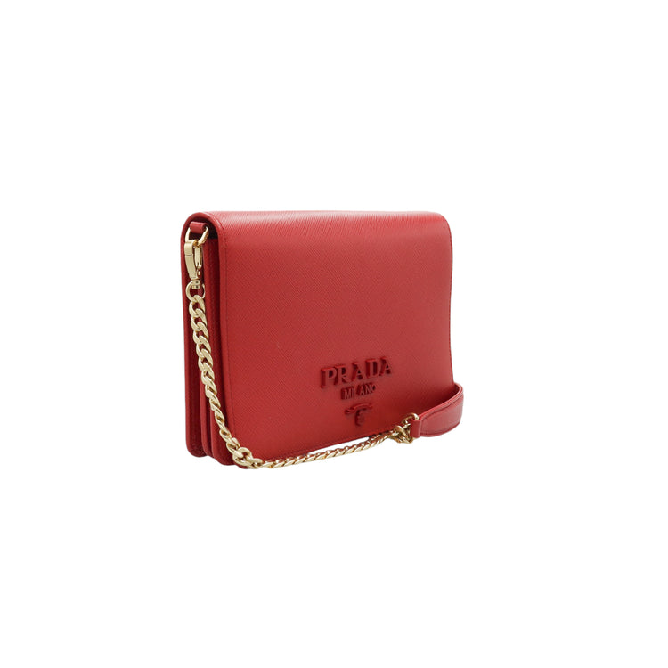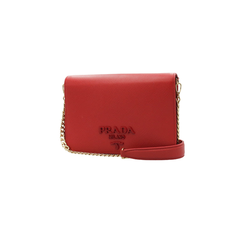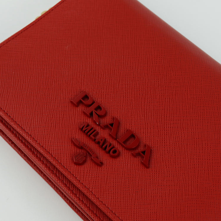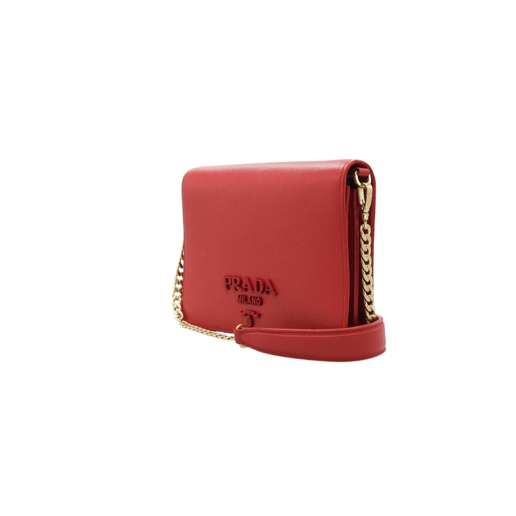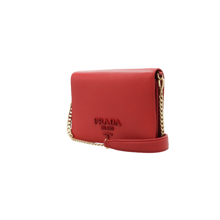 Bolso Prada de la colección Monochrome Wallet on Chain, confeccionado en piel Saffiano color rojo, con herrajes color dorado, interior en piel color negro con ranuras para tarjetas y cierre de cremallera, strap metálico con piel.