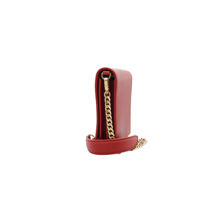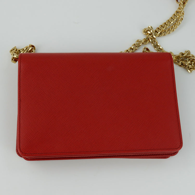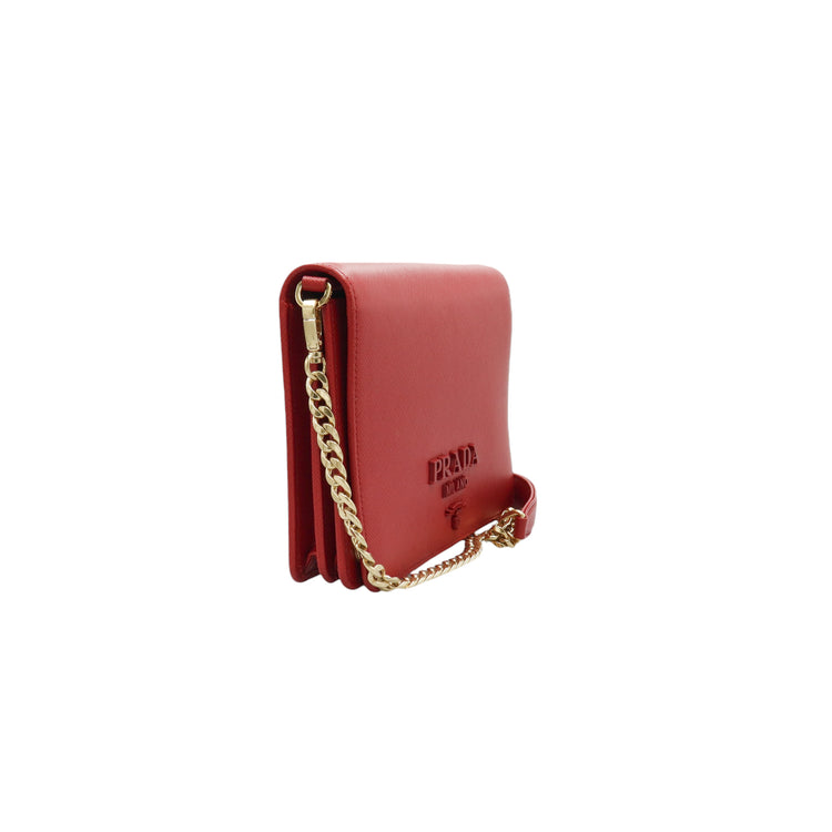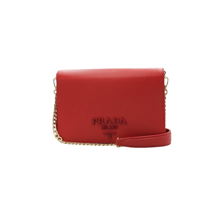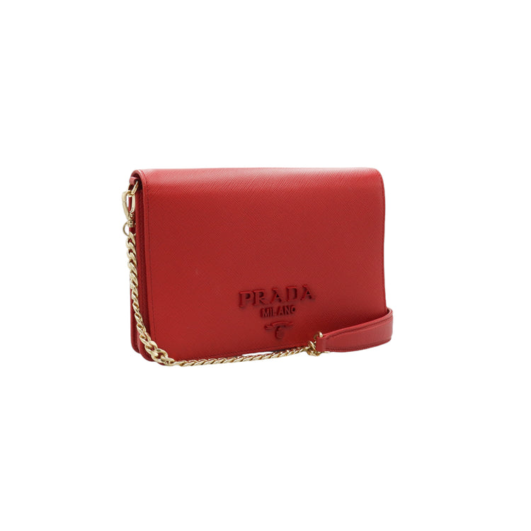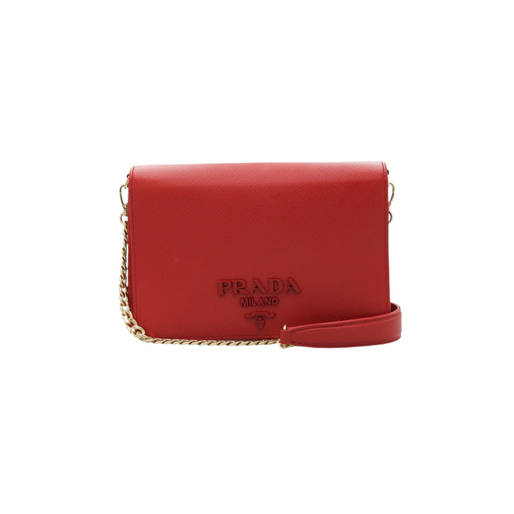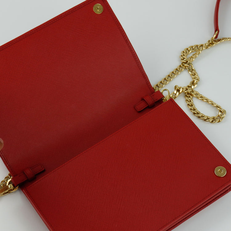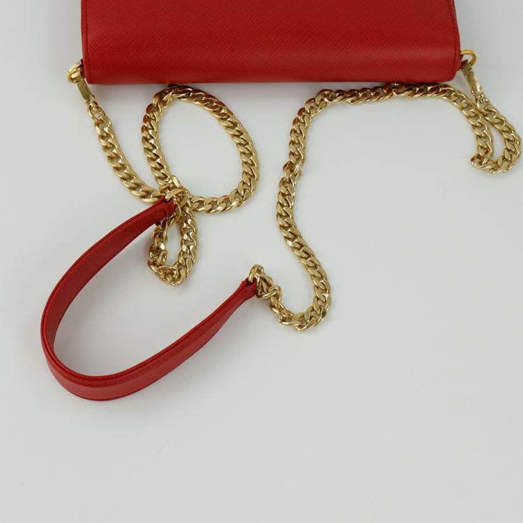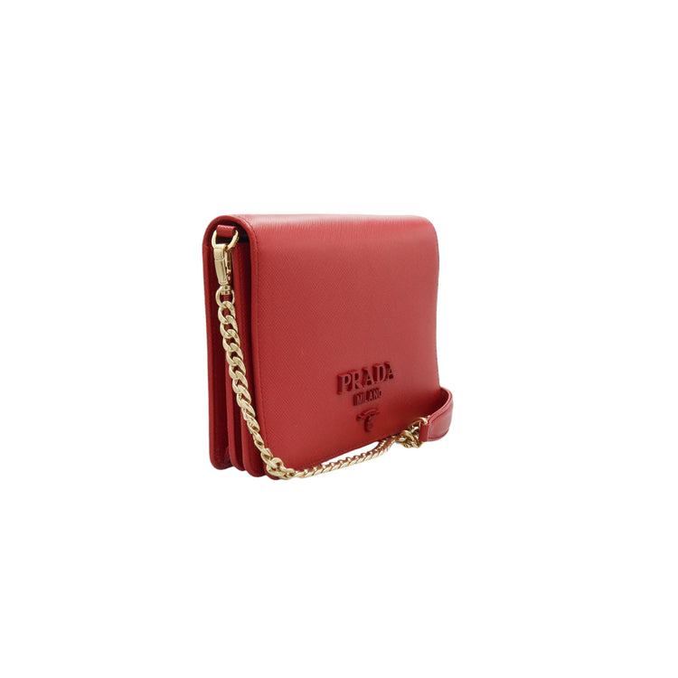 Bolso Prada de la colección Monochrome Wallet on Chain, confeccionado en piel Saffiano color rojo, con herrajes color dorado, interior en piel color negro con ranuras para tarjetas y cierre de cremallera, strap metálico con piel.