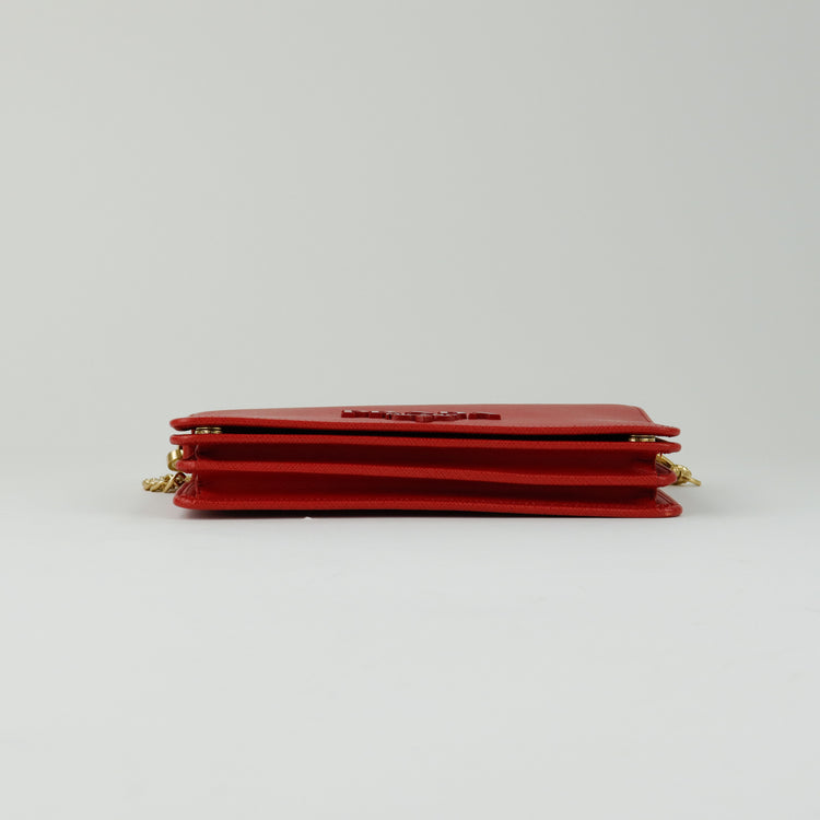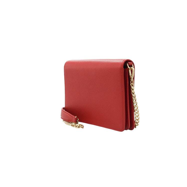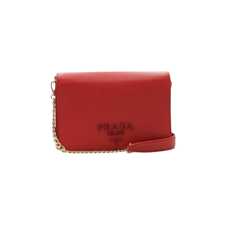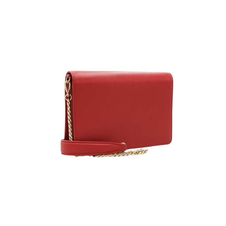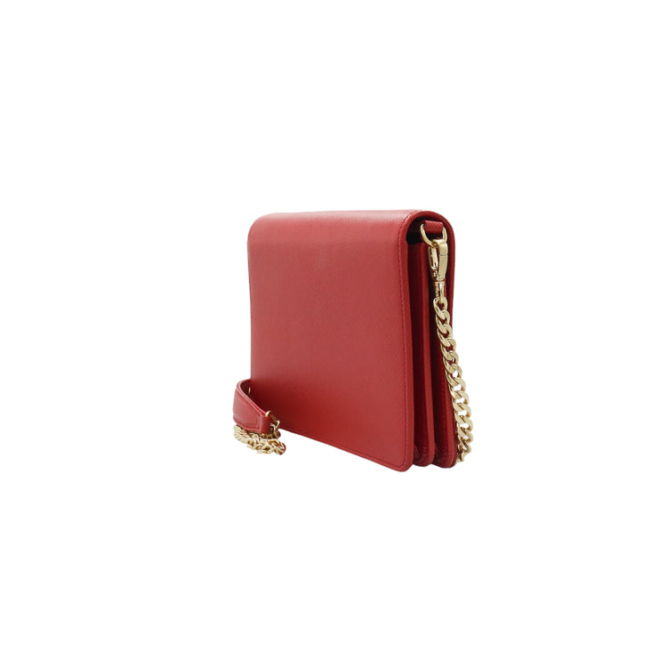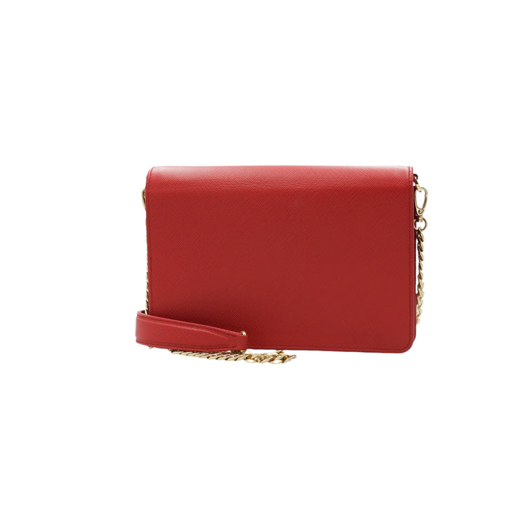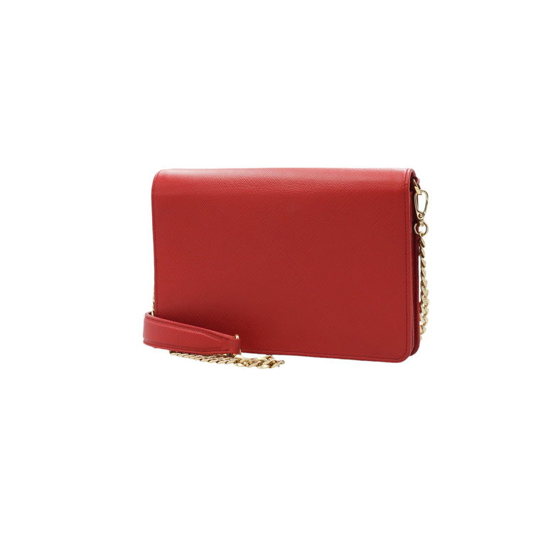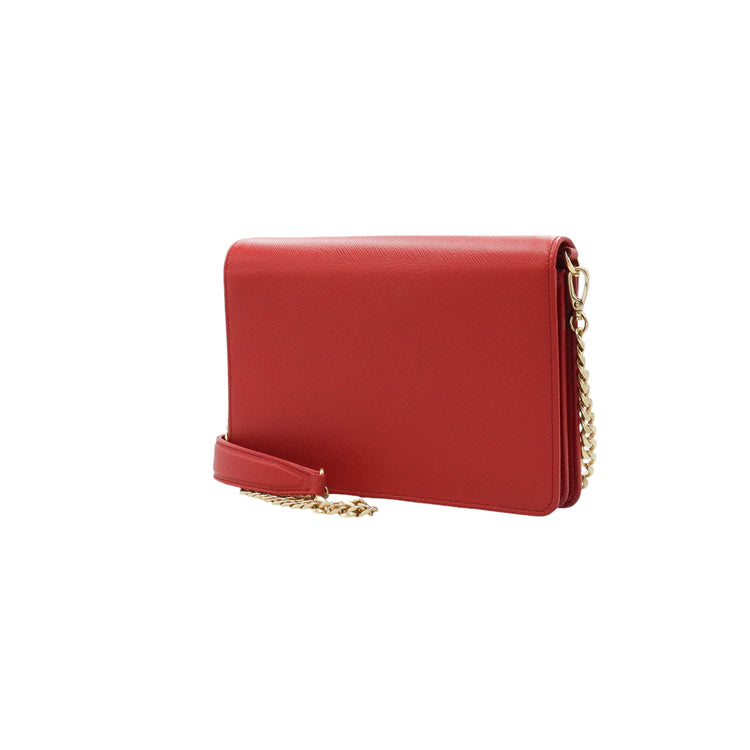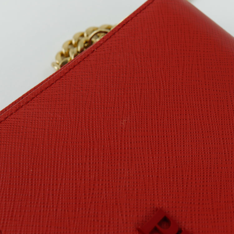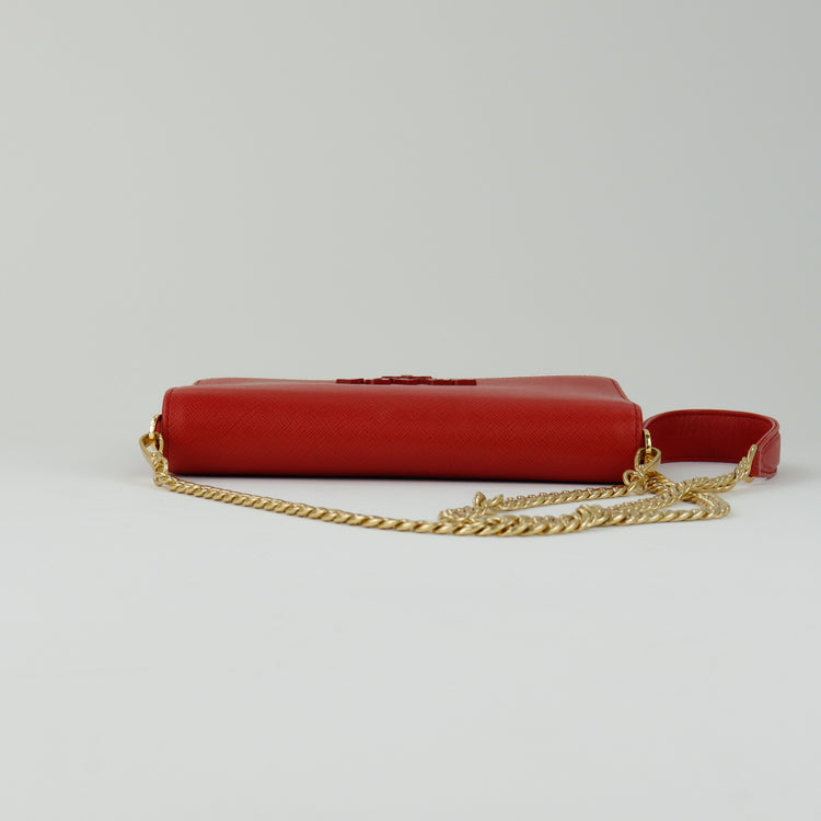 Bolso Prada de la colección Monochrome Wallet on Chain, confeccionado en piel Saffiano color rojo, con herrajes color dorado, interior en piel color negro con ranuras para tarjetas y cierre de cremallera, strap metálico con piel.