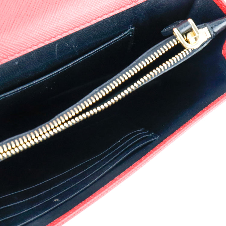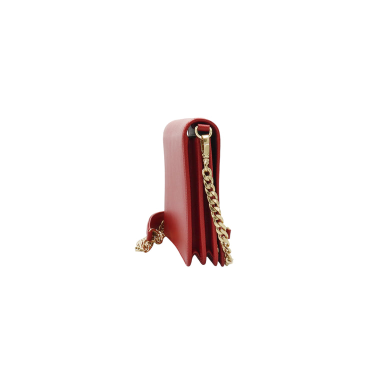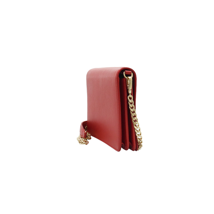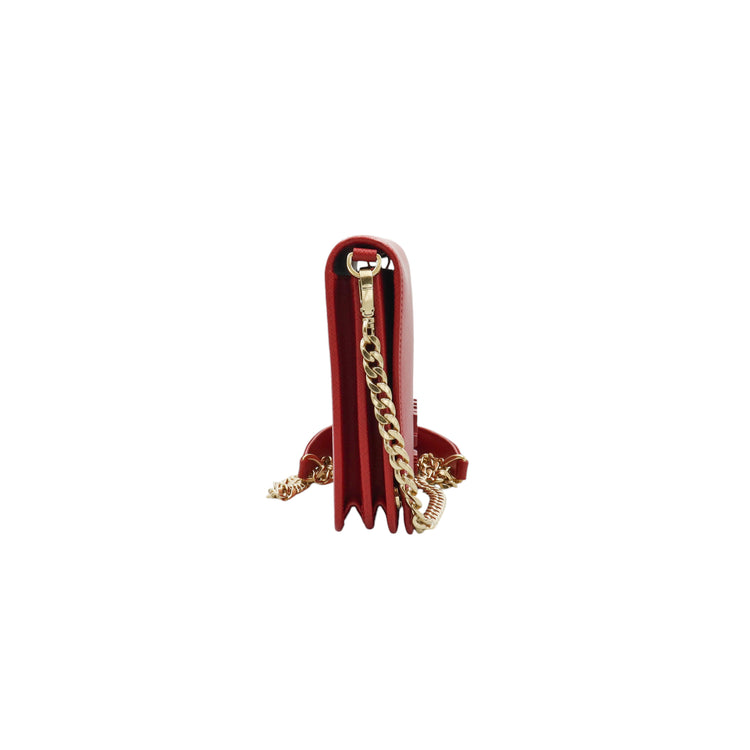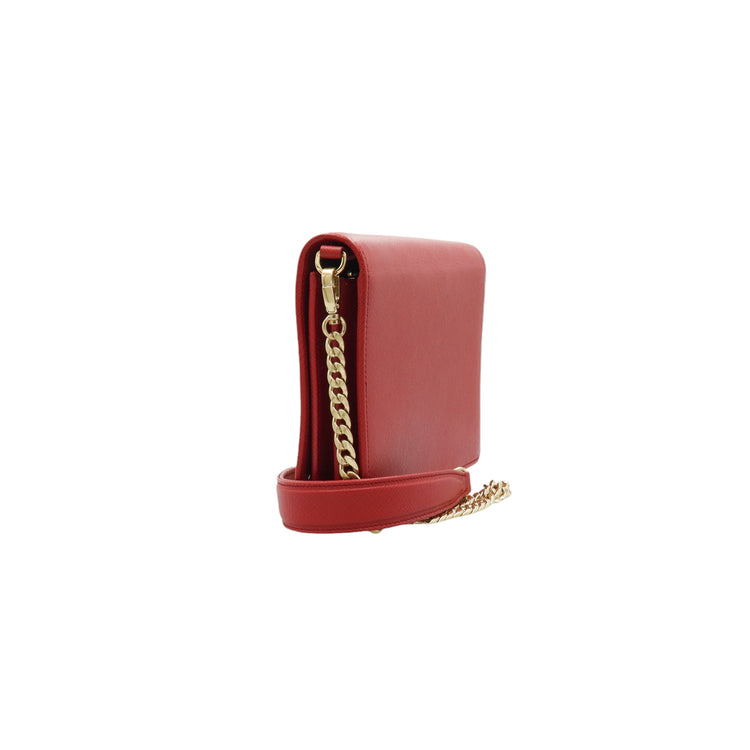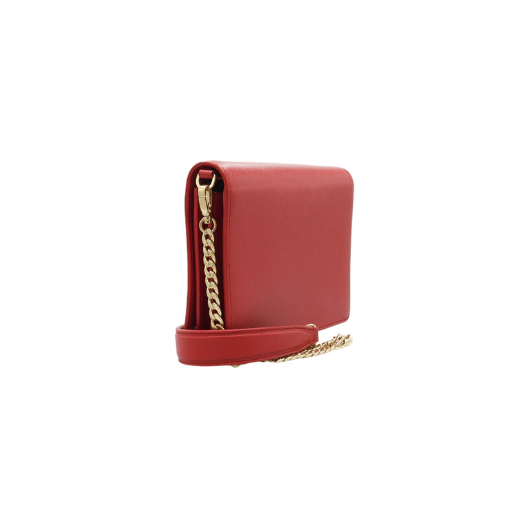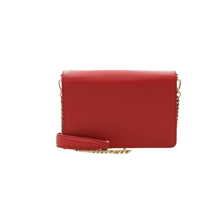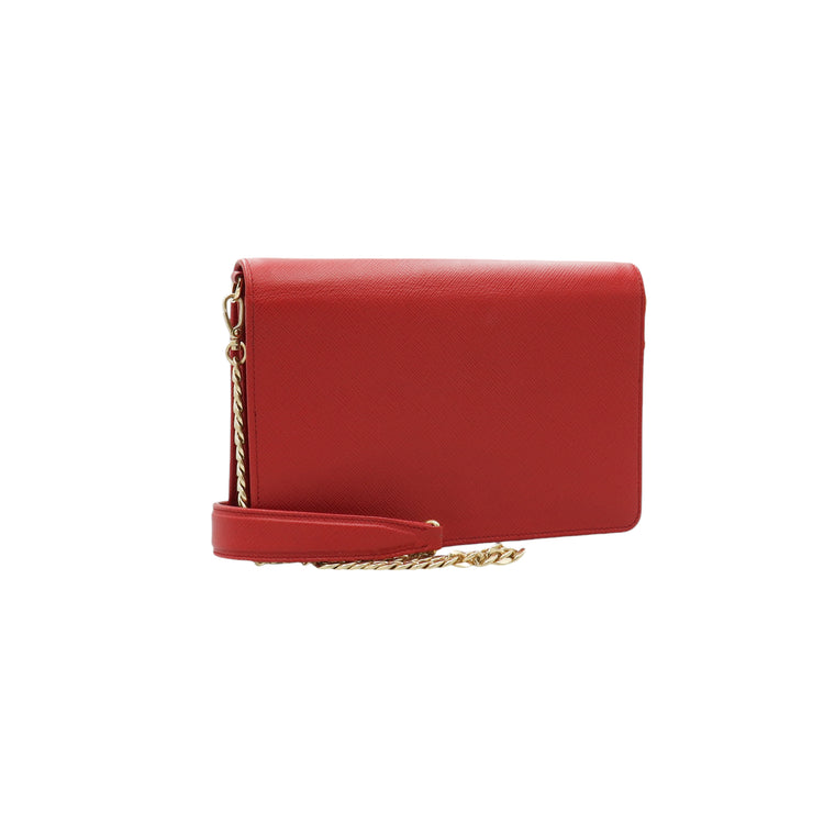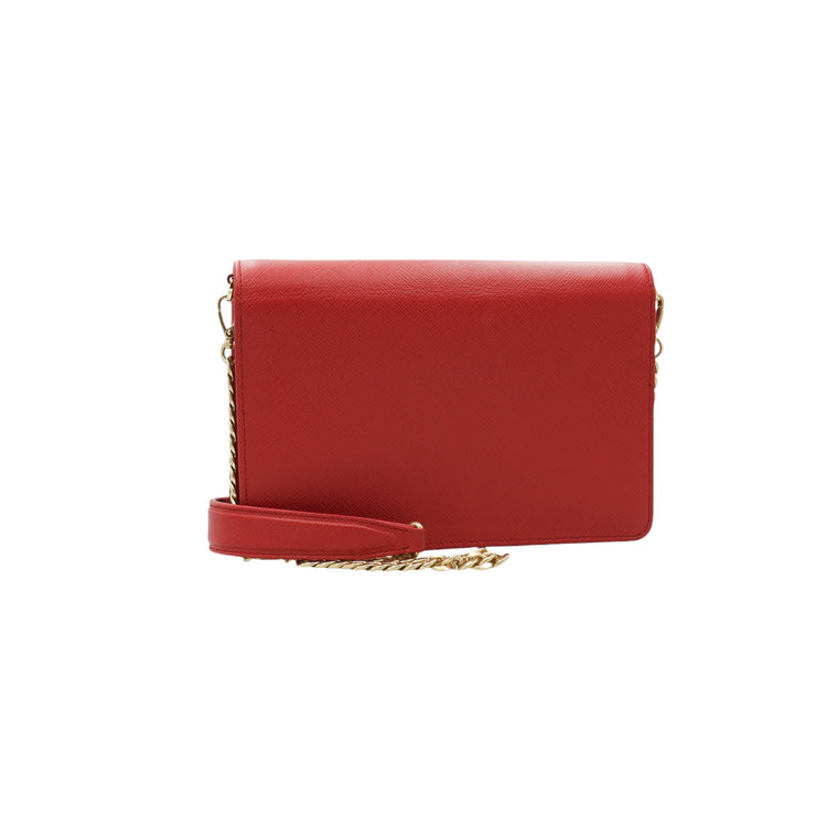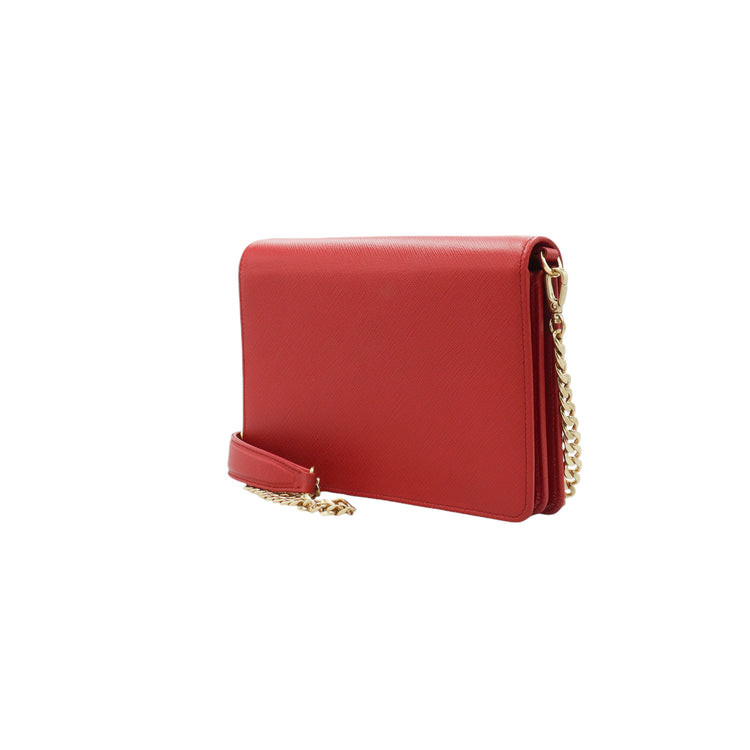 Bolso Prada de la colección Monochrome Wallet on Chain, confeccionado en piel Saffiano color rojo, con herrajes color dorado, interior en piel color negro con ranuras para tarjetas y cierre de cremallera, strap metálico con piel.