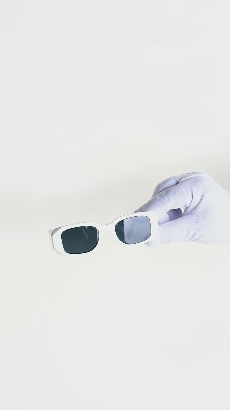 Gafas de sol Prada Catwalk SPR17W en acetato blanco con micas humo y estructura interna de acero.